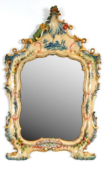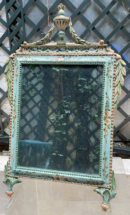 A third mirror (3) is most unusual, made still before the neoclassical style became the norm, this avant-garde piece was lacquered in the most popular Venetian sky blue and decorated with floral designs. This mirror has an elaborate openwork carving at the top but crowned with a carved wood vase, spilling garlands from the summit flowing down the outer sides of the mirror.