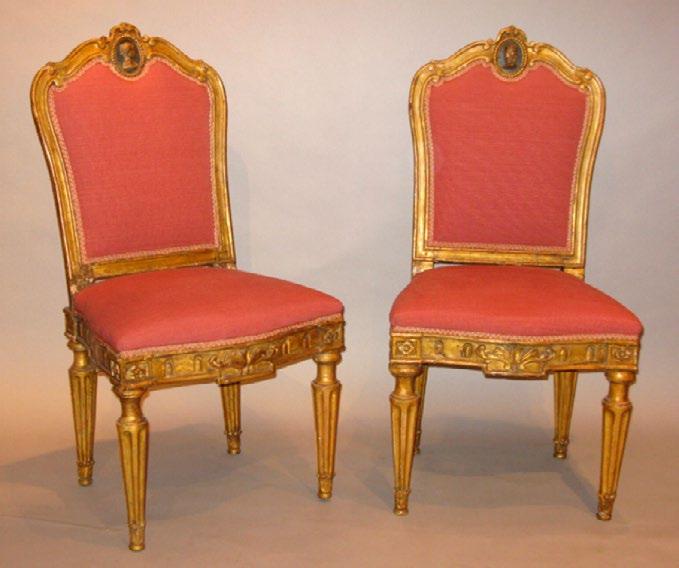 A pair of Roman circa 1770-1780 carved and with the original gilding impressive side chairs. These are of special interest as they are most definitely a pair as one has a carved head of a man at its top and the other the head of a woman who are looking at each other.
