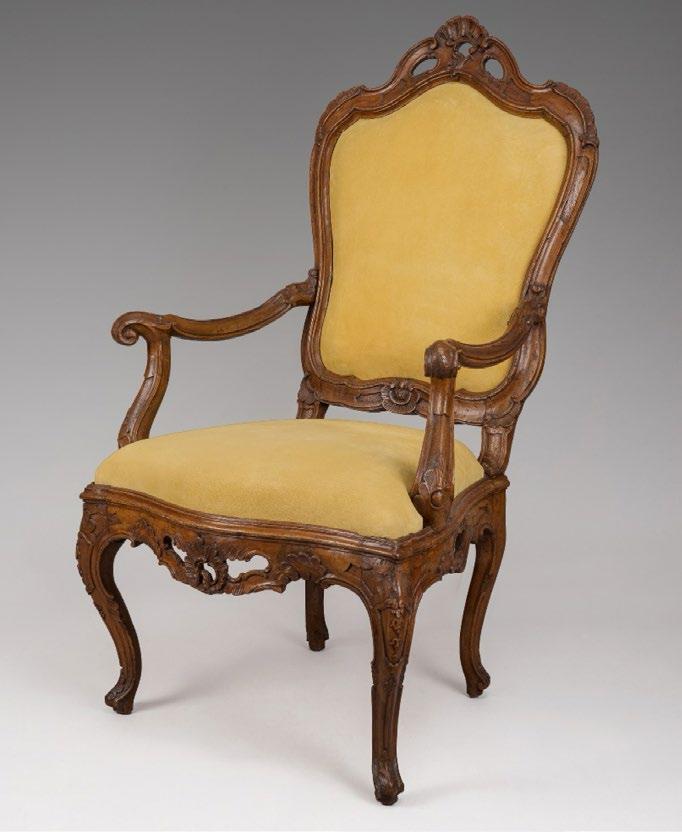 A large walnut armchair with a cartoucheshaped back centered by open work carving on the crest; elegant out swept armrests over a tight seat with a shaped apron with open work carving on cabriole legs on scrolled feet.