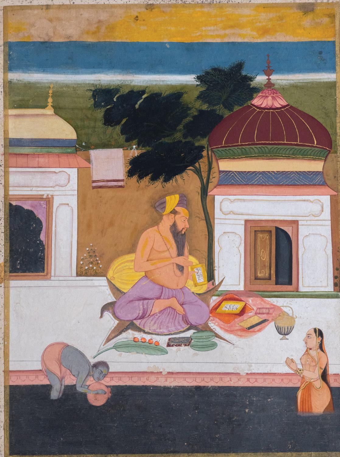 The present painting is attributed to the famous, yet elusive artist, Pandit Seu. The honorific title ‘Pandit’ probably denotes that the family was originally of the Brahamanical order. While it is speculated that he lived from 1680-1740, it is rare to find any dated or signed works by his hand, resulting in a small number of paintings attributed to him.