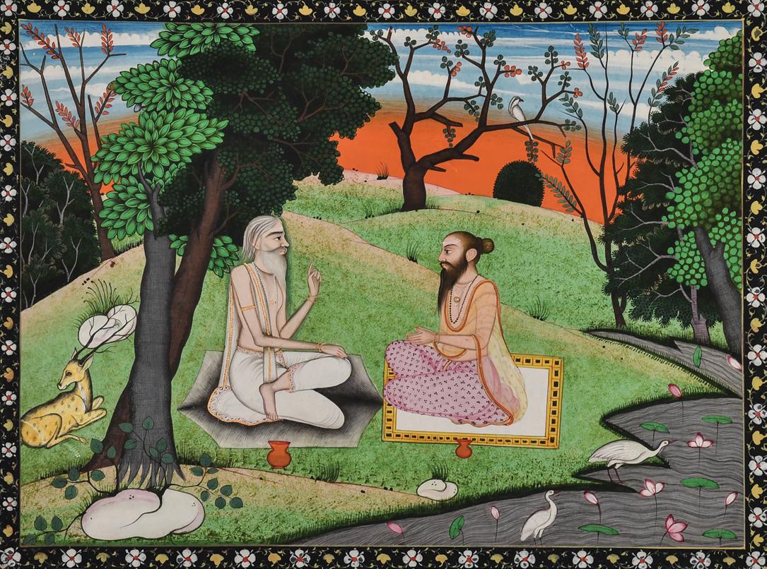 This fine painting depicting an unidentifiable maharishi appears to be from the same set as circa-1700 Bikaner painting of Prithvisimha at worship; a promised gift to the Norton Simon Museum published in Pratapaditya Pal’s Painted Poems, Pasadena, 2004, p. 18-19, cat. 74. As stated by Pal: “The painting is executed clearly, in a markedly different style from the pictures generally attributed to Bikaner early in the century. The pictorial touches evident in the handling of the internal space and the more realistic narrative strategies are derived ultimately from the Mughal tradition, which was introduced at the court, probably by Mughal-trained artists, during the reign of Karan Singh (1631-84). It was likely painted after the Karan Singh period” (see ibid). This stylistic approach is also reminiscent of that in the earlier Brahma and Narada paintings attributed to Bikaner, providing the possibility of an earlier date.