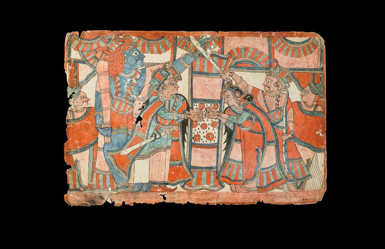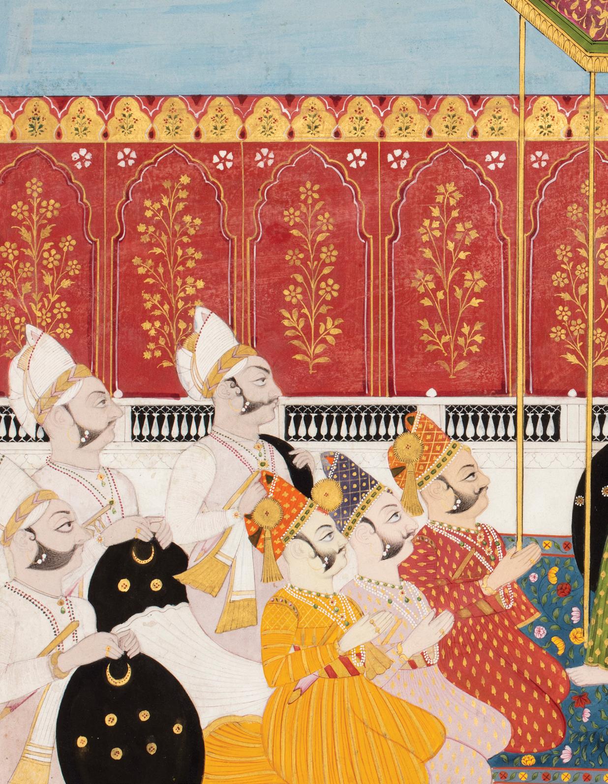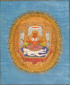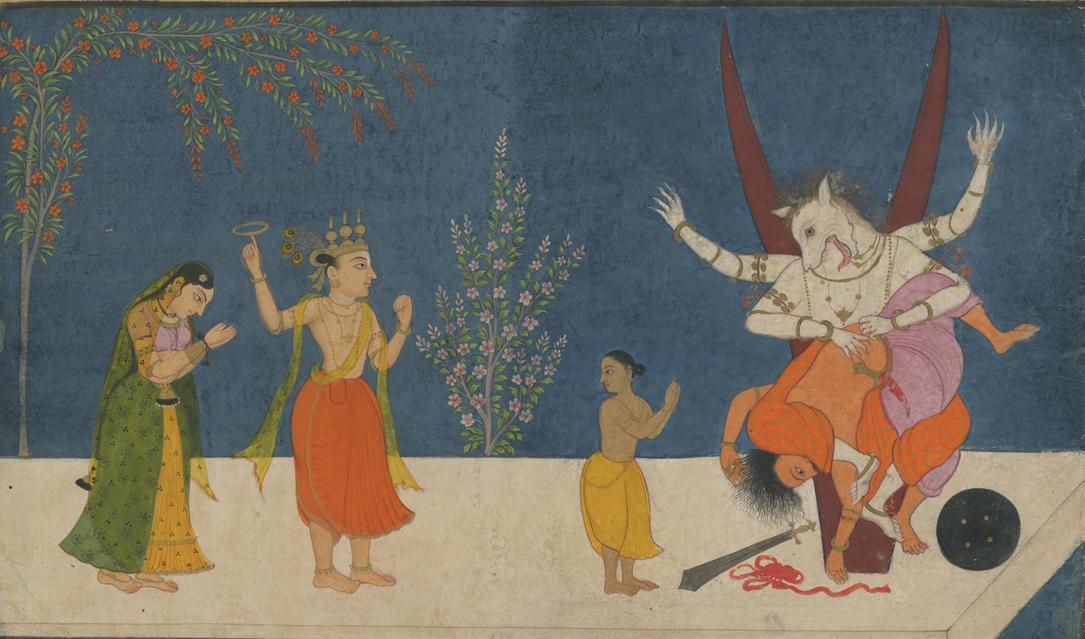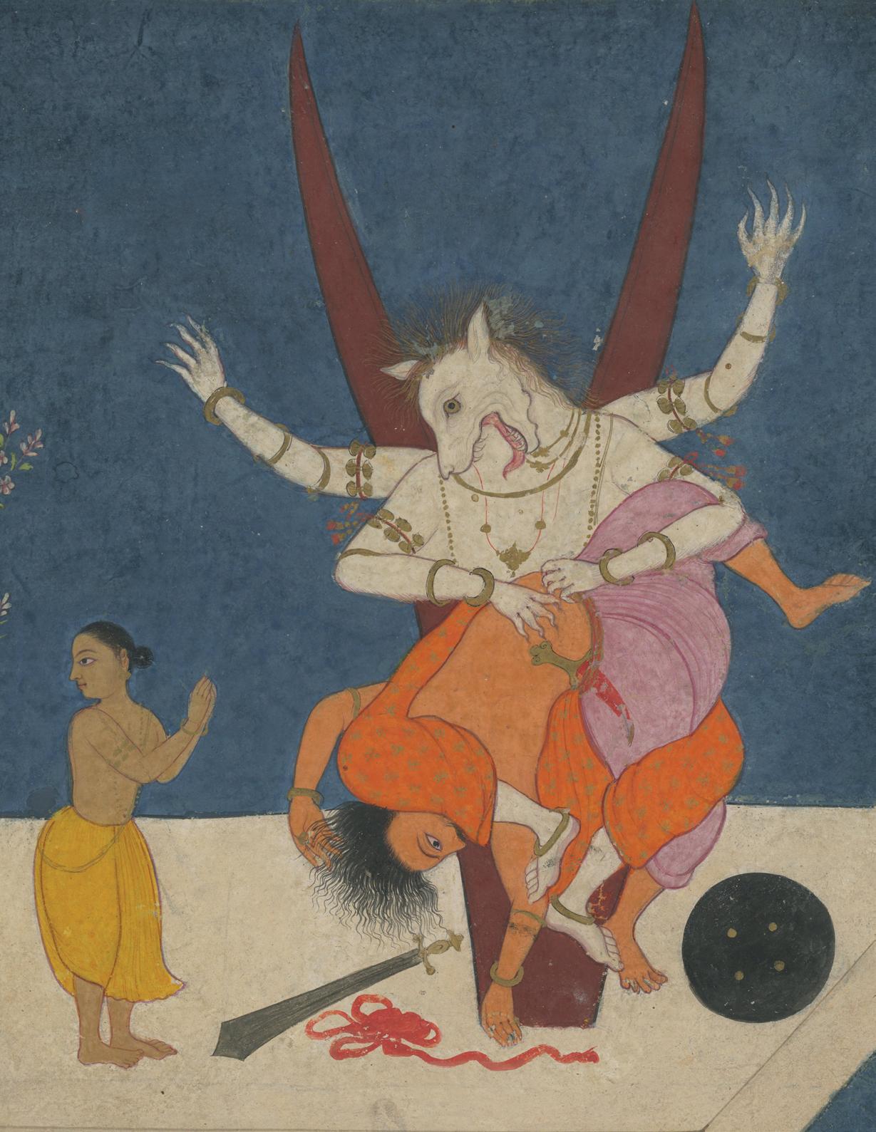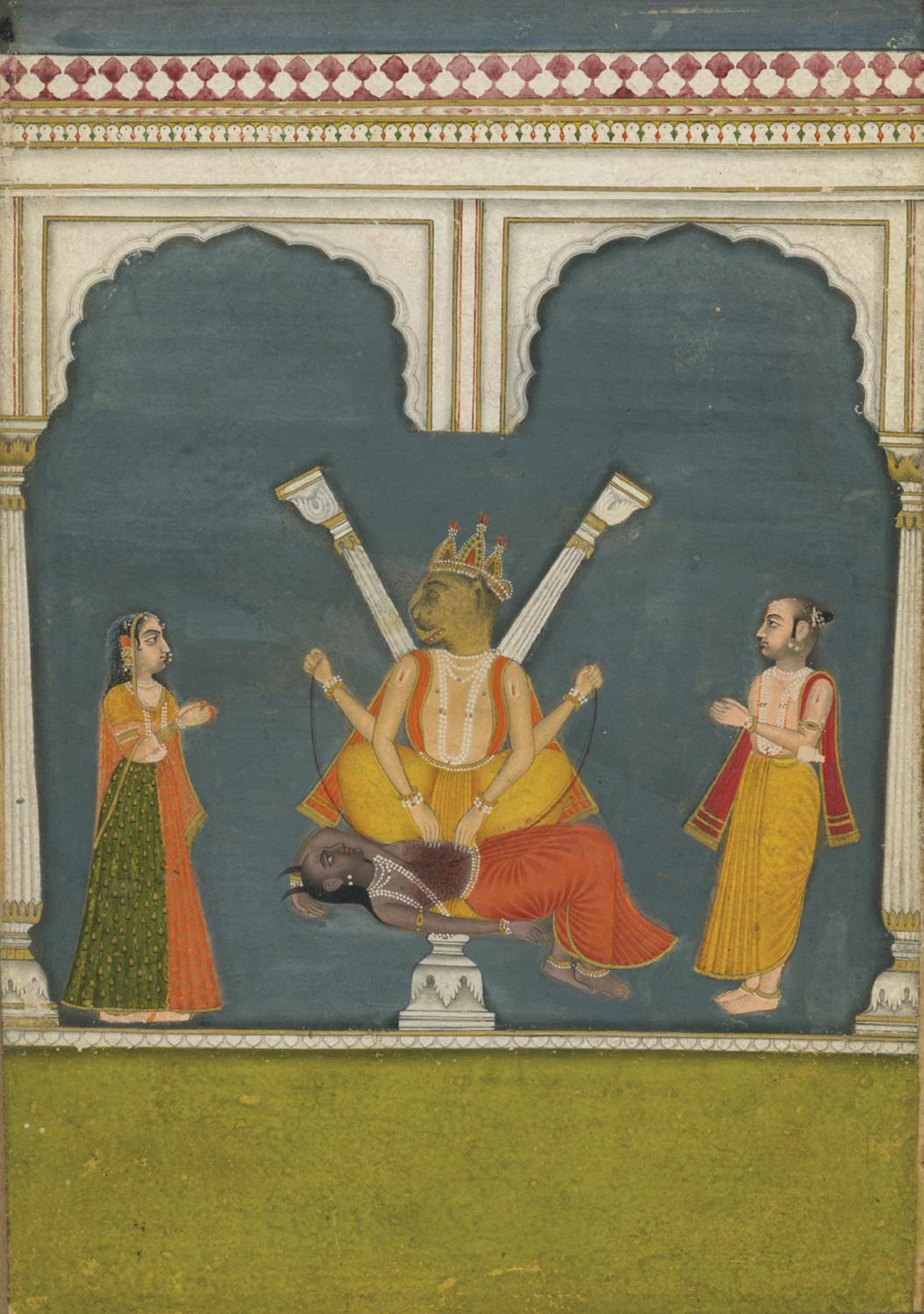 Each element of this small painting is filled with as much detail as possible, within its simple and nearly symmetrical composition. The artist’s skillful approach to rendering human figures—with great depth using minimal light and shadow atop a completely flat background—is of note, as is the use of similar techniques in creating the complex textiles worn by the bystanders. The techniques reflect the trained hand of a Mughal artist, which is unusual to see in combination with the present and infrequently depicted Hindu subject, Narasimha.