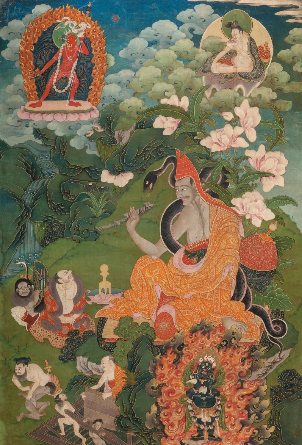 The subject of this painting, Abhayakaragupta, can be described as a Panchen Lama pre-incarnation. The Vajrayana Buddhist teacher who lived in the eleventh century was a prolific scholar who served as the abbot of the great monastic college and monastery Vikramashila at its height, authored the earliest known system of biographies of the Eighty-four Mahasiddhas, and much more.