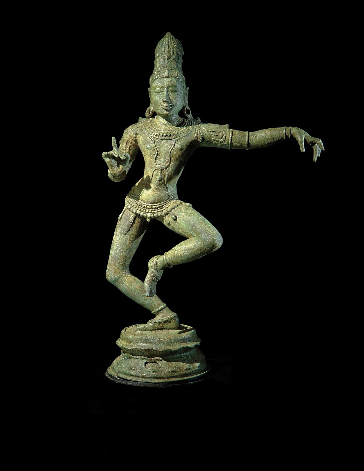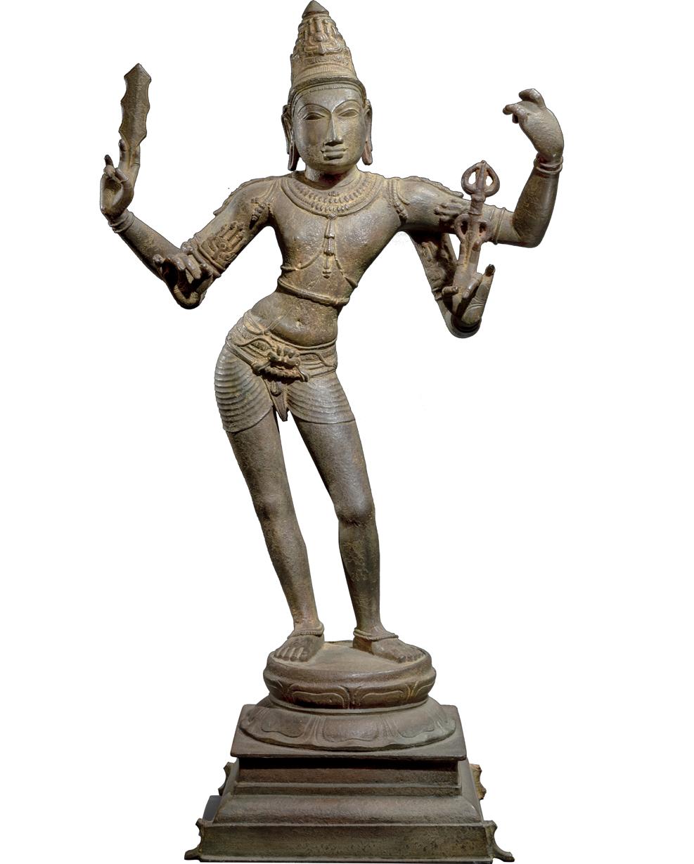 Durga is depicted here with eight arms, brandishing weapons of the various gods. Mahishasura is portrayed beneath her in the form of a bull’s head, demonstrating her victory over him. There is ample detail to each element despite the figure’s size. Notably small, yet complex details include her makara earrings and her many lifelike hands. Her flamelike aureole, comprised of beaded bands and leaflike flourishes surrounding the edges, is typical of Kerala sculpture as is her ample ornamentation. Both qualities are shared by a thirteenth-century bronze figure of Shiva from Kerala in the Metropolitan Museum of Art (acc. 1979.508).