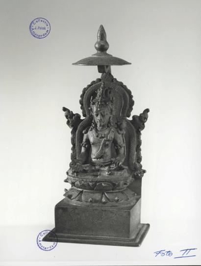 The flat lotus petals surrounding this slightly stepped base with beaded rims is a distinct feature of bronze sculpture from the Pala Kingdom of Northeastern India, which is carried forward in early Tibetan sculpture as well as in later Pala-revival-style sculptures emerging from the sixteenth through eighteenth centuries in Tibet and China. The present sculpture is an example of the early Tibetan type. The inward-facing serpents that secure the gathered tufts of hair on either