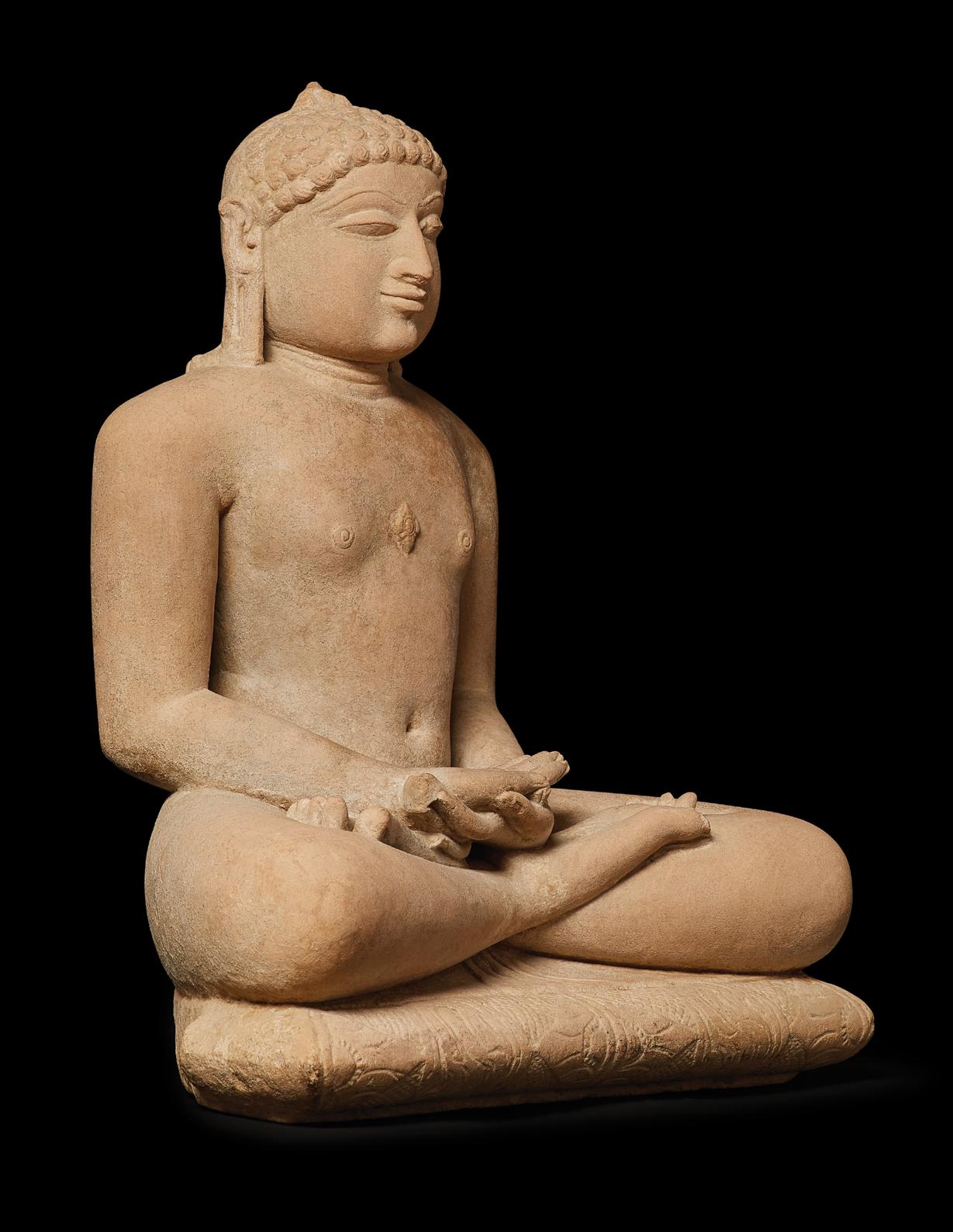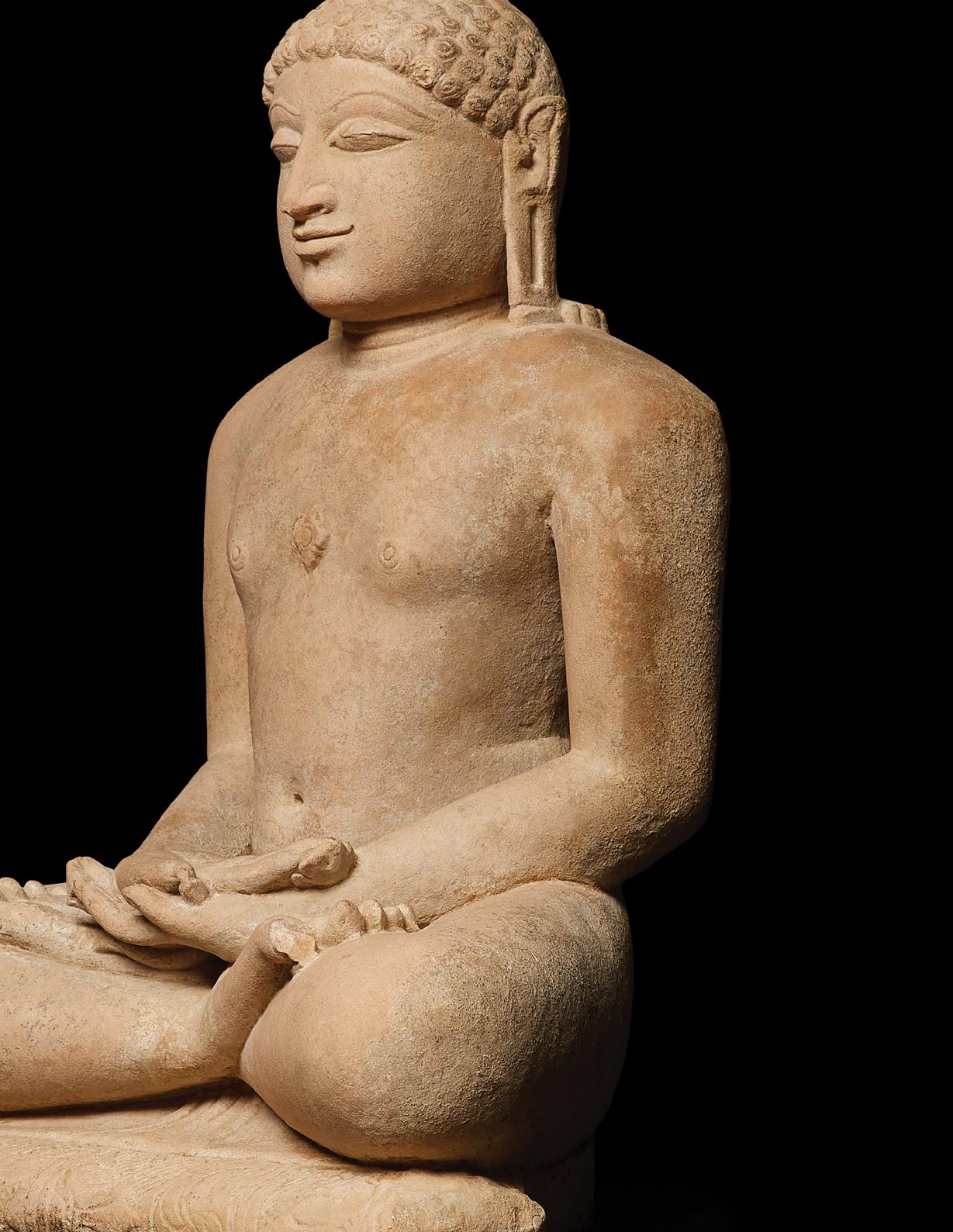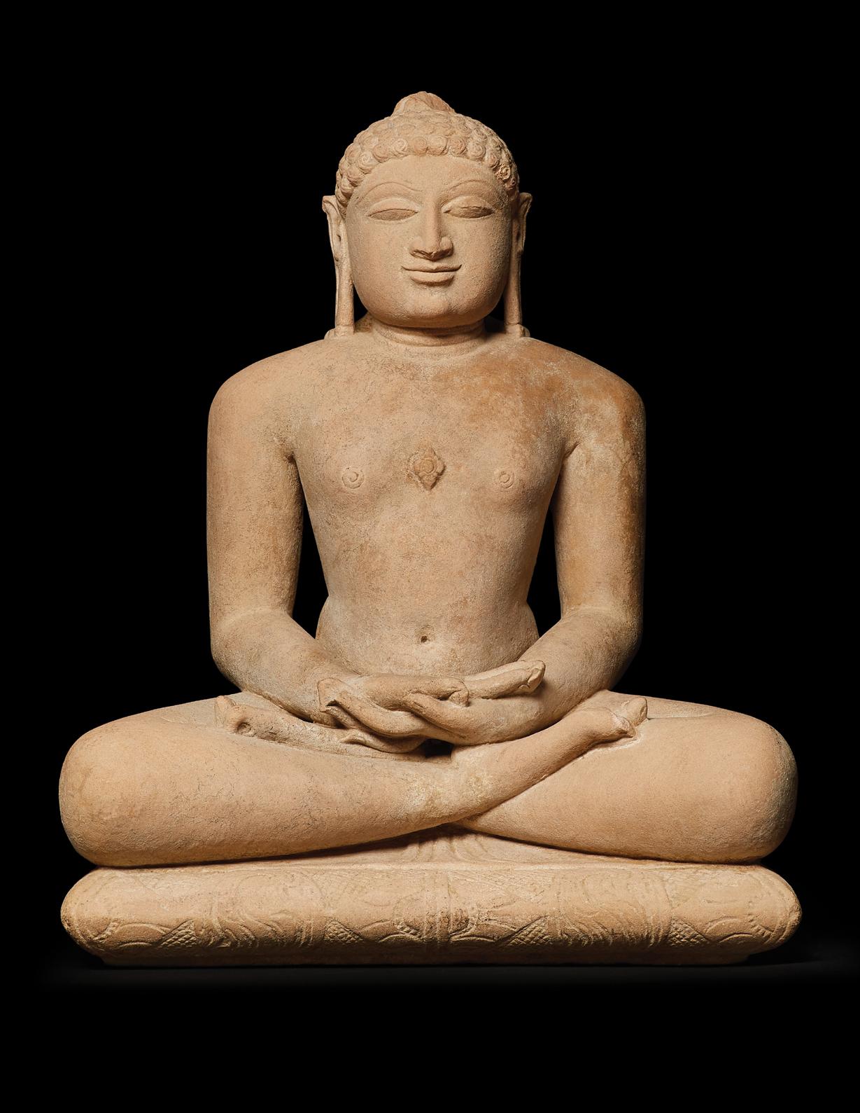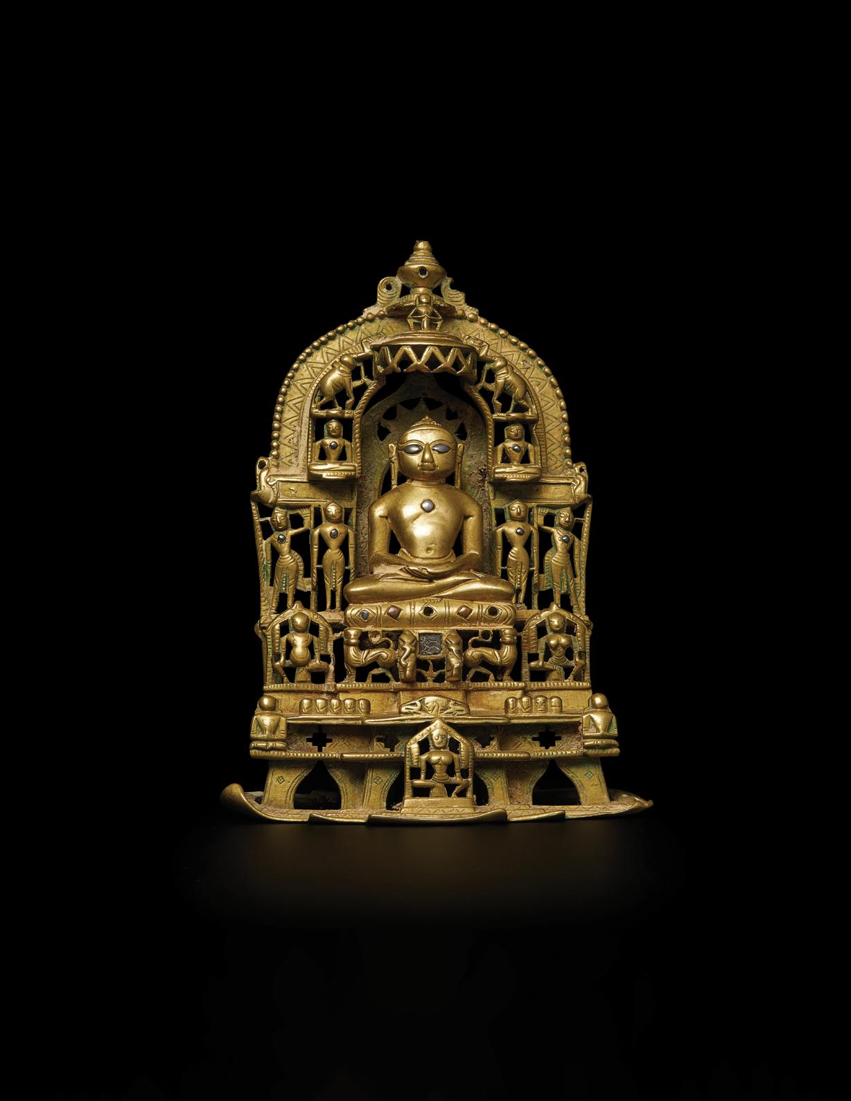 This bronze shrine depicts Anantanatha, a Jain tirthankara or spiritual teacher of the dharma. Each tirthankara is accompanied by a symbol or emblem to help worshippers distinguish between similar figures, usually located on the shrine’s pedestal. As such, he can be recognized by the falcon emblem in the Svetambara Jain tradition, as seen here, and alternatively by the porcupine emblem according to the Digambara Jain tradition.
