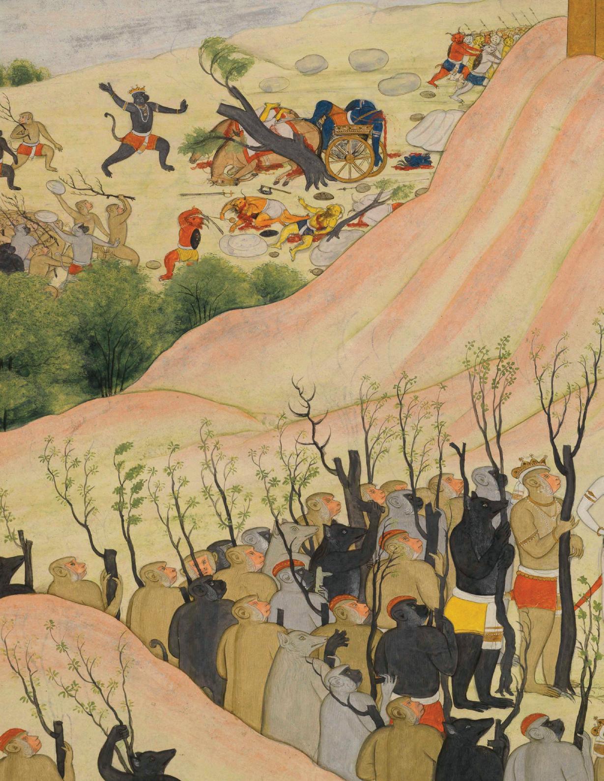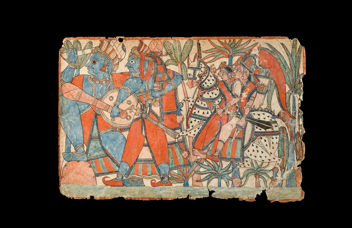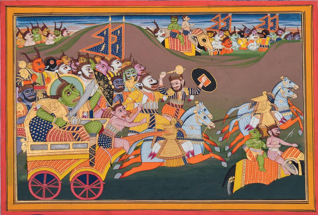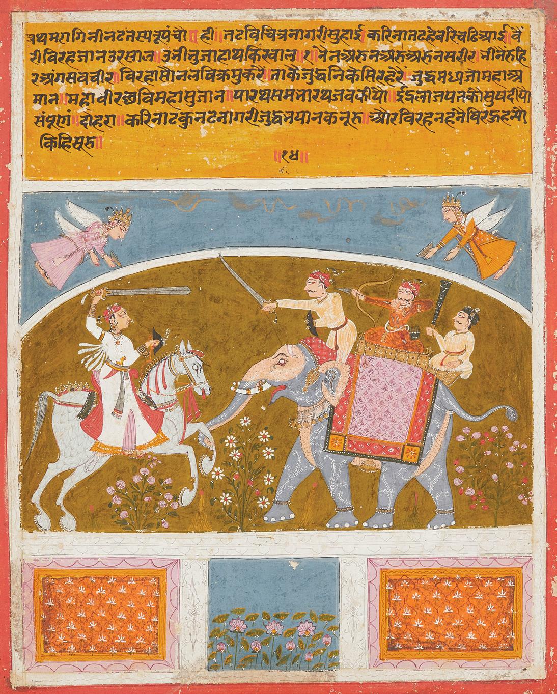 warrior on horseback. With her sword raised, she comes face to face in battle with a war elephant and it’s three riders. Scholar Kalus Ebeling notes that “It is hard for the uninitiated viewer of Ragamala paintings to reconcile the concept of female ragini with the male images of battling warriors...While most ragamala paintings are conceived in a devotional or erotic mood, Nat visualizes music of a heroic mood” (K. Ebeling, Ragamala Paintings, Basel, 1973, p. 37). Thus, the fact that these depictions are not literal, but instead meant to be evocative of a particular feeling, allows for this subversion of gender norms.