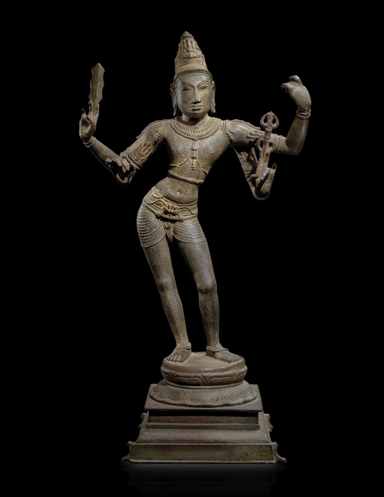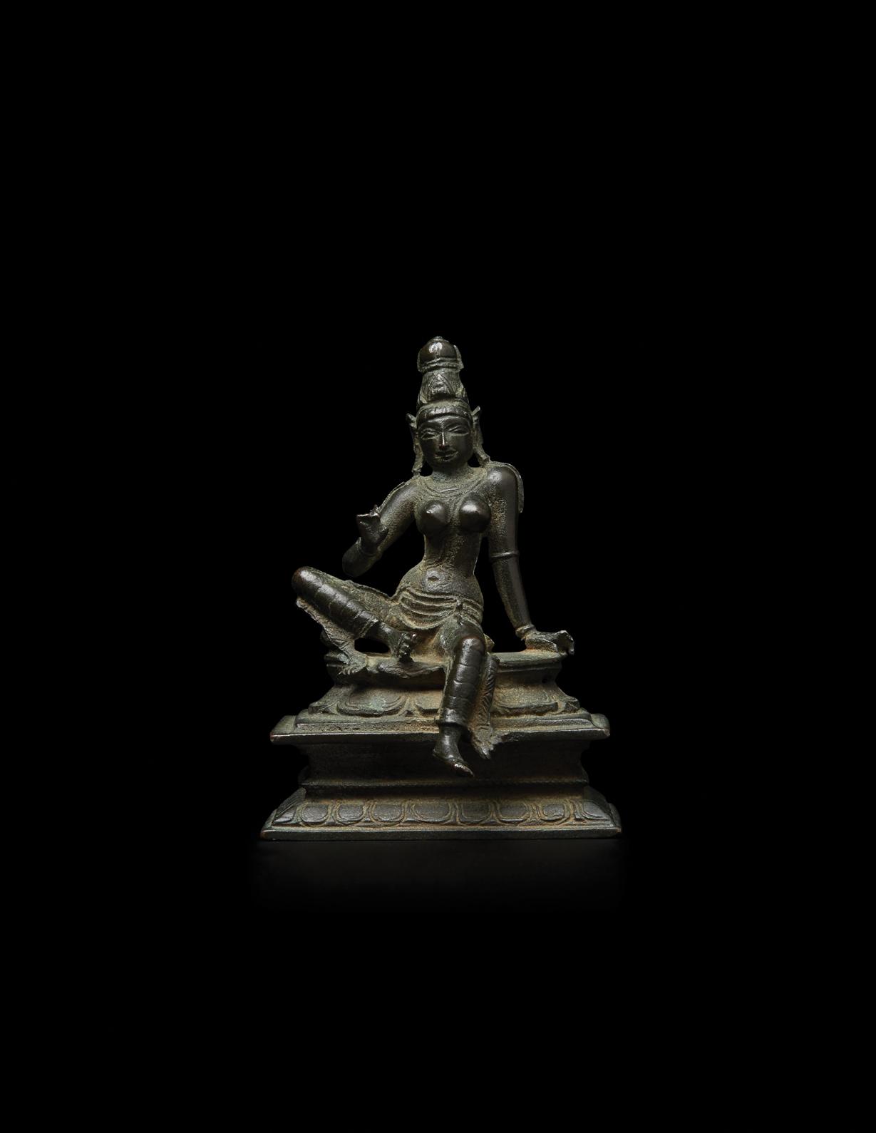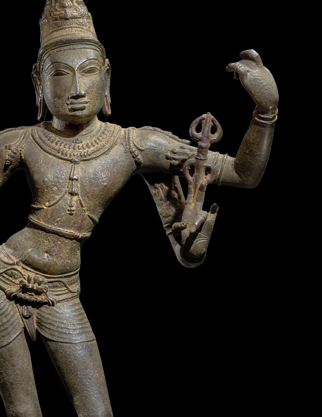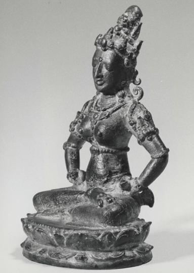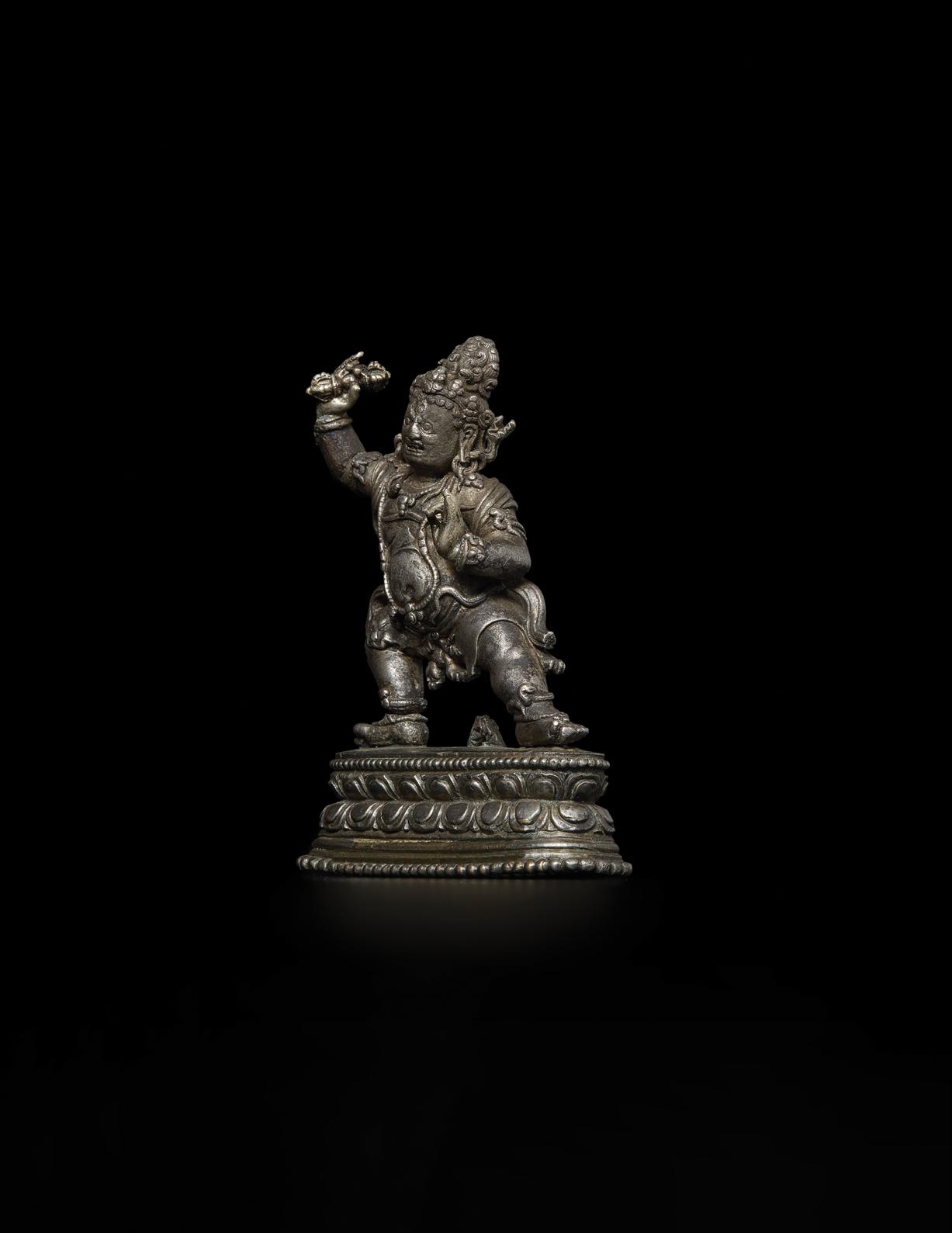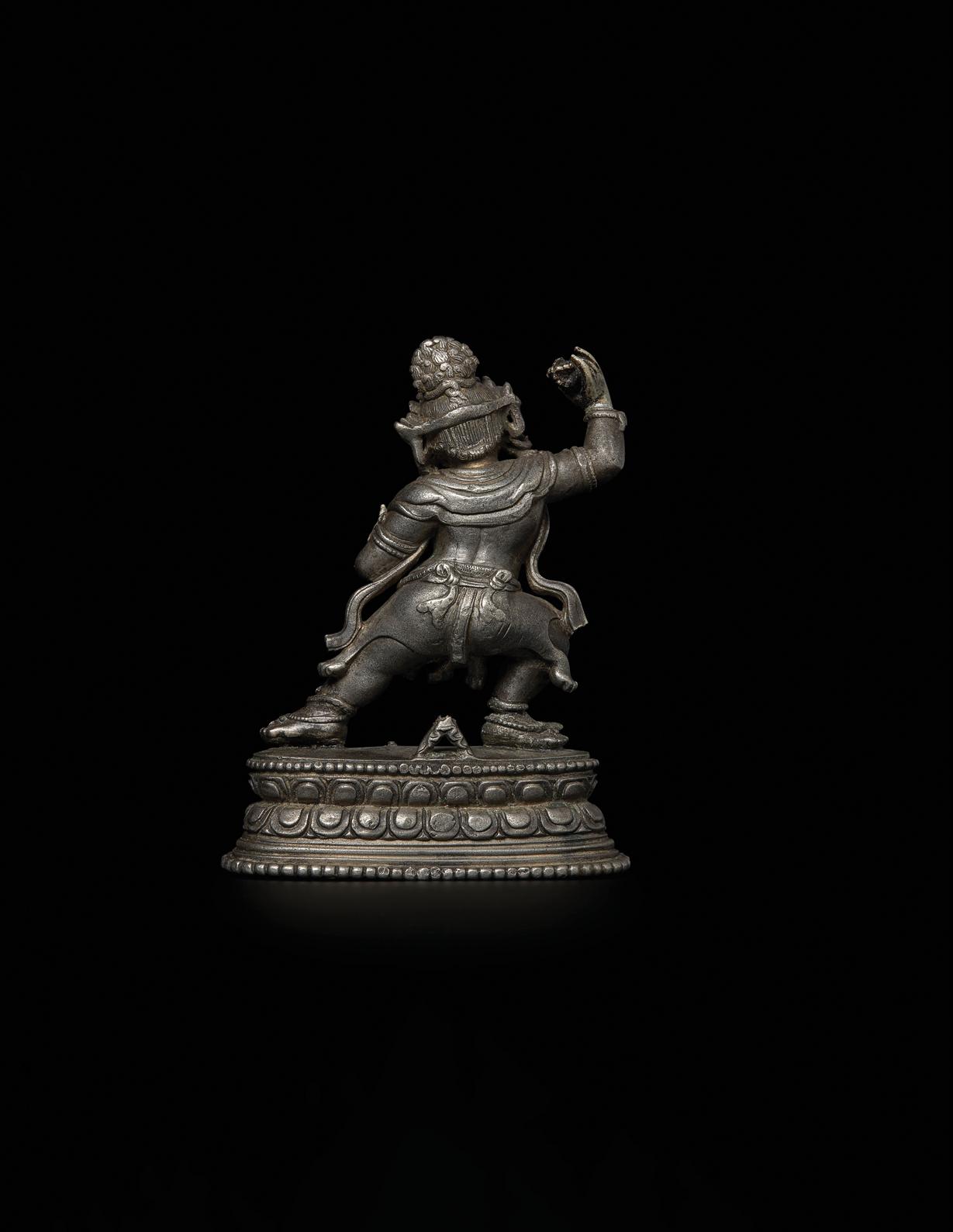 The present figure is highly unusual in terms of material and quality. The silver composition tells us that this was a significant commission. Despite the fact that the metal is softer than copper and greatly susceptible to abrasion through centuries of handling, sharp details remain: the head and hands of the tiger skin and much of the chasing work defining its fur, the buddha effigy and the flamelike hair with curled tufts at each end, as well as the many stippled serpent ornaments with lifted heads.