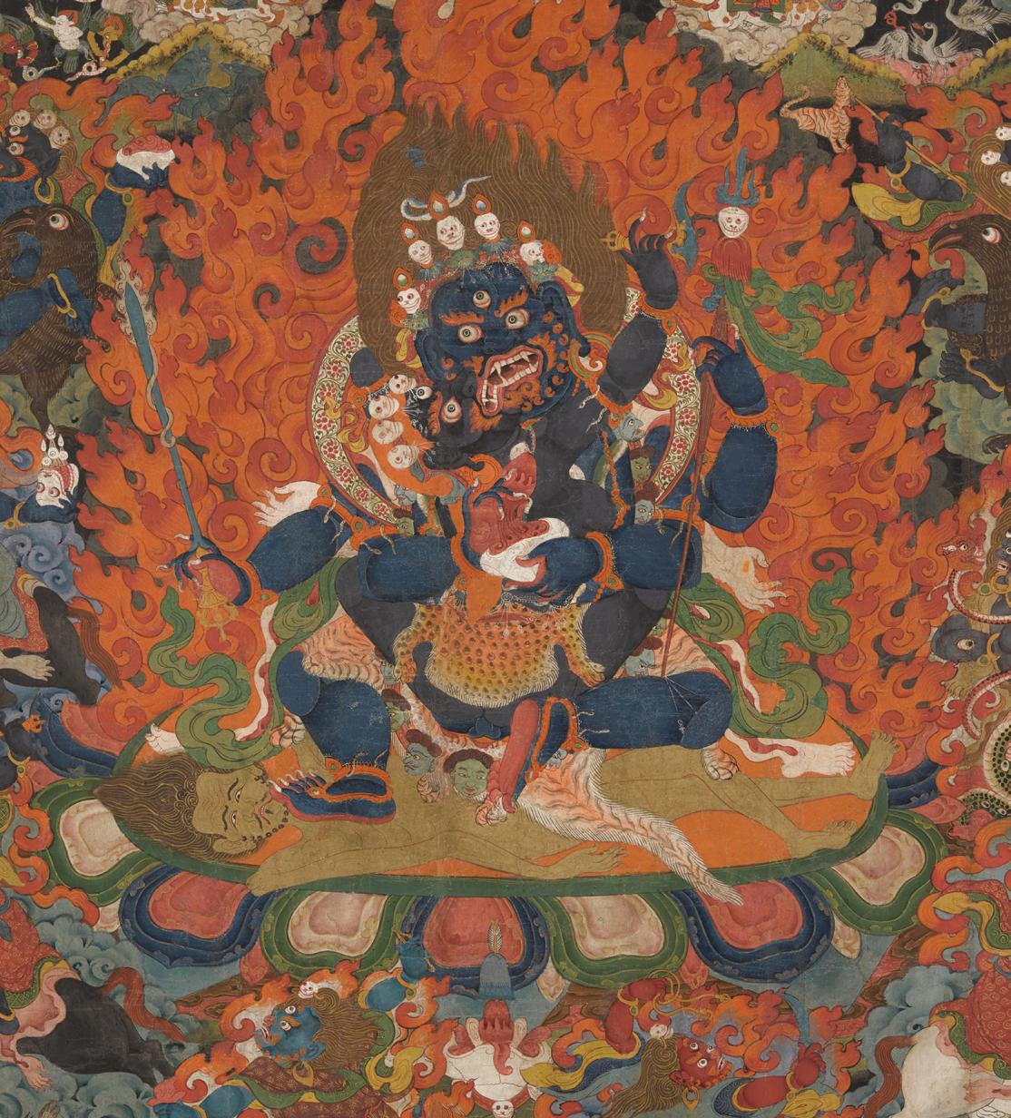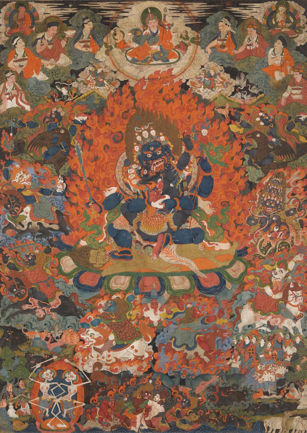 Teachers, worldly deities, protectors, and wrathful retinue figures coalesce in this cloud and flame-filled composition, replete with gruesome charnel ground scenes and white-clad ngagpa practicing within. A four-armed blue-black protector and his consort trample a supine human corpse with a pained expression at center, demonstrating their power to destroy ego. The central figure holds a blazing sword and bloody heart in his two proper-left hands and a skullcup and trident in his right, identifying him as a form of Mahakala or Gonpo Nagpo Chenpo. His dwarfish and big-bellied body is partially concealed by the backside of his female counterpart, who holds a curved knife and skull cup (unseen). Their sexual embrace is depicted here in an explicit manner, atypical among other traditional depictions of this figure. Below Mahakala and his consort, groups of bloodthirsty animals await the flesh of his fierce retinue’s mortal victims while an assembly of humans and demigods observe.