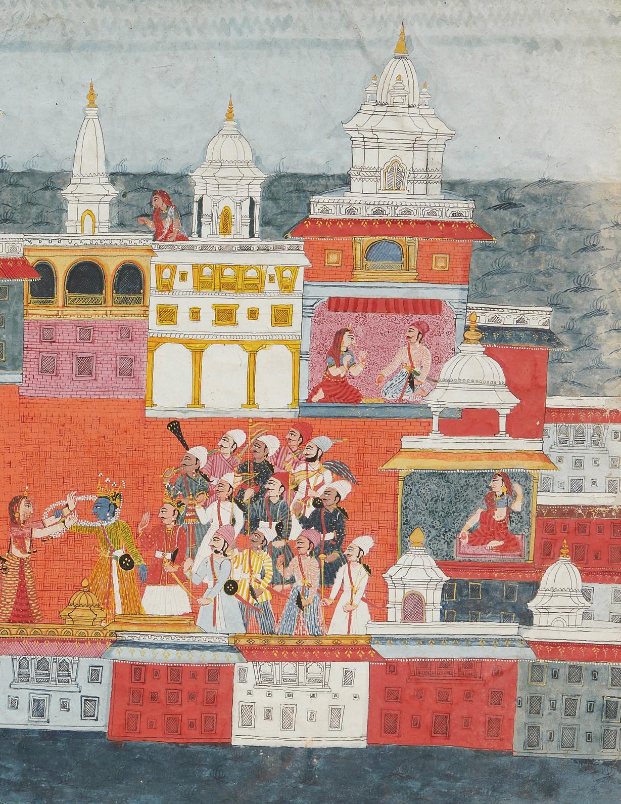 The current painting is from the same series as The Liberation of Gajendra, illustrated by Andrew Topsfield in In the Realm of Gods and Kings, New York, 2004, p. 117, no. 43, formerly in the collection of Cynthia Polsky and sold at Bonhams New York, 16 March 2015, lot 70. The series was commissioned for a Maharaja of Bikaner; it includes a variety of Hindu deities including Vishnu’s many avatars. Each of the compositions display a strong Mughal and Deccani influence.