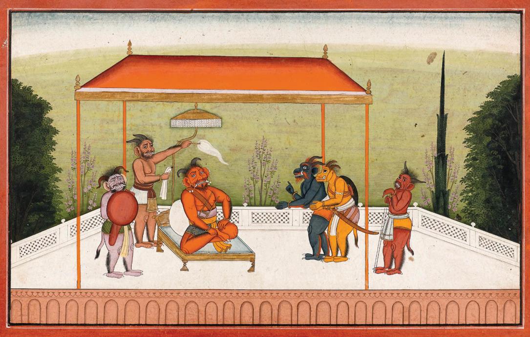 Vishwa Chander Ohri references another amazing depiction of Narasimha at the Musee Guimet in his discussion of the present work (acc. M.A. 4968): “Both of them appear to be the work of one artist. The style of these paintings shows a later development from the pictures of the Rasika-priya in the popular Mughal style of the Jahangir period. Though rich yellow and orange are used for the garments, the colour scheme and style of these pictures are different from those of the Basohli paintings. Naturalism of the Mughal style is apparent from the manner in which the lion-head of the deity is drawn in these works, but the stylisation in the d[e]piction of other figures, shows a change from the Mughal style. The female figures in these pictures possess affinity with those seen in the wood reliefs of the Brahmaur State-Kothi; the proportions of the figures in the works done in two different mediums (paintings and wood reliefs) are similar” (p. 21). Of the Guimet example, Amin Okada comments that while it is stylistically ambiguous, it is most likely from Chamba, around the middle of the seventeenth century (see. Amin Okada, “Uni Illustration insolite du Narasimhavatara,” La Revue du Louvre et des Musees de France, October 1985, no. 4, pp. 28588). What is clear and indisputable, is the quality and uniqueness of these two rare compositions.