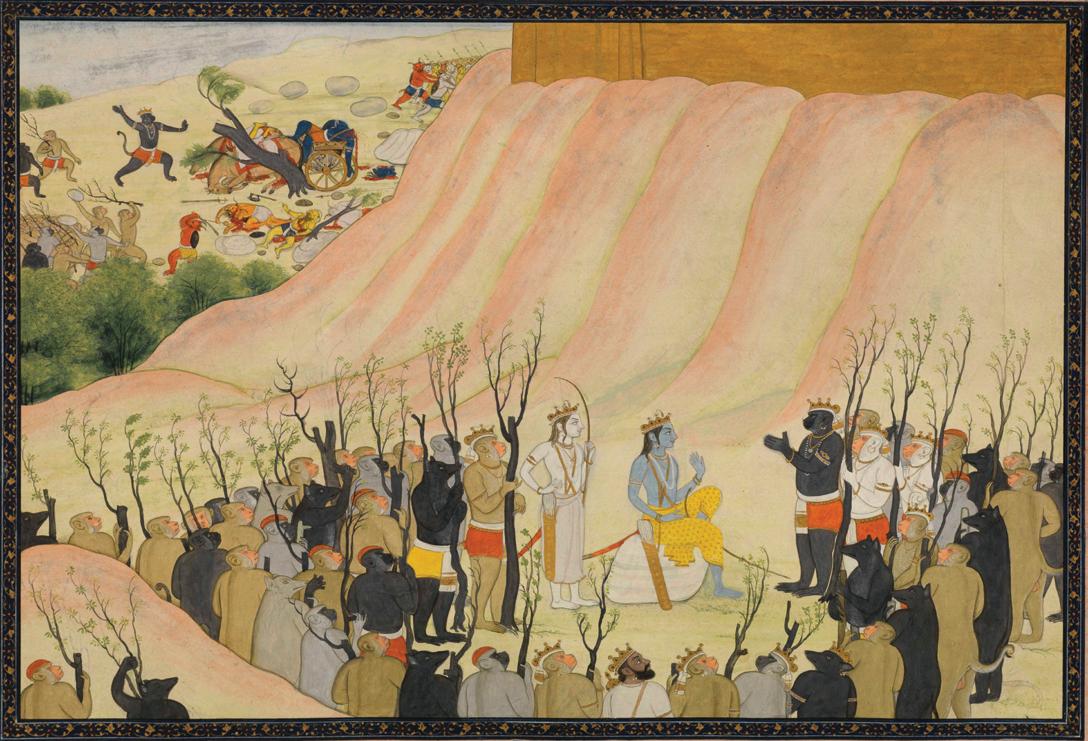 In the present portrait of the Ramayana’s protagonists, this Mughal influence is apparent. The figures appear as strong individuals, assuming a space that belongs entirely to them rather than in an overlapping fashion typical of earlier Rajput painting. The face of each figure is unique, with Rama’s low eyes and his voluminous hair fully distinguished from Lakshmana’s clean hairline and downturned nose. Their flowing garments are highlighted by the stark, monochromatic yellow background characteristic of the Pahari tradition. This painting serves as a benchmark for the beginning of an exploration into depth and naturalism in the Pahari region.