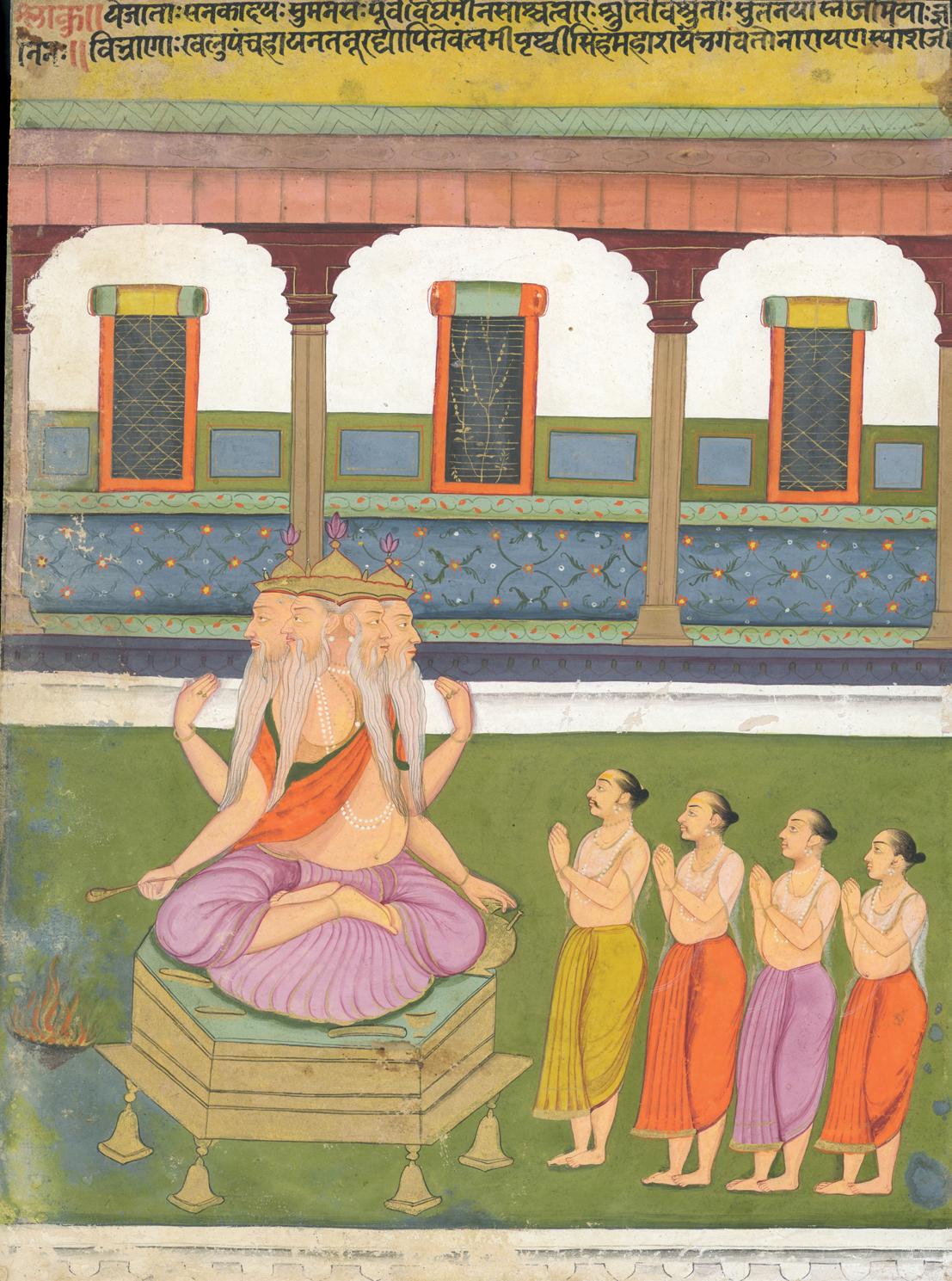 A third of the Hindu triad of supreme divinity, along with Vishnu the Preserver and Shiva the Destroyer, is Brahma the Creator—progenitor of the hymns and ritual texts known as The Vedas. The Brahma Purana describes him with five heads. As the story goes, he became too arrogant, referring to himself as the greatest of the Trimurti or divine triad, so Shiva removed his fifth head to humble him. In the present composition, Brahma is shown worshipped by four devotees who may represent the four Vedas: the Rig Veda, the Sama Veda, the Yajur Veda, and the Atharva Veda.
