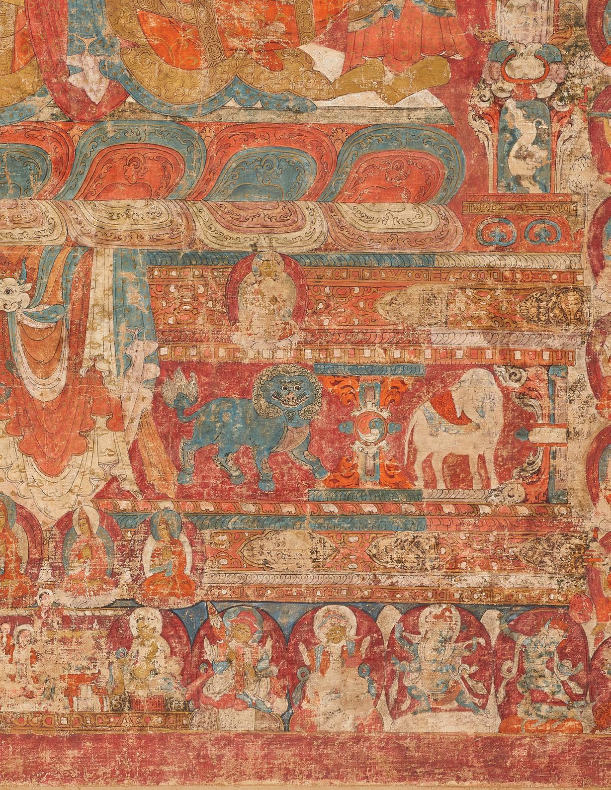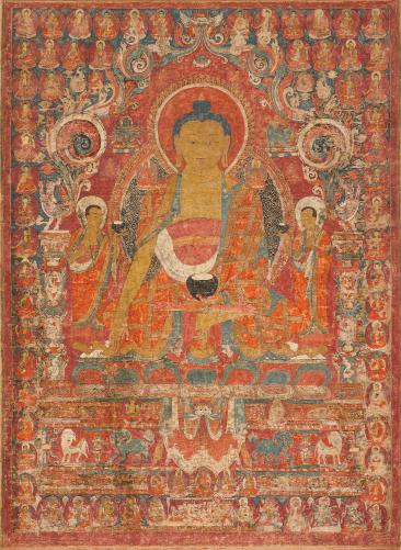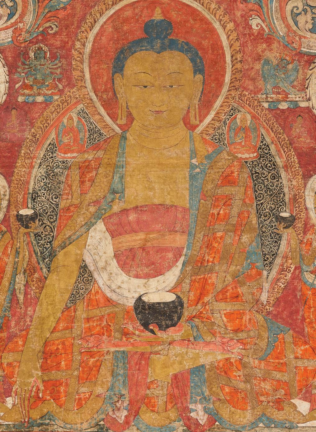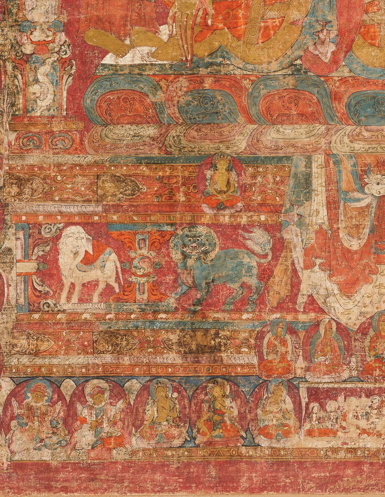 painting’s fifteenth-century origin include several Indo-Nepalese techniques introduced to Tibet through Newar artists active in the more central regions during the second dissemination of Buddhism in Tibet (tenthtwelfth centuries). The predominantly red palette, patra or scrollwork motif within Shakyamuni’s mandorla, and representation of naga are the most apparent.