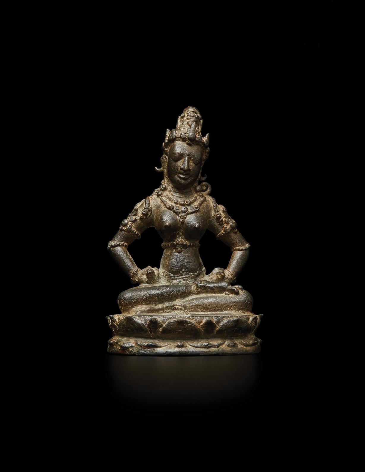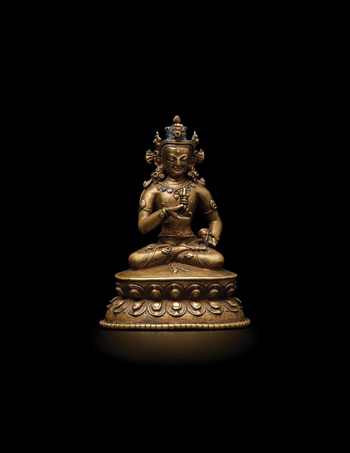 While this bronze sculpture of Vajrasattva is petite in size, it is aesthetically powerful: with a soft face, lifted chest, and lifelike hands and feet. By the twelfth century, Tibetan artists mastered bronze casting technology as sophisticated as that of the Pala Empire, and by the fourteenth, Pala artists were no longer active in Tibet (von Schroeder, Buddhist Sculptures in Tibet, Vol. II: Tibet & China, Hong Kong. 1990, p. 1092). This present sculpture demonstrates how the late-Pala style of northeastern India was absorbed into a central-Tibetan style that defined the ‘Monastic period’. The simple three-petal diadem with flared ties at the ears securing the flat band at the back of the head is typical of this sculptural milieu.