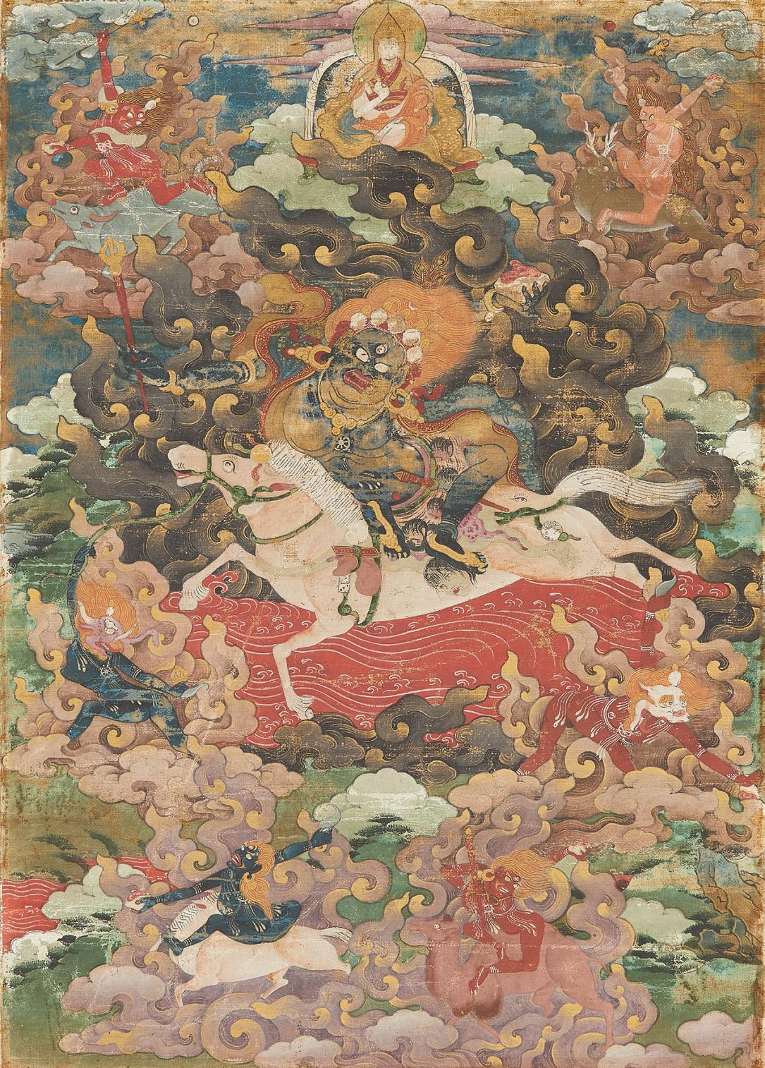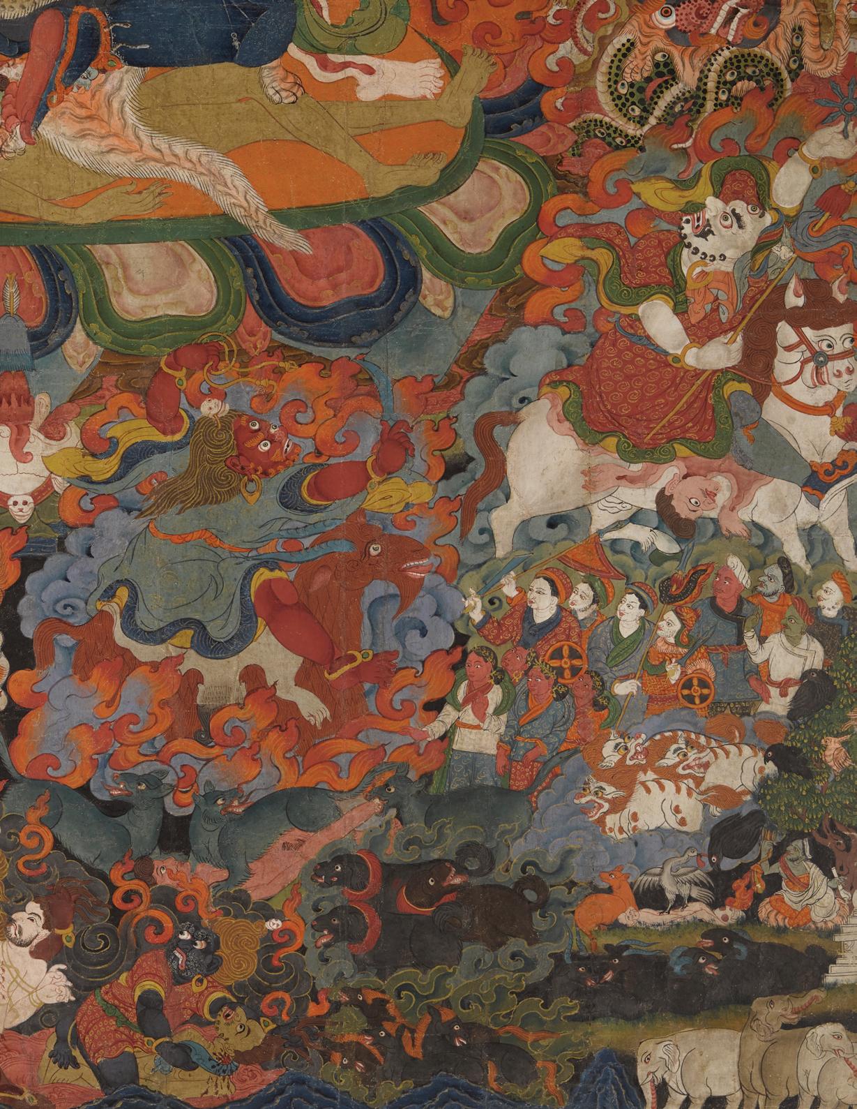 The wrathful emanation of the enlightened female Dorje Yangchenma (or Vajra Sarasvati in Sanskrit) appears at the center of this packed composition, emerging from the smokey clouds that surround her and her retinue. She sits upon a mule, trampling a sea of blood, clutching a club in her proper-right hand and a bloodfilled thod-pa or skull cup in her proper-left. She totes her five magical weapons in stride: a bundle of curses, a sack of skin filled with diseases, dice for mo or divination, a ball of thread, and a tally stick or dram-shing