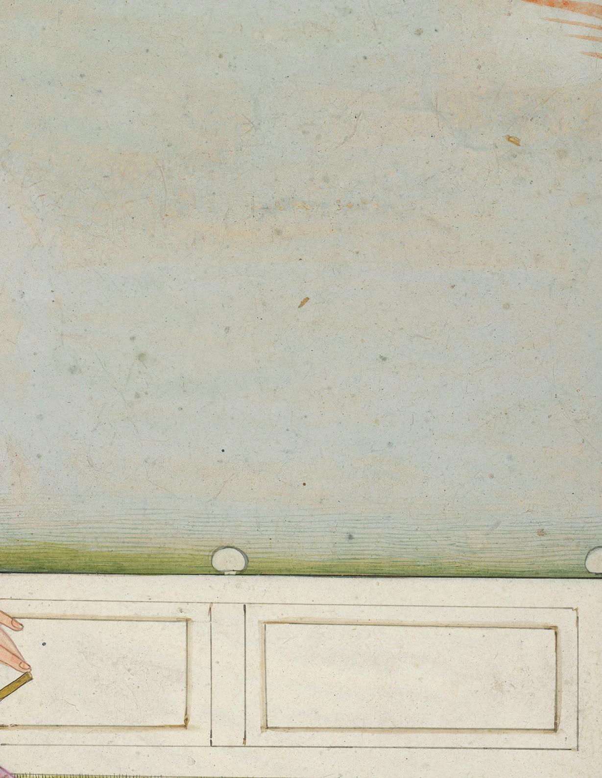 While typical Nat Ragini scenes are filled with the violence of battle, often featuring dead and decapitated soldiers, this depiction is relatively restrained. Instead of dead bodies, the battle ground is interspersed with detailed florals, which also decorate the lower register of the painting. Enclosing the scene is a curved horizon, above which two angels appear to be raising their cups towards each other as if in celebration. The marble architectural element atop which this scene takes place, as well as textile-like niches on either side of a manmade lotus pond within, are the Mughal elements that distinguish this Datia painting from the earlier Rajput Malwa painting style it owes homage to.