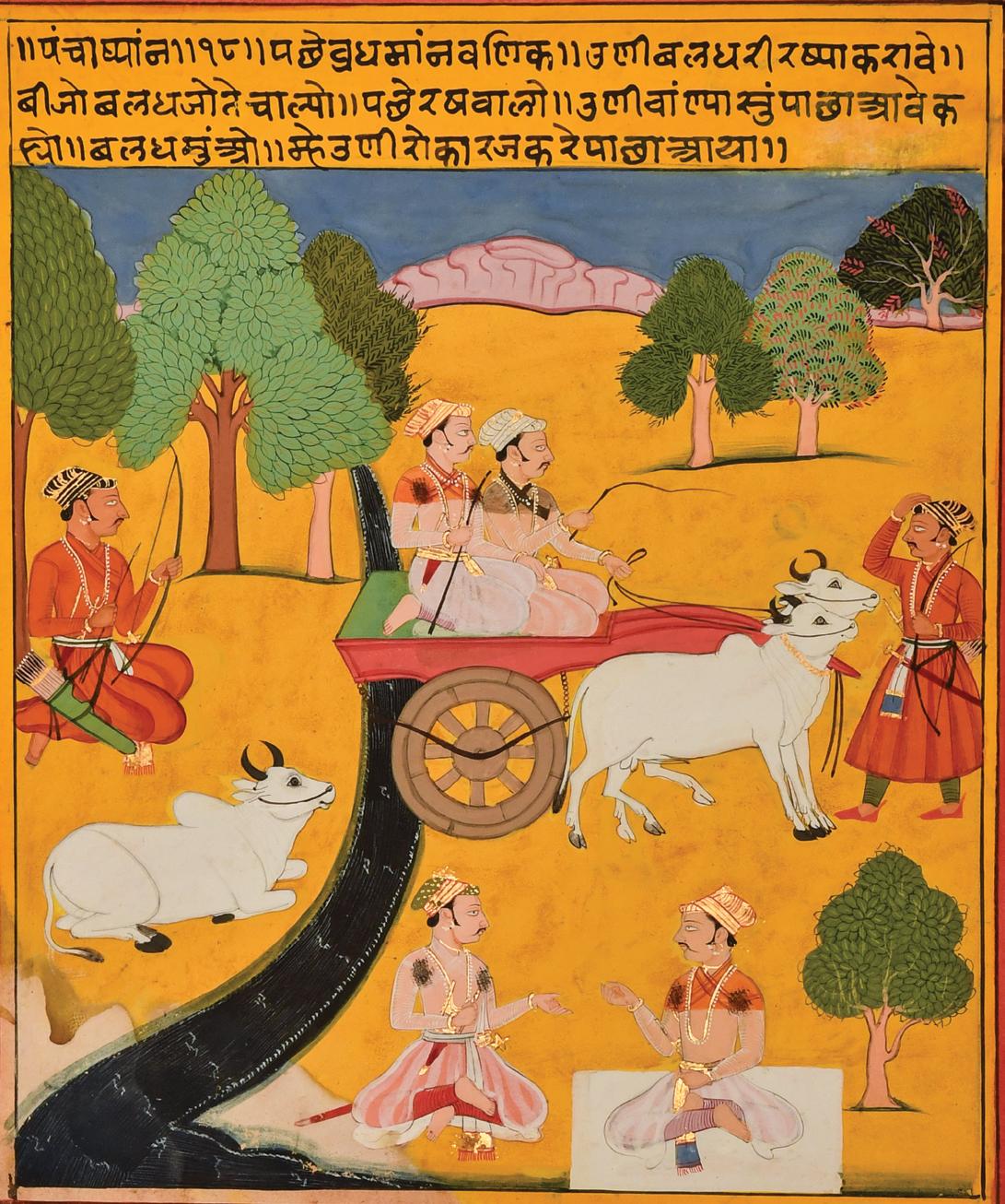 The painting here is depicted in a continuous narrative in which successive episodes of the story are shown together in a single picture. The rural landscape, a vibrant yellow background split by a flowing river, contains three scenes. The first scene, on the left of the river, depicts an archer in red robes kneeling in wait with a resting bull. In the second scene to the right, the same archer is seen greeting two men in a bullock cart. The figure in orange is likely the protagonist of the narrative, while his companion holding the whip is the cart driver. Finally, in the lower register, the figure in the orange robe meets with another man, just as richly dressed as he. The fact that he sits on a mat, while the other does not, signifies his rank and importance.