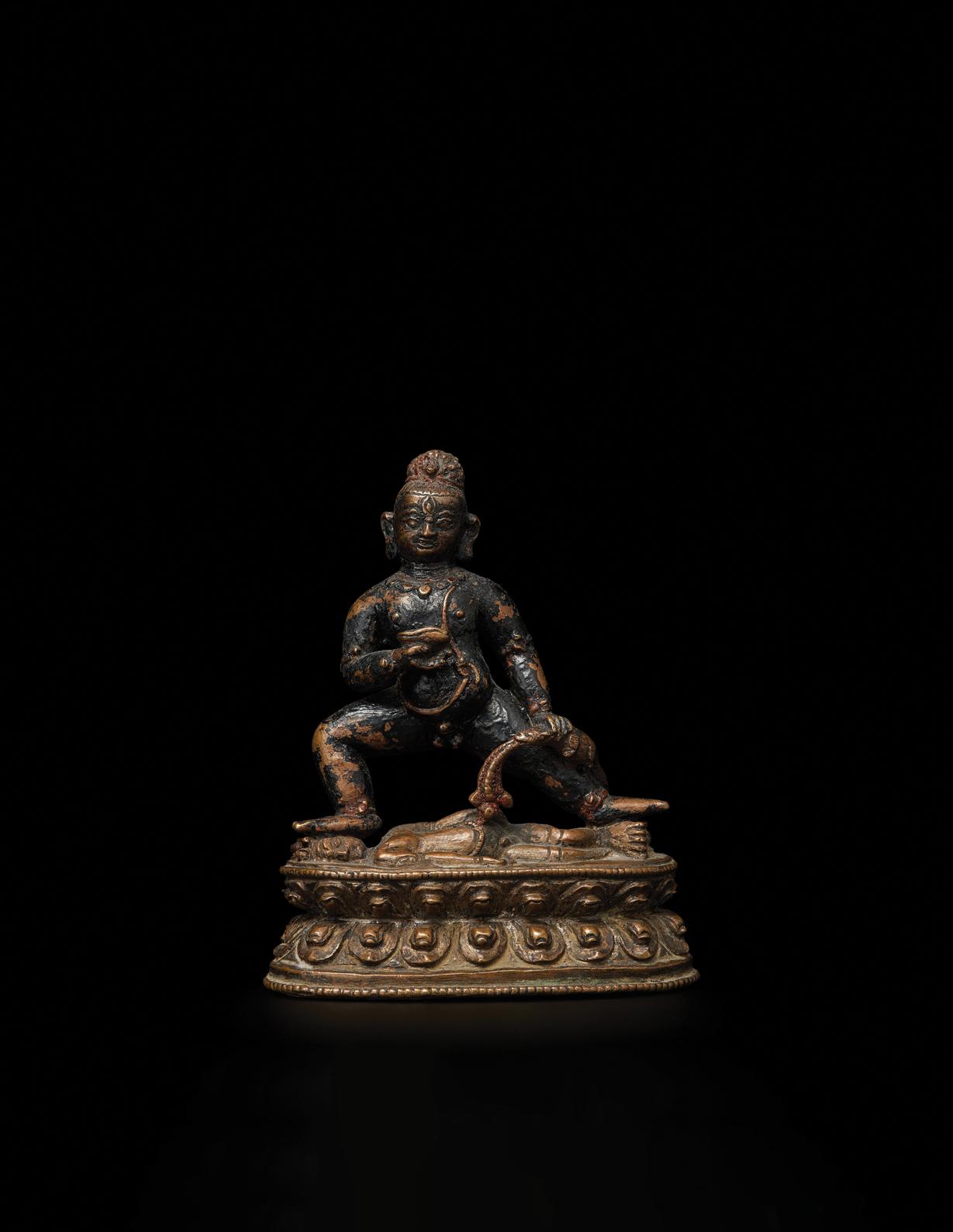 Kala Jambhala, or Black Jambhala, originated in India and was widely popularized in Nepal and Tibet. Standing with his right leg bent at the knee atop a supine figure and with his left leg thrust to the side, he holds a skullcup in his proper-right hand and a mongoose in his left, symbolizing his power to destroy human greed and bestow good fortune. He is similarly adorned in serpents to symbolize his conquering of avarice. The present sculpture is made of a copper-rich alloy apparent in its reddish tone, pointing to its Nepalese origin; this is corroborated by wide, yet soft facial features common to the late Malla sculptural styles.