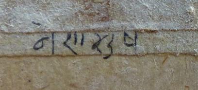 Iconographic details point to the fifteenth-century origin of this painting, just as its stylistic details do. The way each buddha is depicted with a round halo intersecting a mandorla just above the figure’s shoulders is typical of this period. Many other stylistic features of buddhas painted in this time and place are reflected in the central image of Shakyamuni: his very-spherical ushnisha, pronounced widows peak, faint urna, thin arched brows, wide eyes, narrow mouth, pendulous earlobes, and three distinct neck folds. The well-known fifteenth-century Shakyamuni in the Bhadrakalpa Guiseppe Tucci collected on one of his trips to Guge in 1933 or 1935 (see Himalayan Art Resources item no. 19003) is part of the same milieu, as is a painting of the present subject in the Virginia Museum of Fine Arts (see Himalayan Art Resources, item no. 31303). Each of these bears a close resemblance to buddhas within the fifteenth-century murals of the White Temple at Tholing Monastery, which were referred to at the time of creation as Kache Luk (“kha che lugs”) or the style of Kashmir. The Tucci painting is, in fact, inscribed with this description beneath the silk frame (see Klimburg-Salter, Discovering Tibet: The Tucci Expeditions and Tibetan Paintings, Milan, 2015, Cat no. 2, pp. 88-92). The stylistic descriptor refers to the influence of Kashmiri artists working in the region since the late tenth century, when
