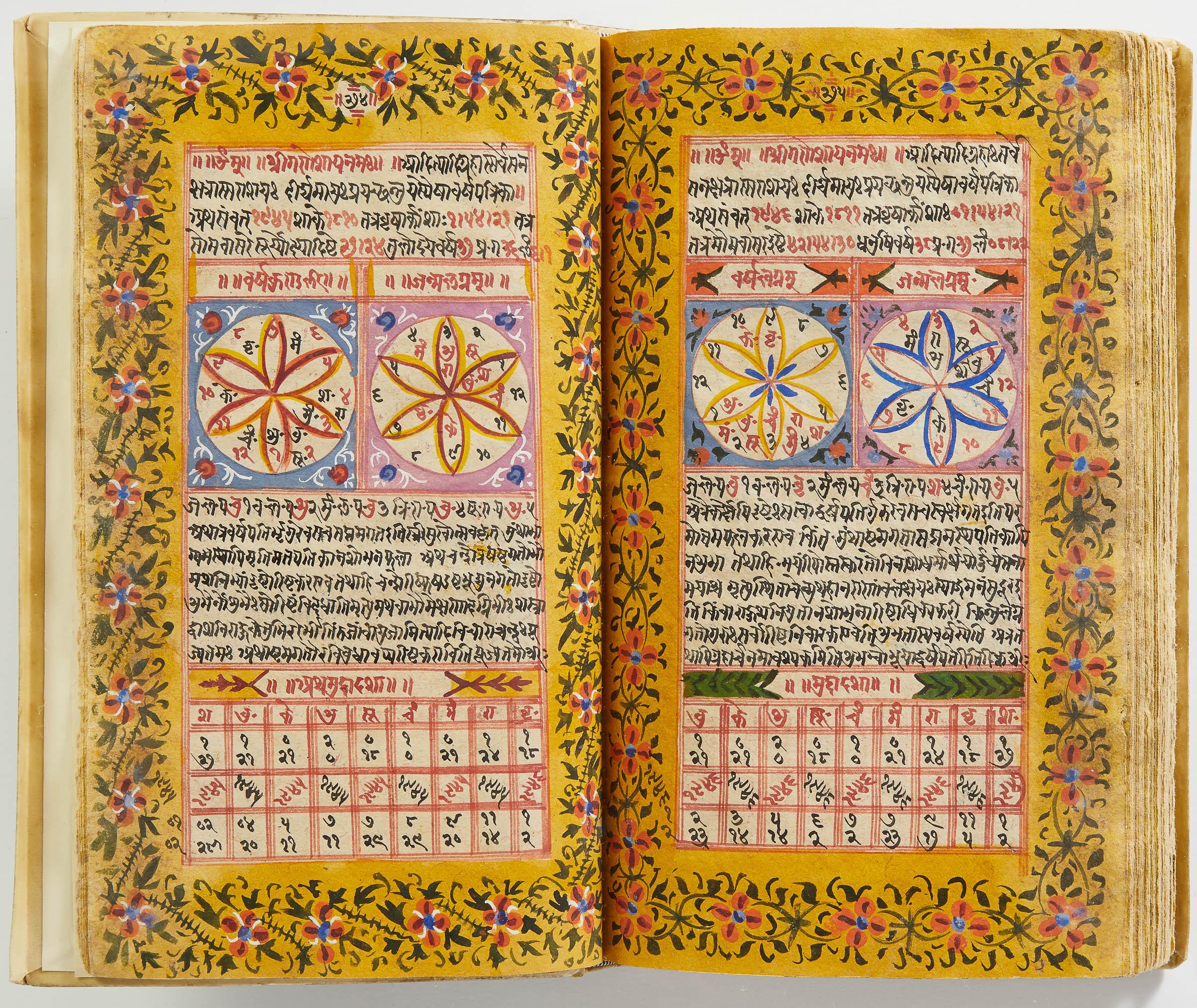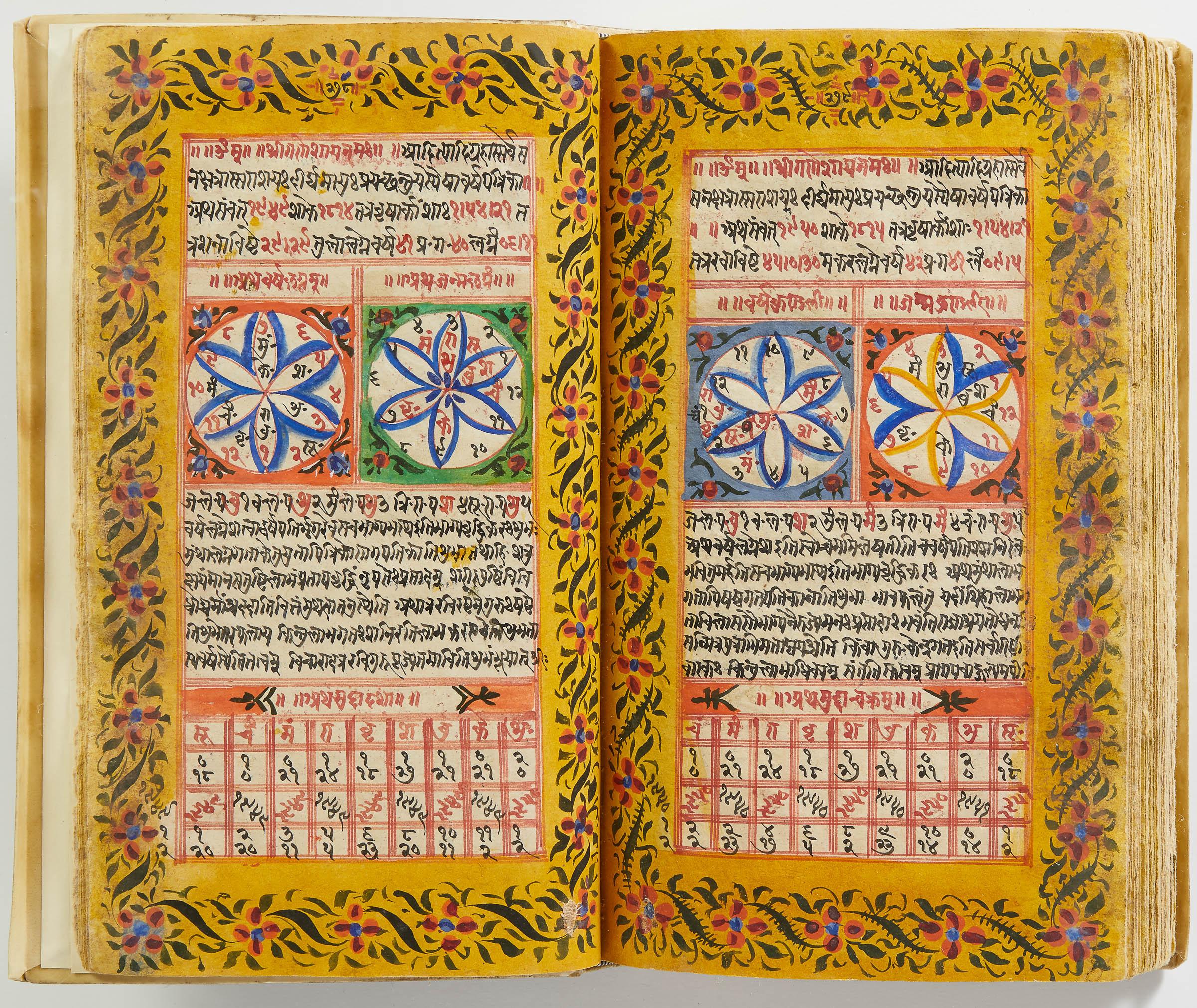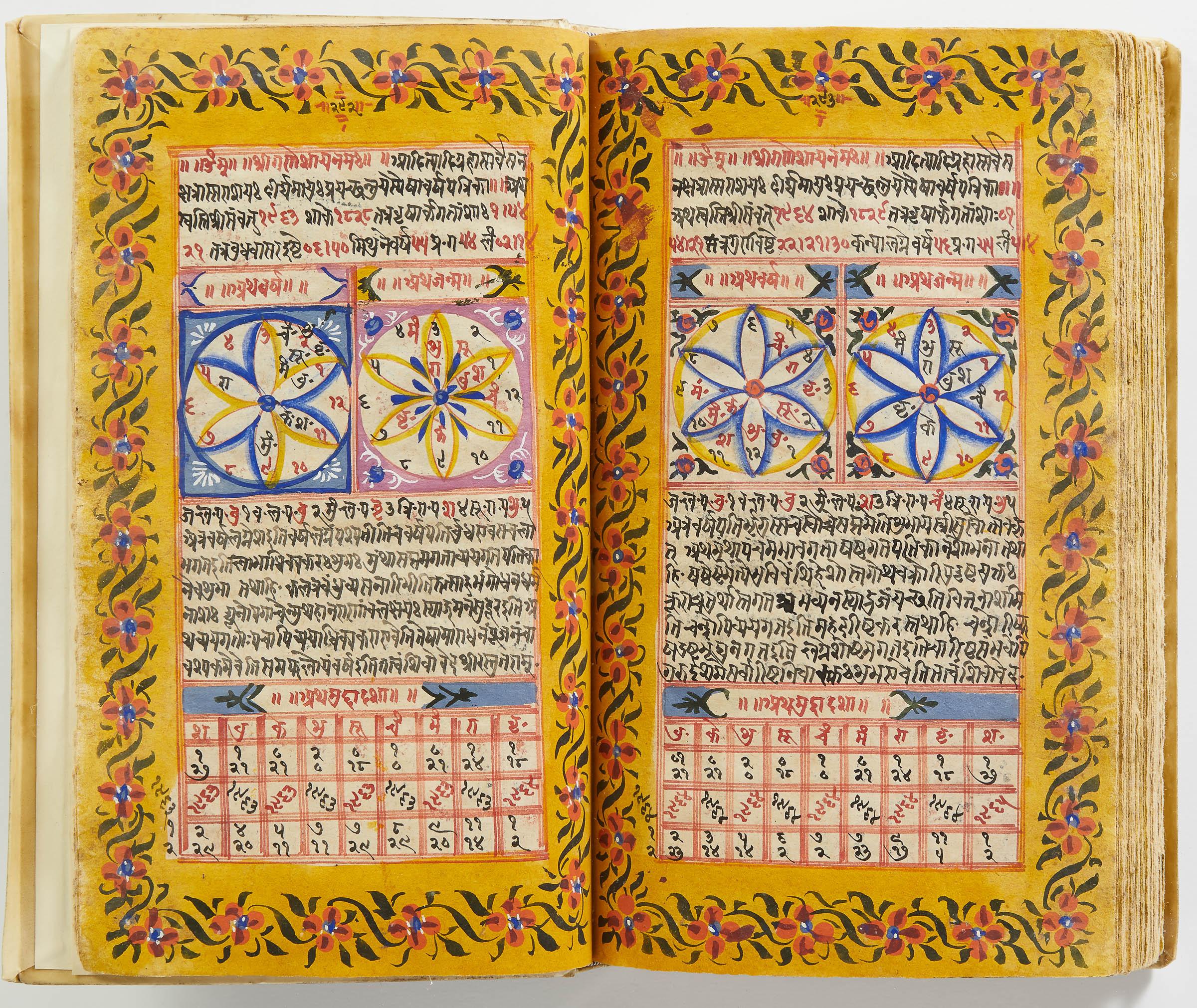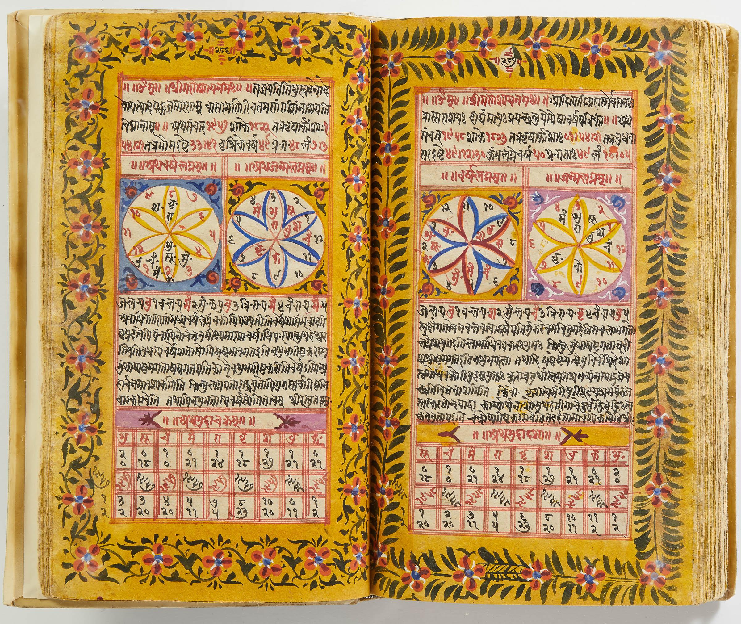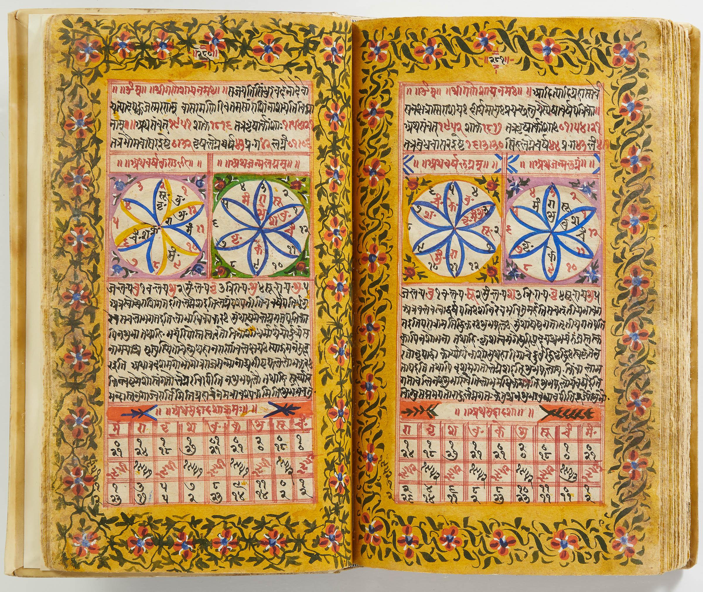 lluminated manuscript in Sanskrit on prepared paper, written in Devanagari script in black and red ink, with a profusion of tables and charts, partly in color, and floral border on each page of text. 101 leaves, the first 2 and last 3 blank. 326x187 mm,