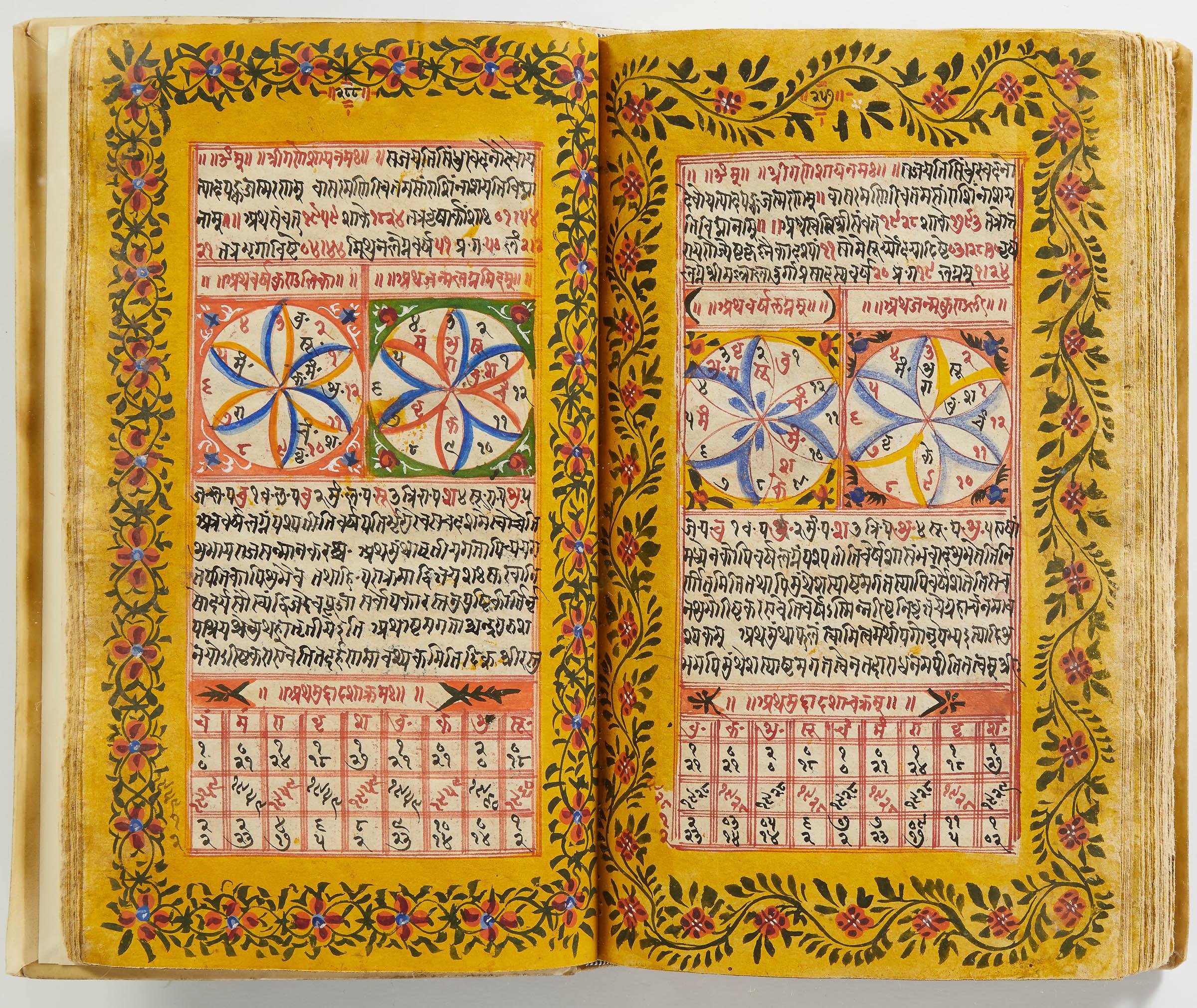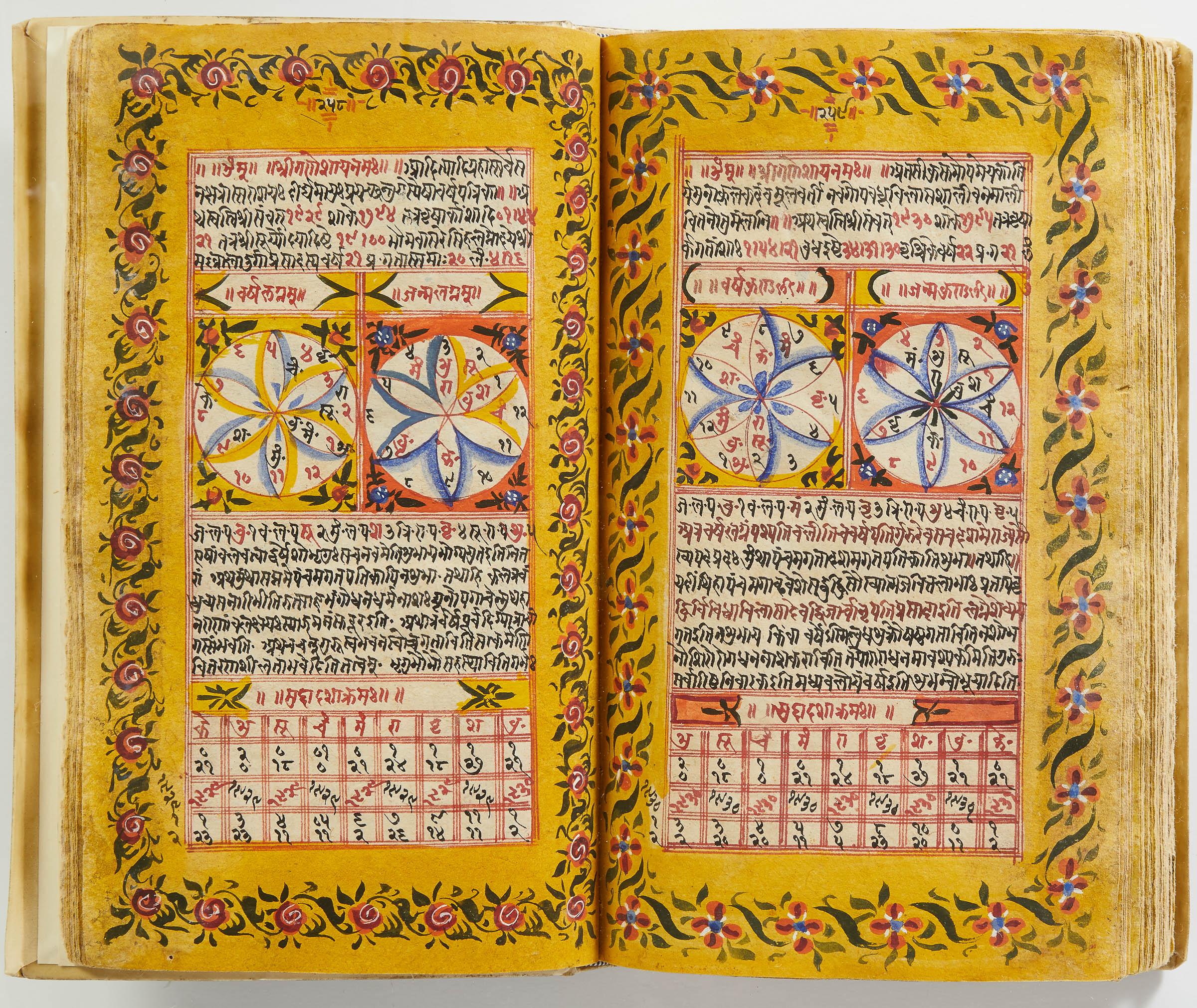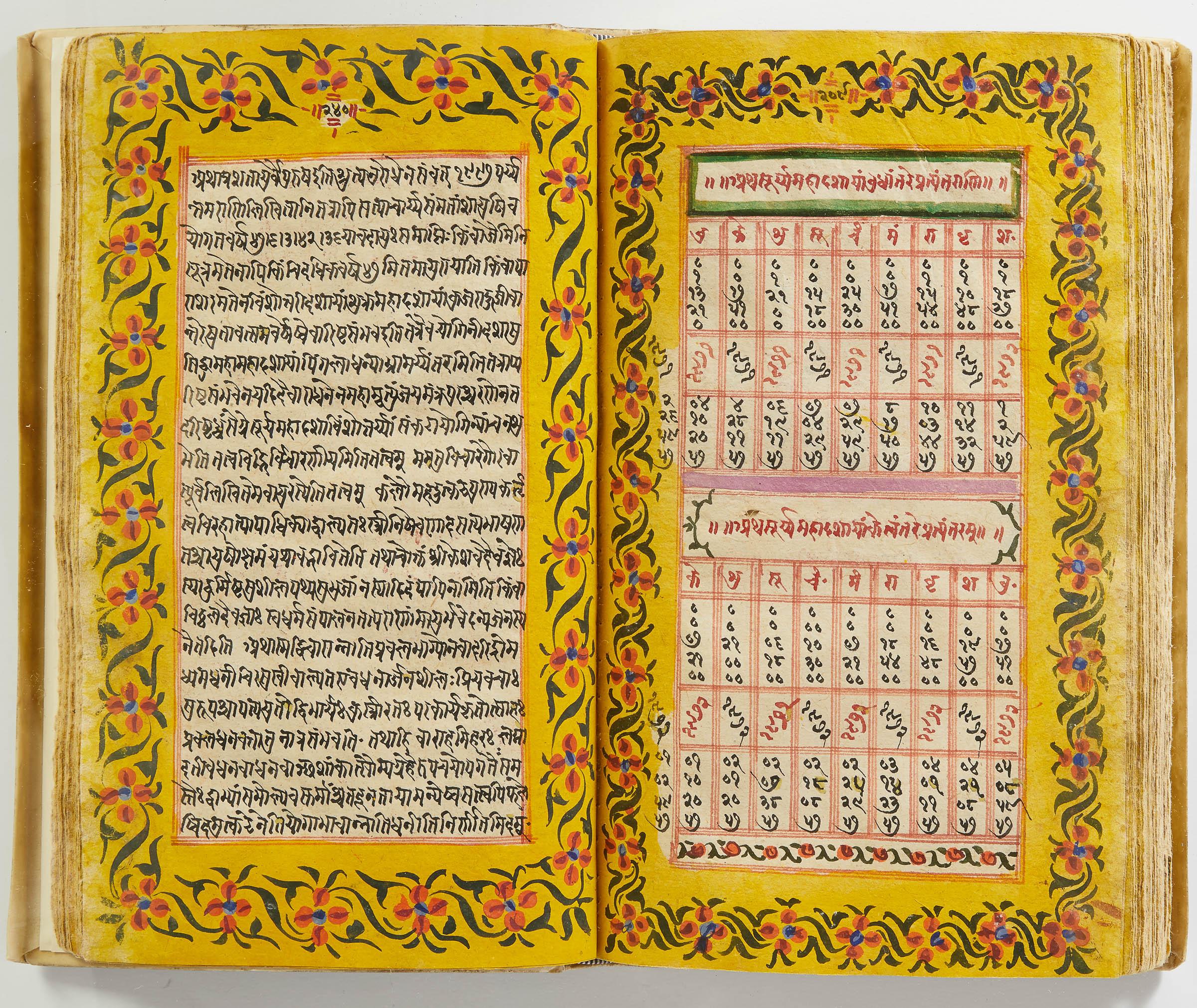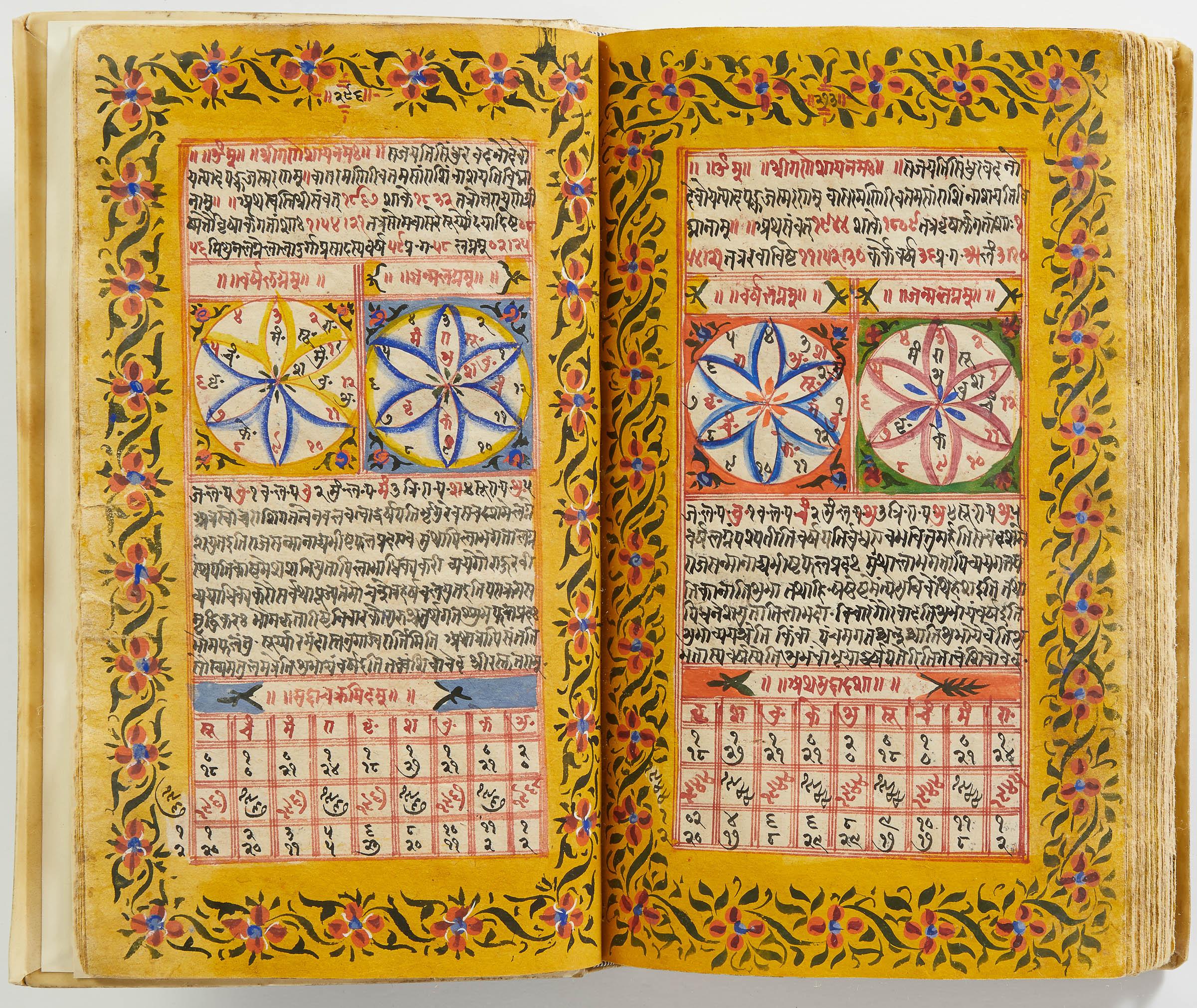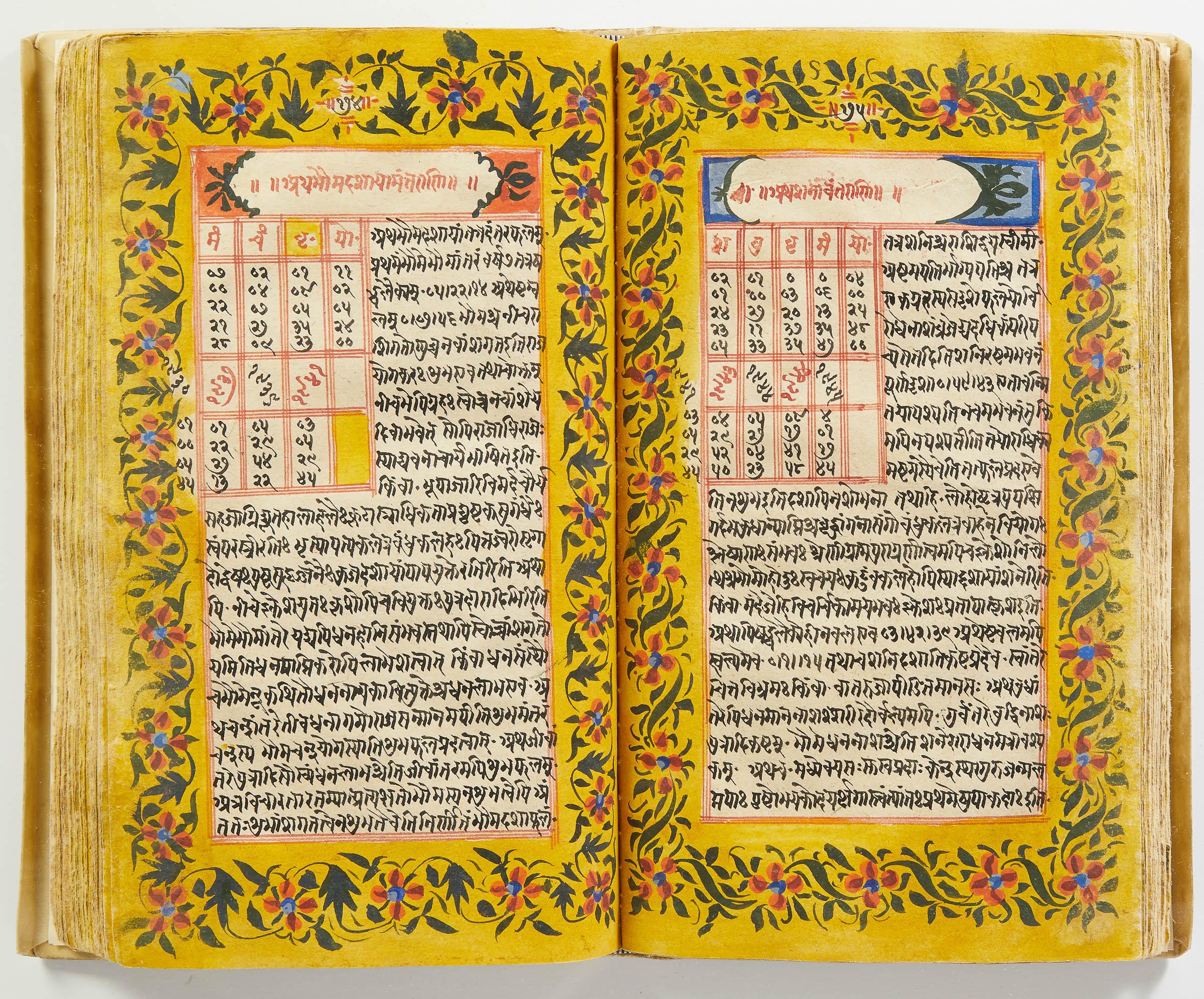 lluminated manuscript in Sanskrit on prepared paper, written in Devanagari script in black and red ink, with a profusion of tables and charts, partly in color, and floral border on each page of text. 101 leaves, the first 2 and last 3 blank. 326x187 mm,
