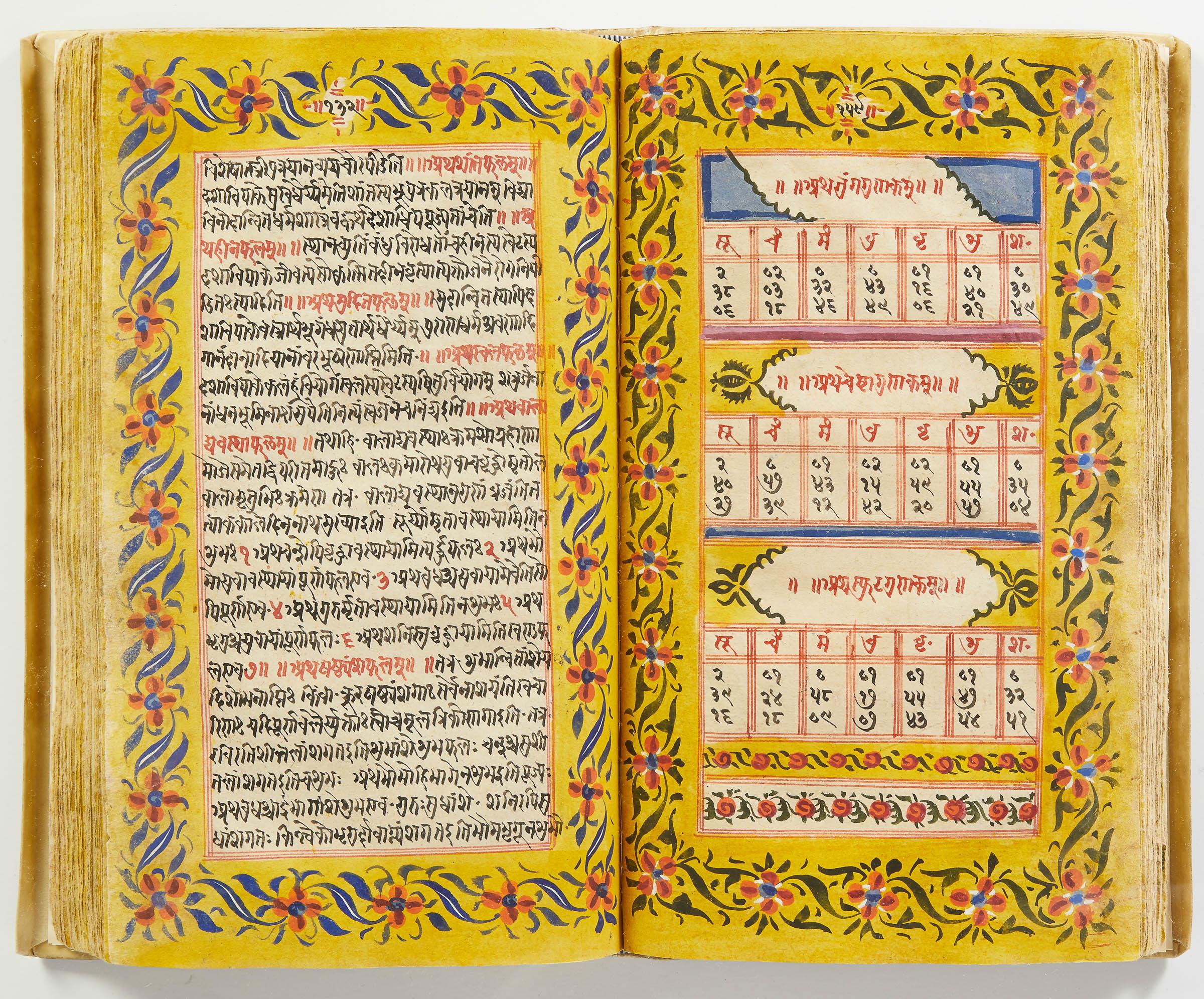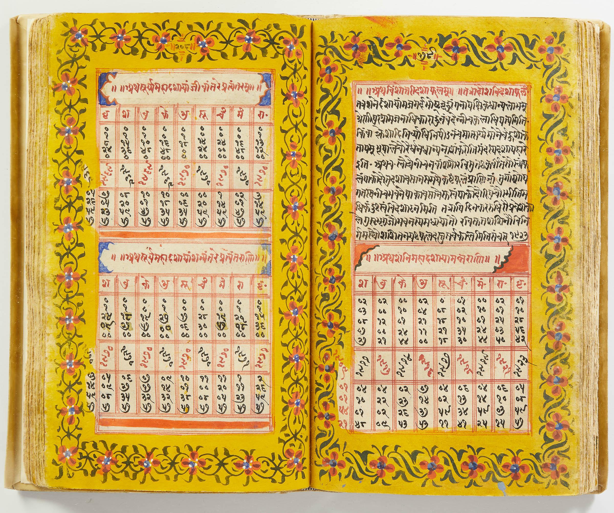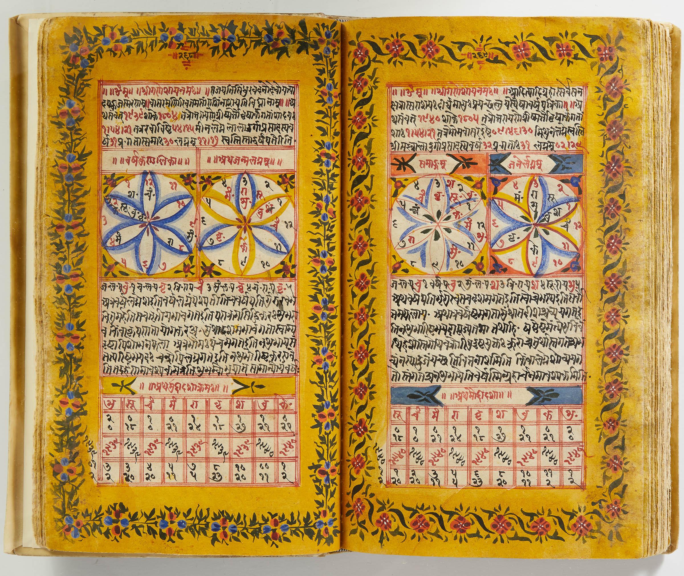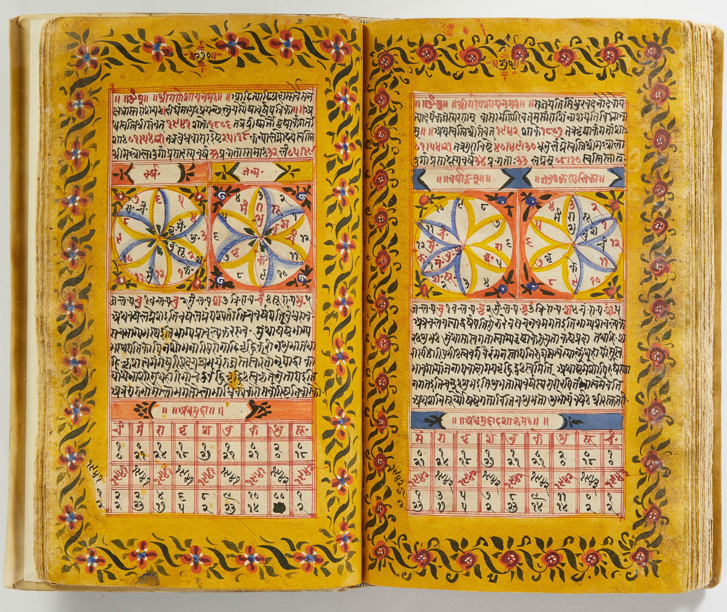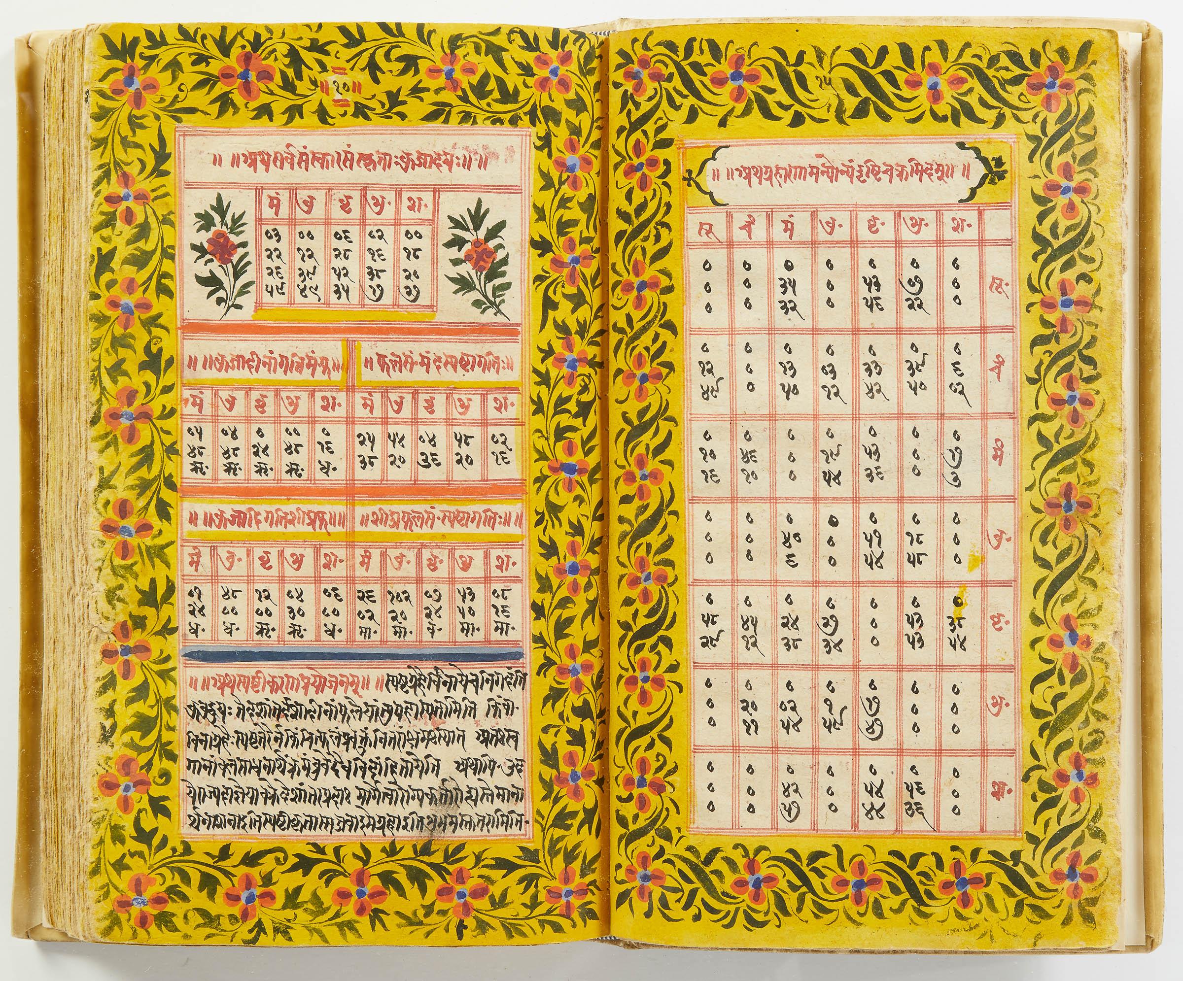 lluminated manuscript in Sanskrit on prepared paper, written in Devanagari script in black and red ink, with a profusion of tables and charts, partly in color, and floral border on each page of text. 101 leaves, the first 2 and last 3 blank. 326x187 mm,