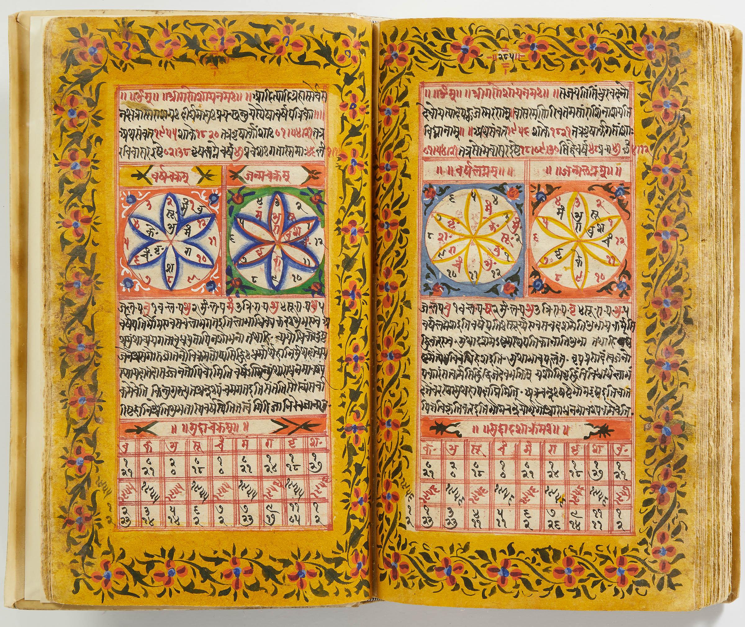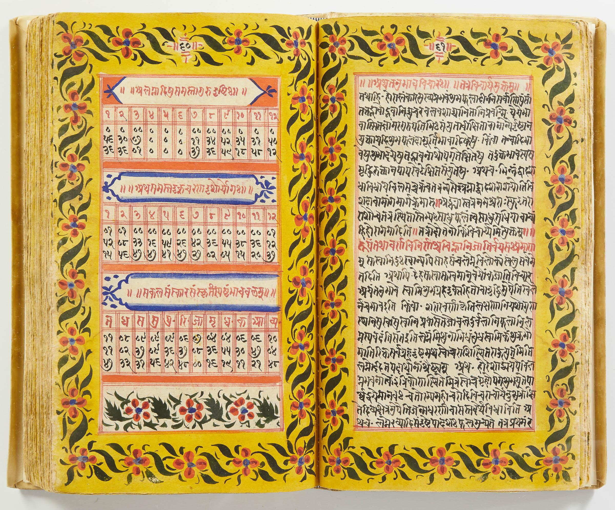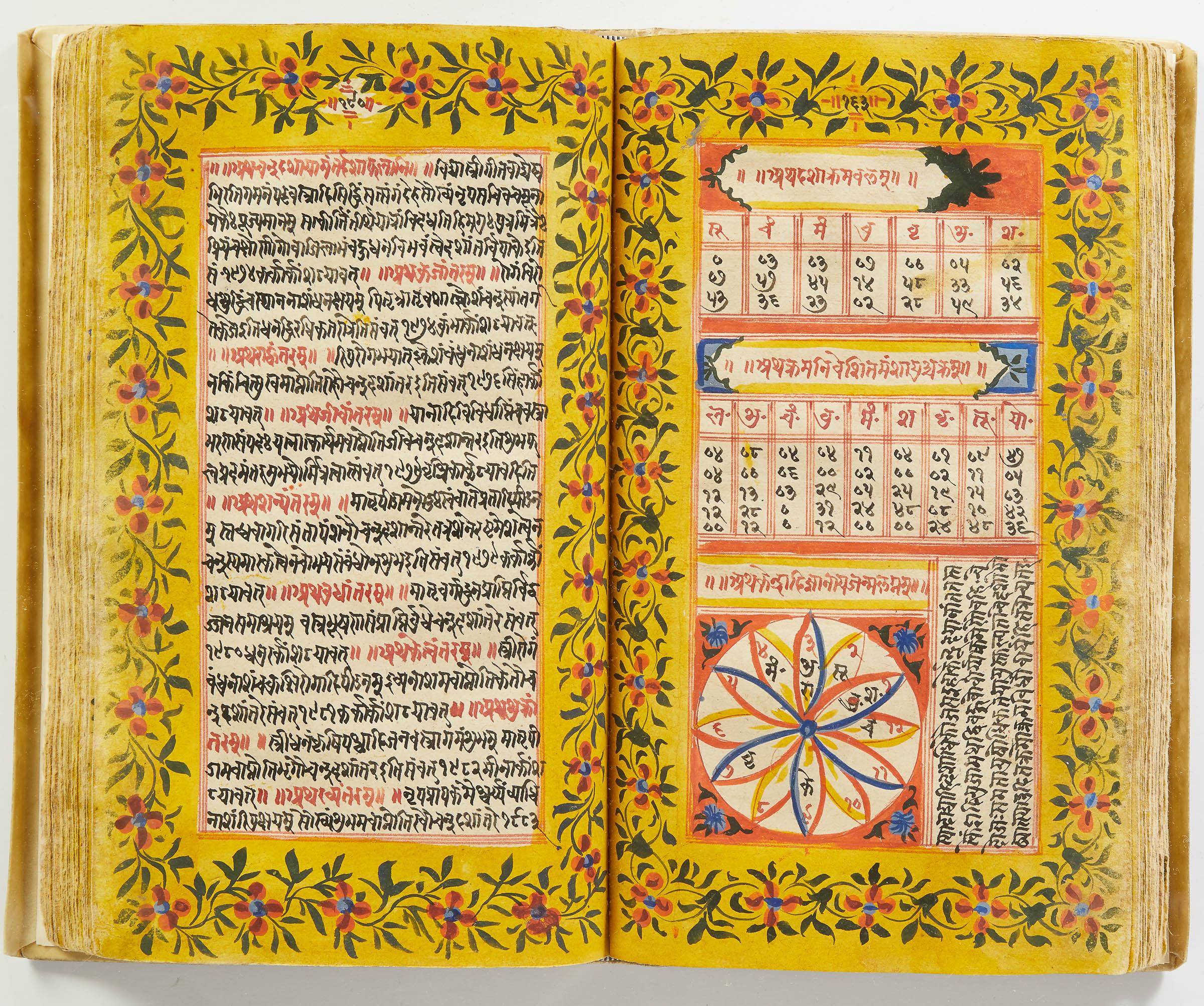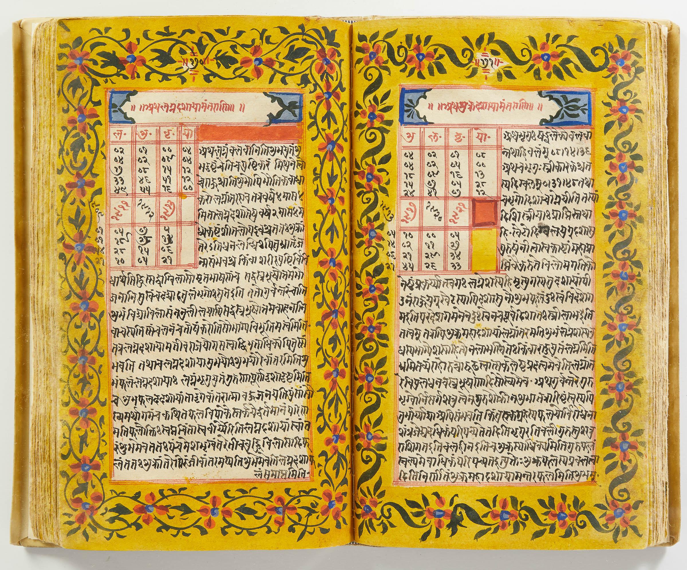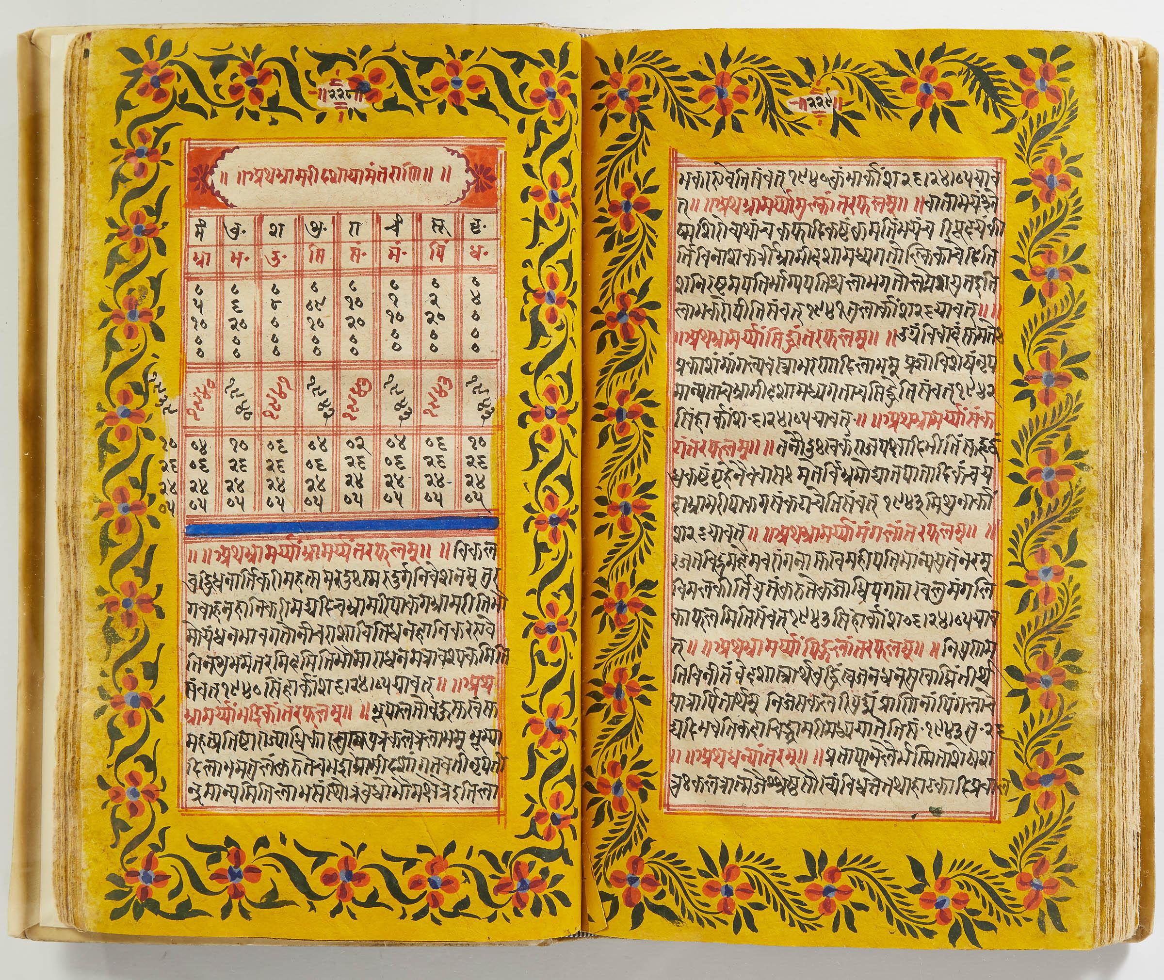 lluminated manuscript in Sanskrit on prepared paper, written in Devanagari script in black and red ink, with a profusion of tables and charts, partly in color, and floral border on each page of text. 101 leaves, the first 2 and last 3 blank. 326x187 mm,