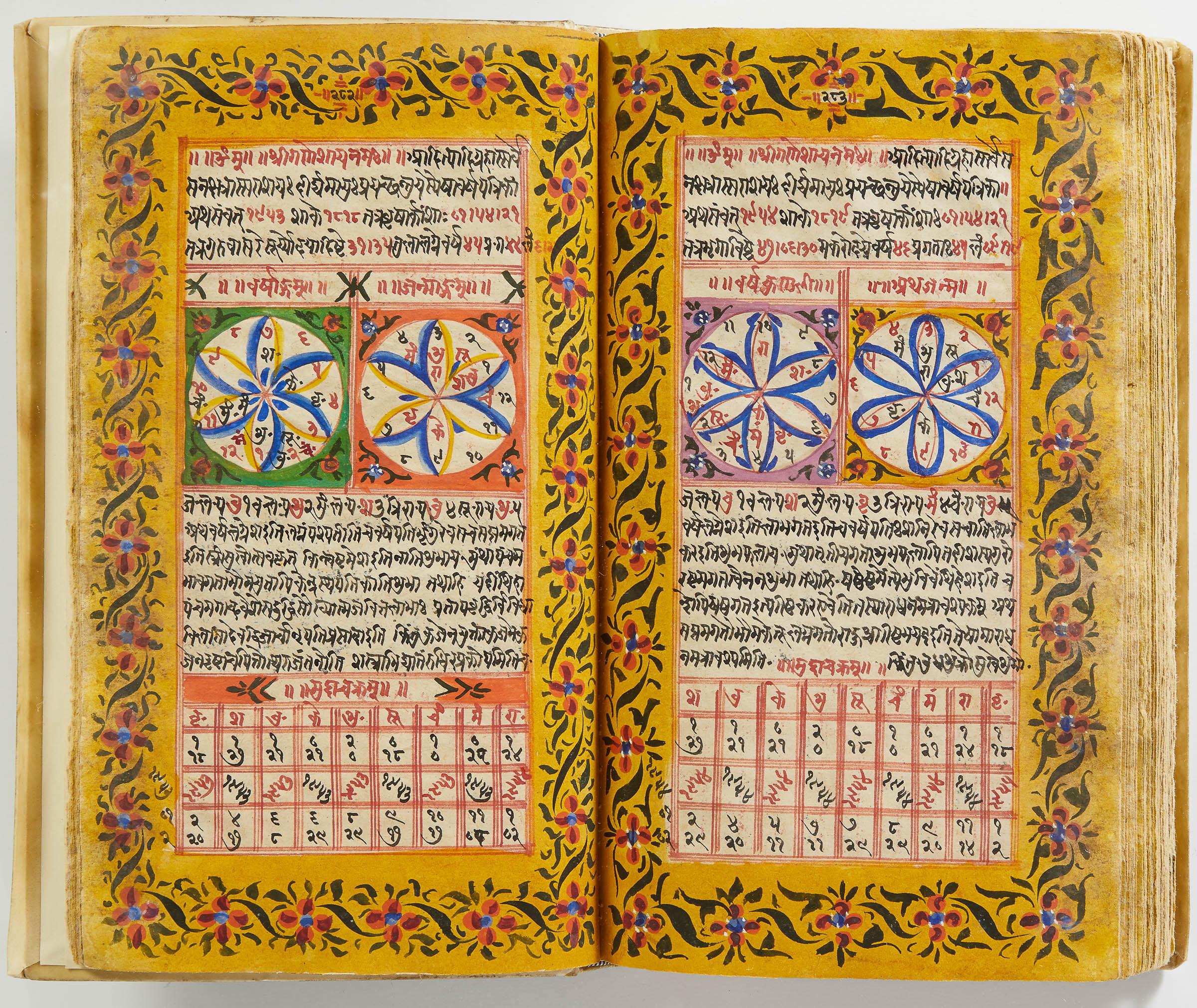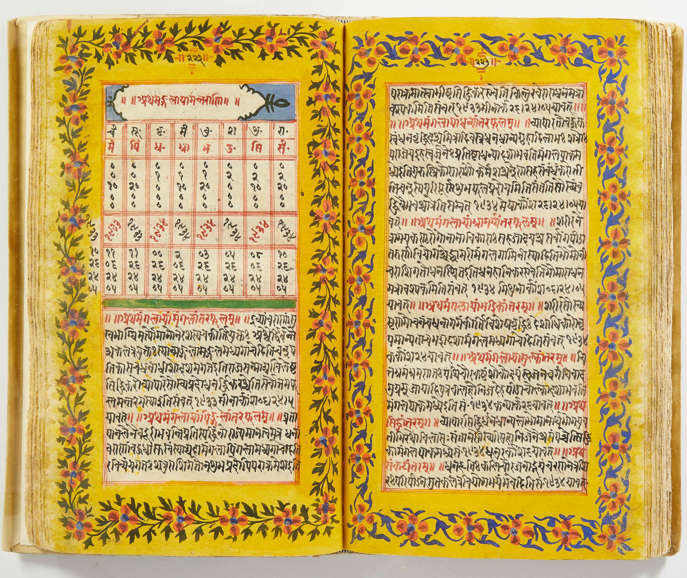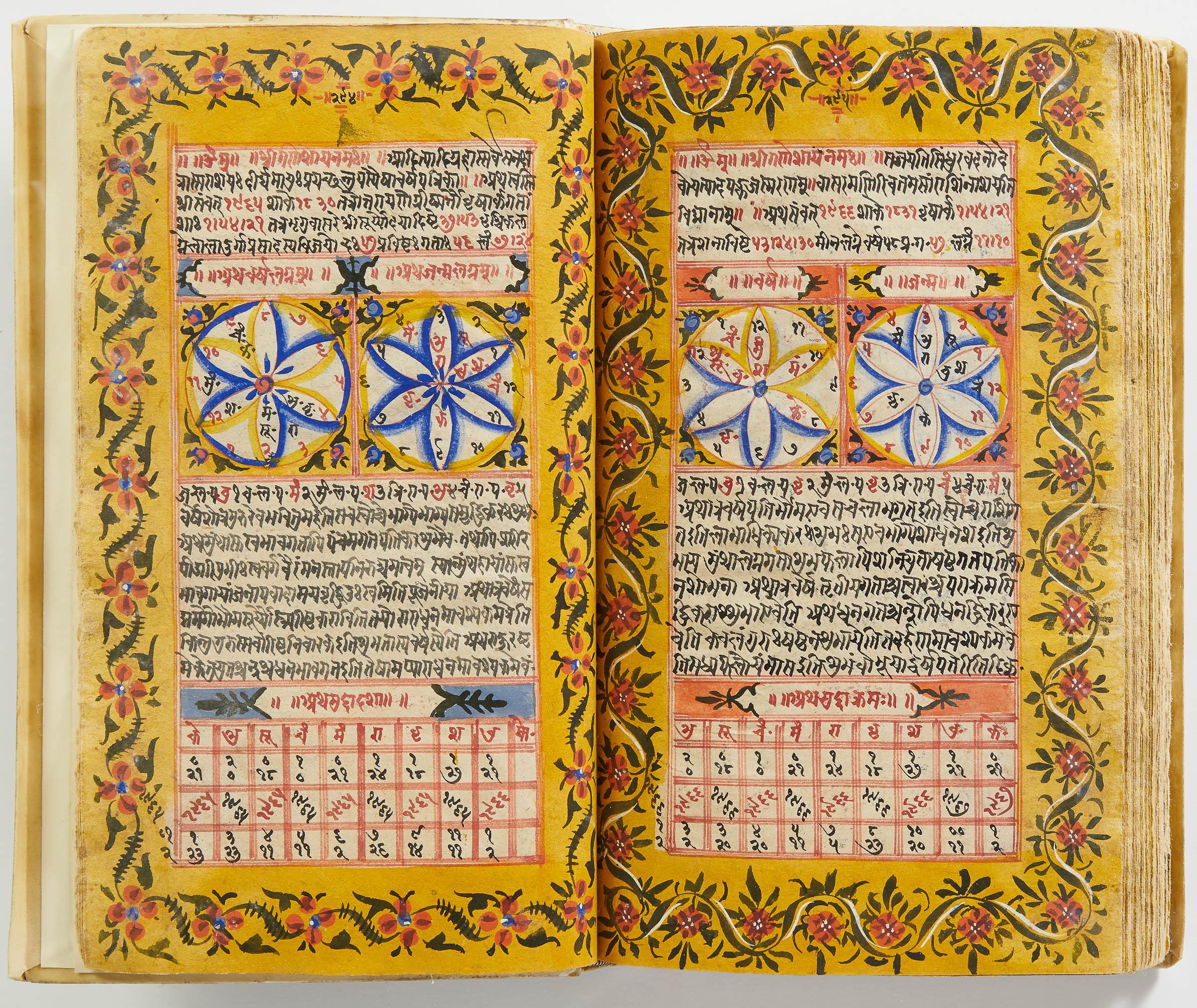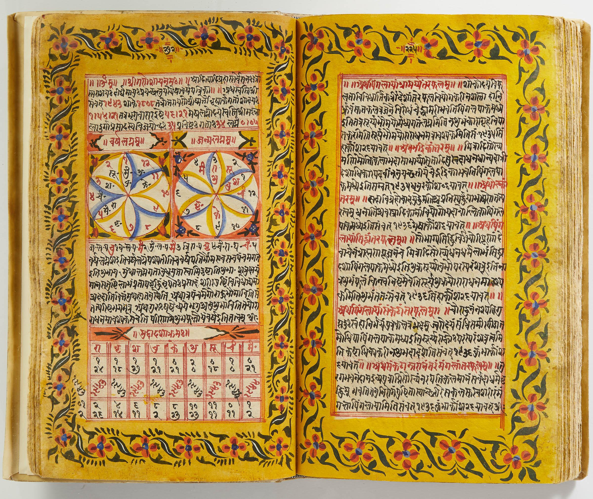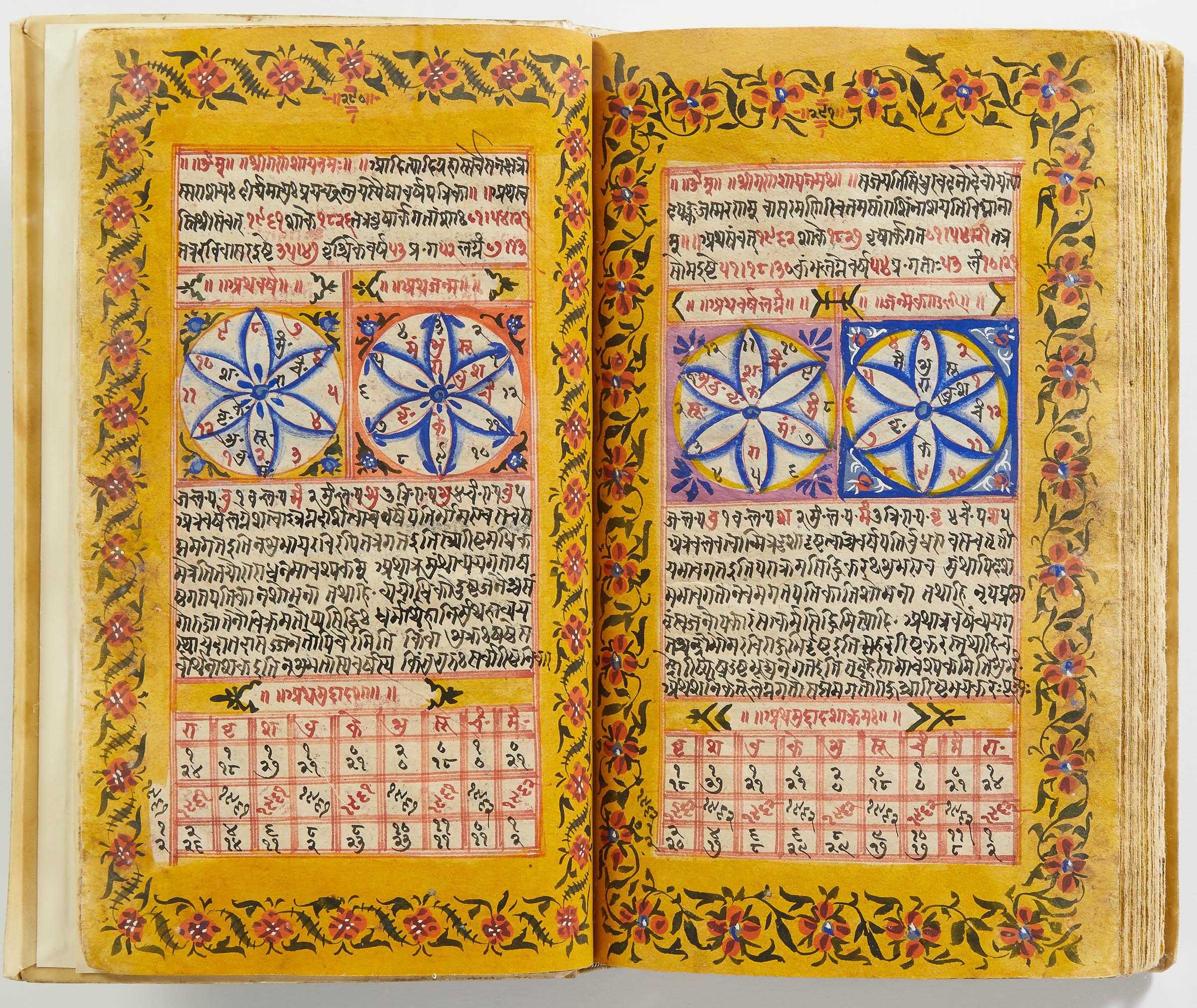 lluminated manuscript in Sanskrit on prepared paper, written in Devanagari script in black and red ink, with a profusion of tables and charts, partly in color, and floral border on each page of text. 101 leaves, the first 2 and last 3 blank. 326x187 mm,