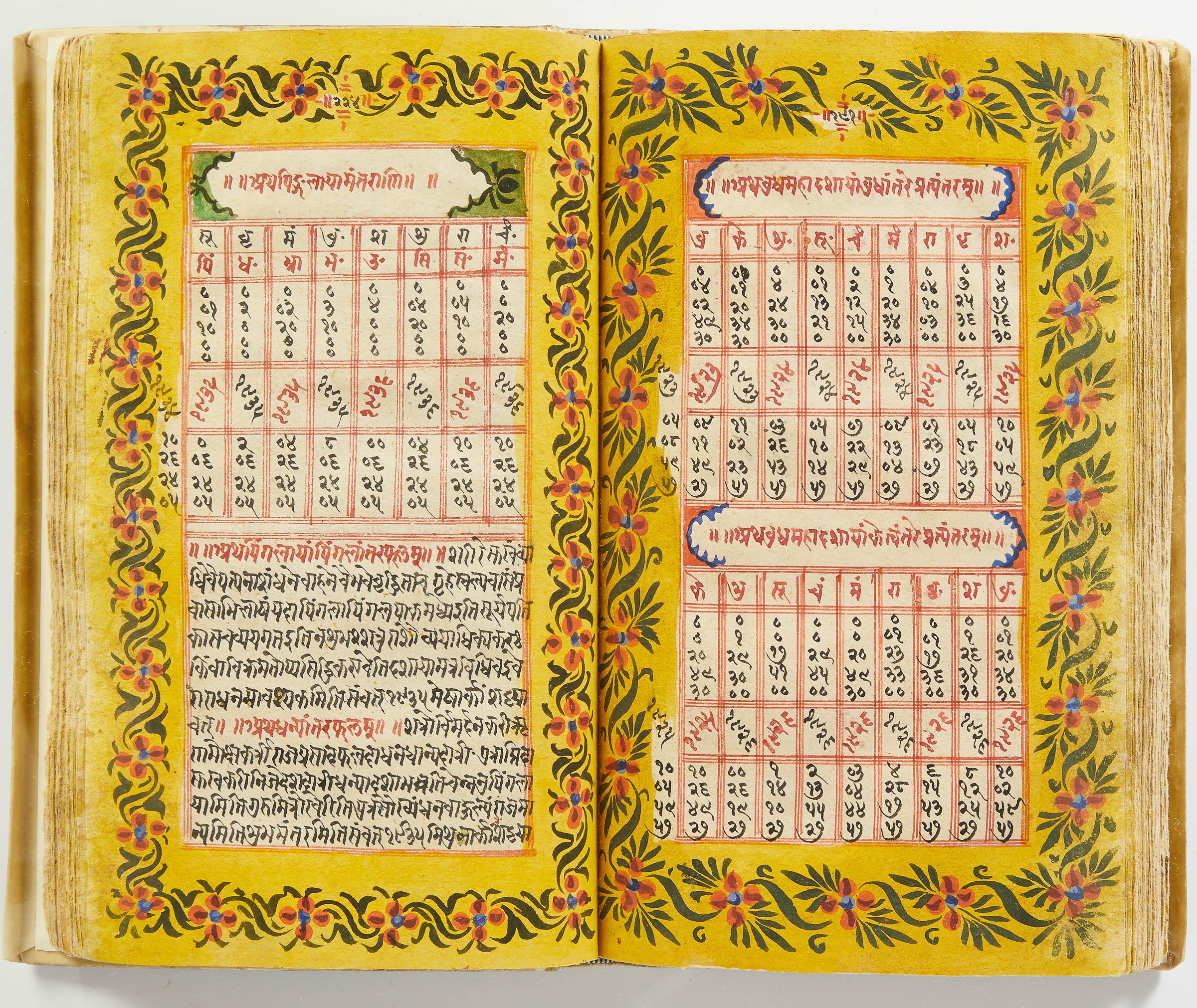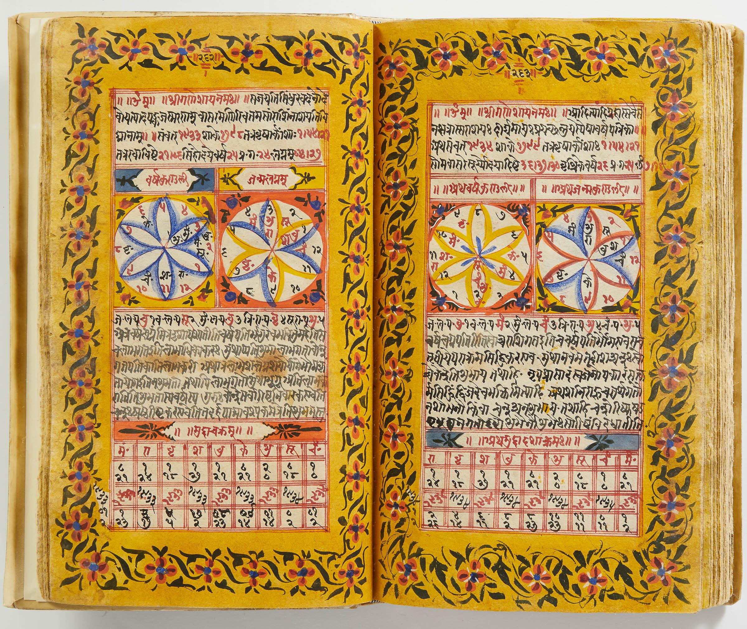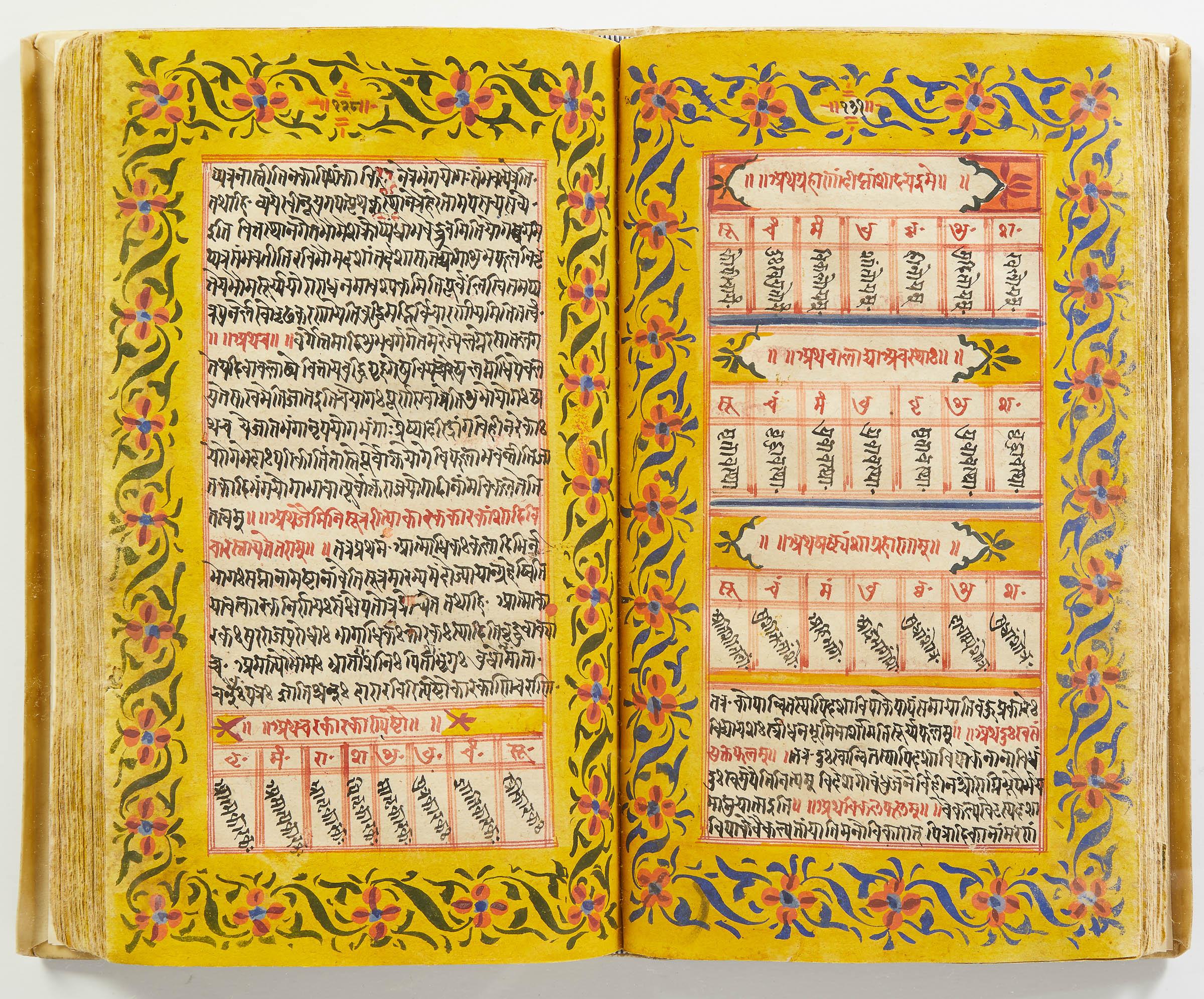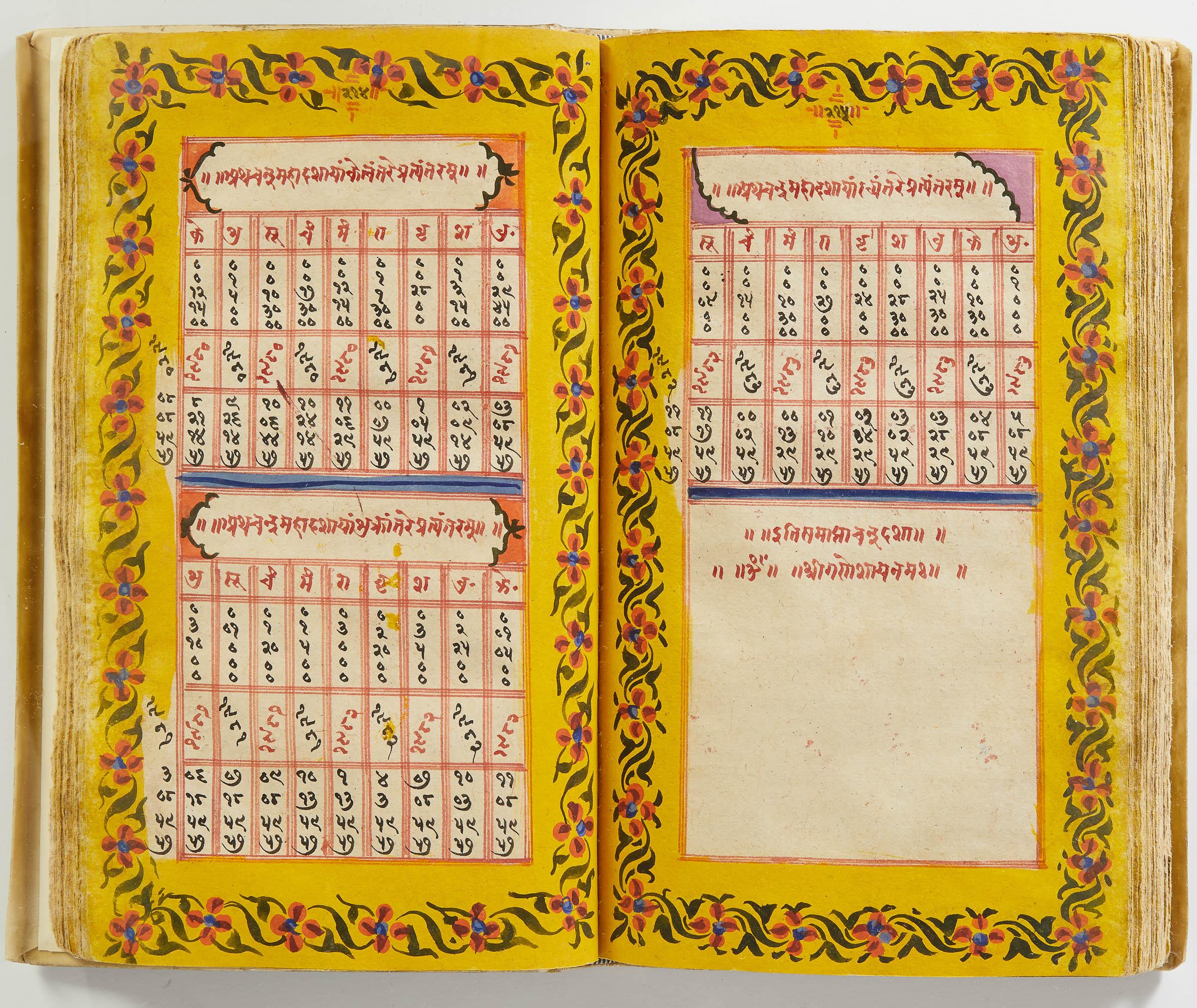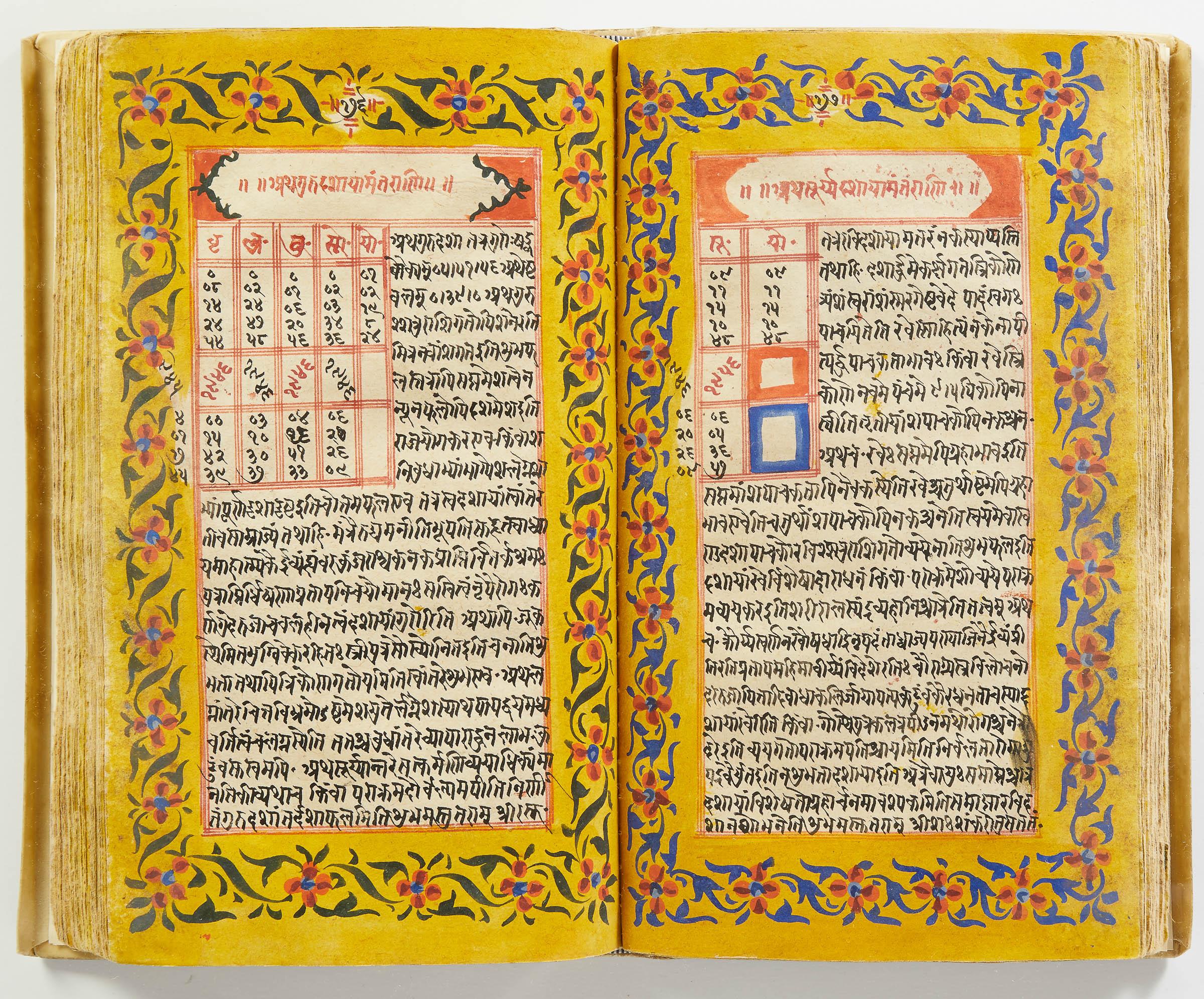 lluminated manuscript in Sanskrit on prepared paper, written in Devanagari script in black and red ink, with a profusion of tables and charts, partly in color, and floral border on each page of text. 101 leaves, the first 2 and last 3 blank. 326x187 mm,