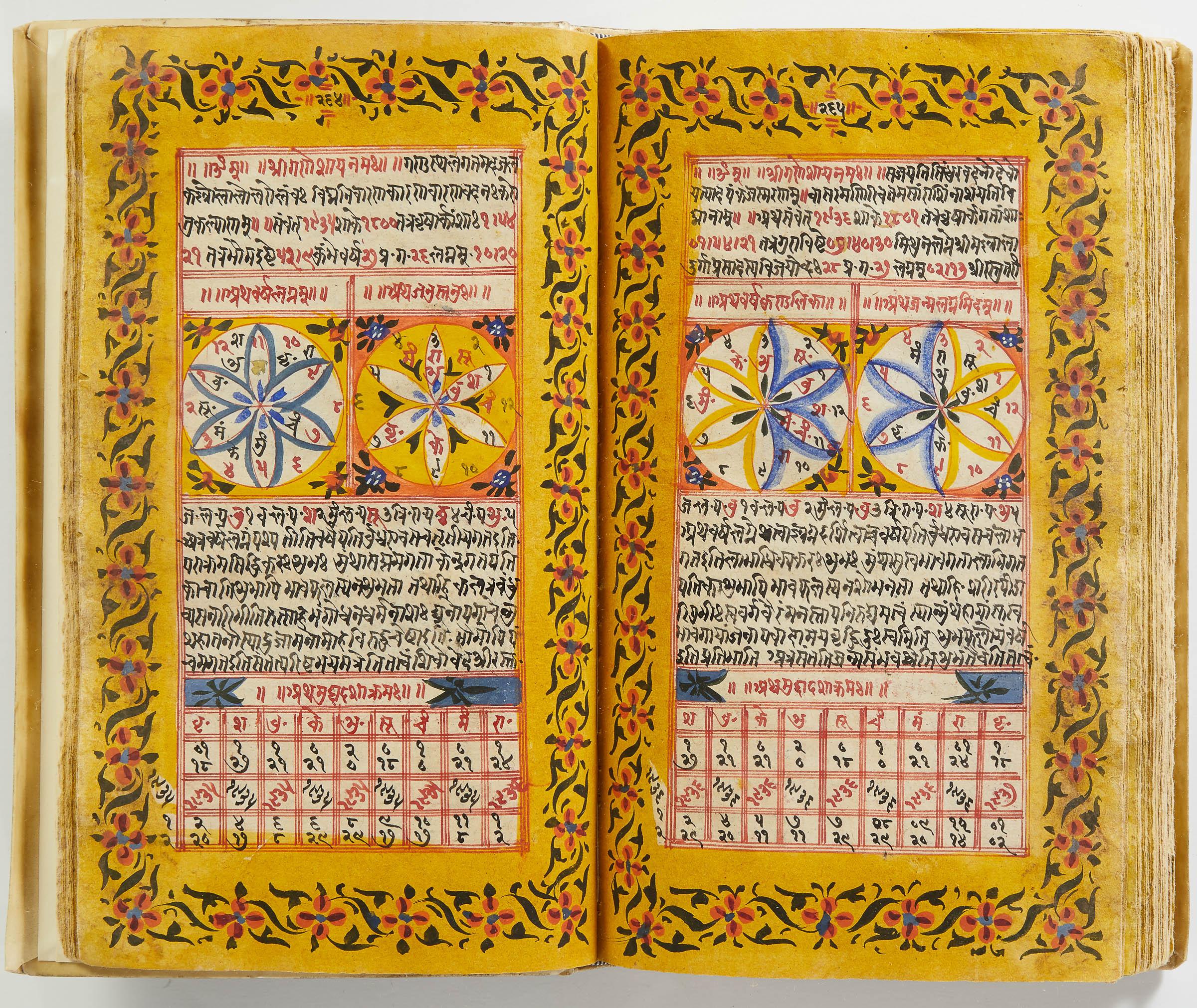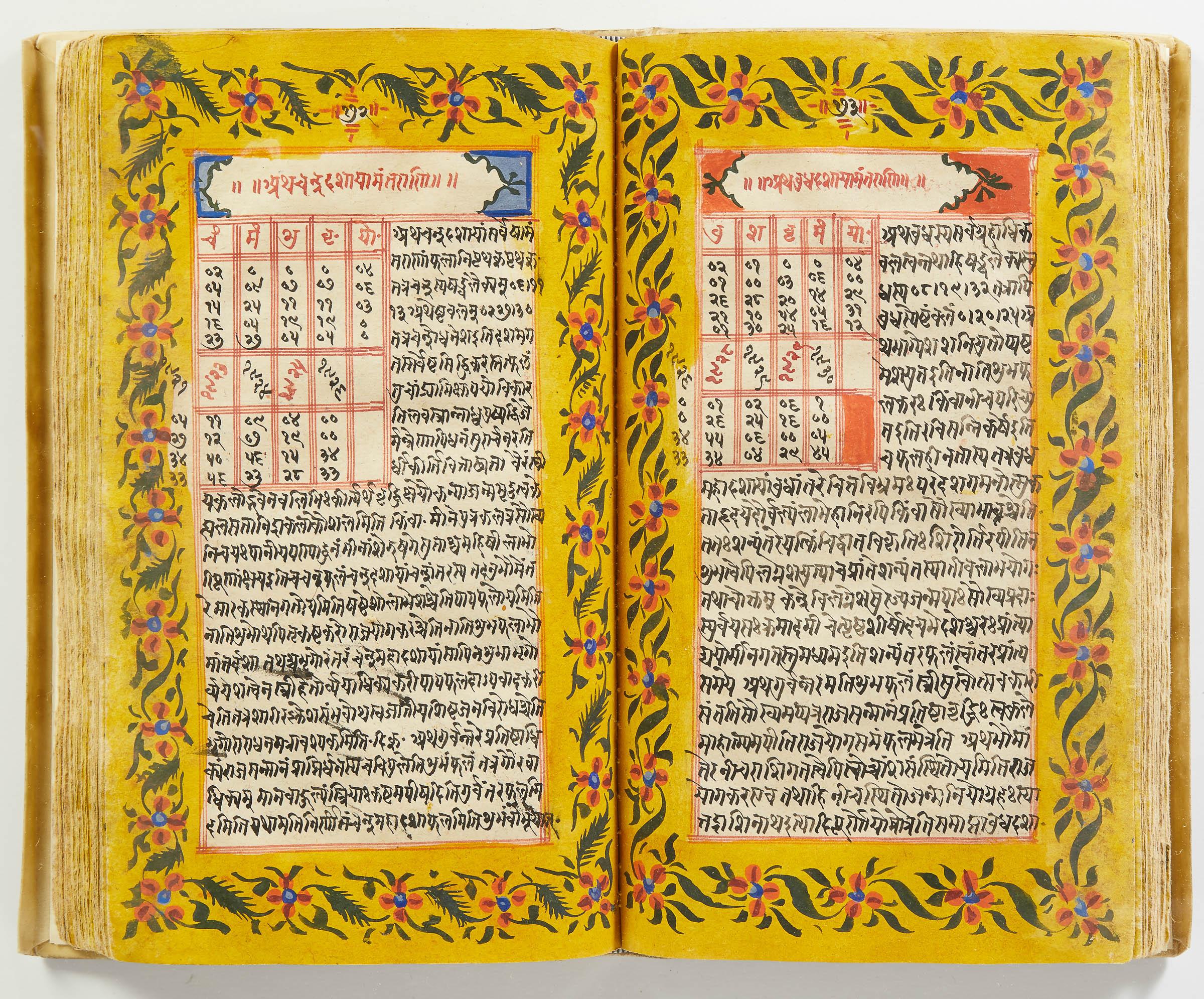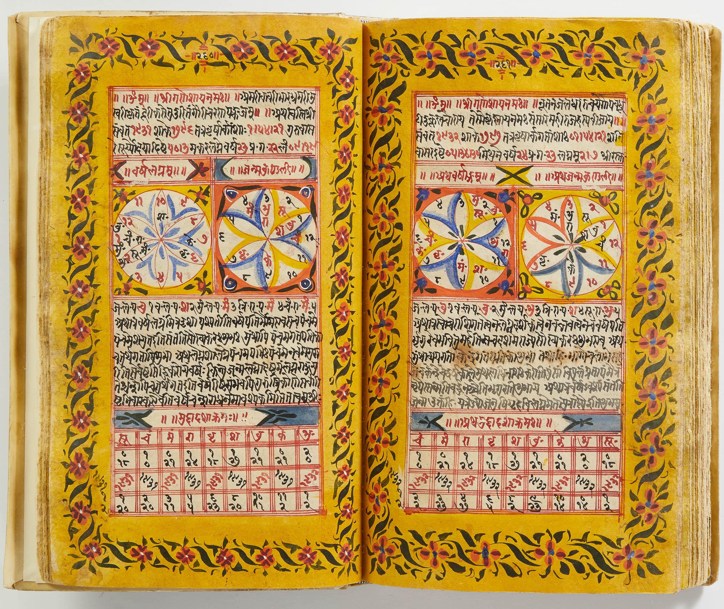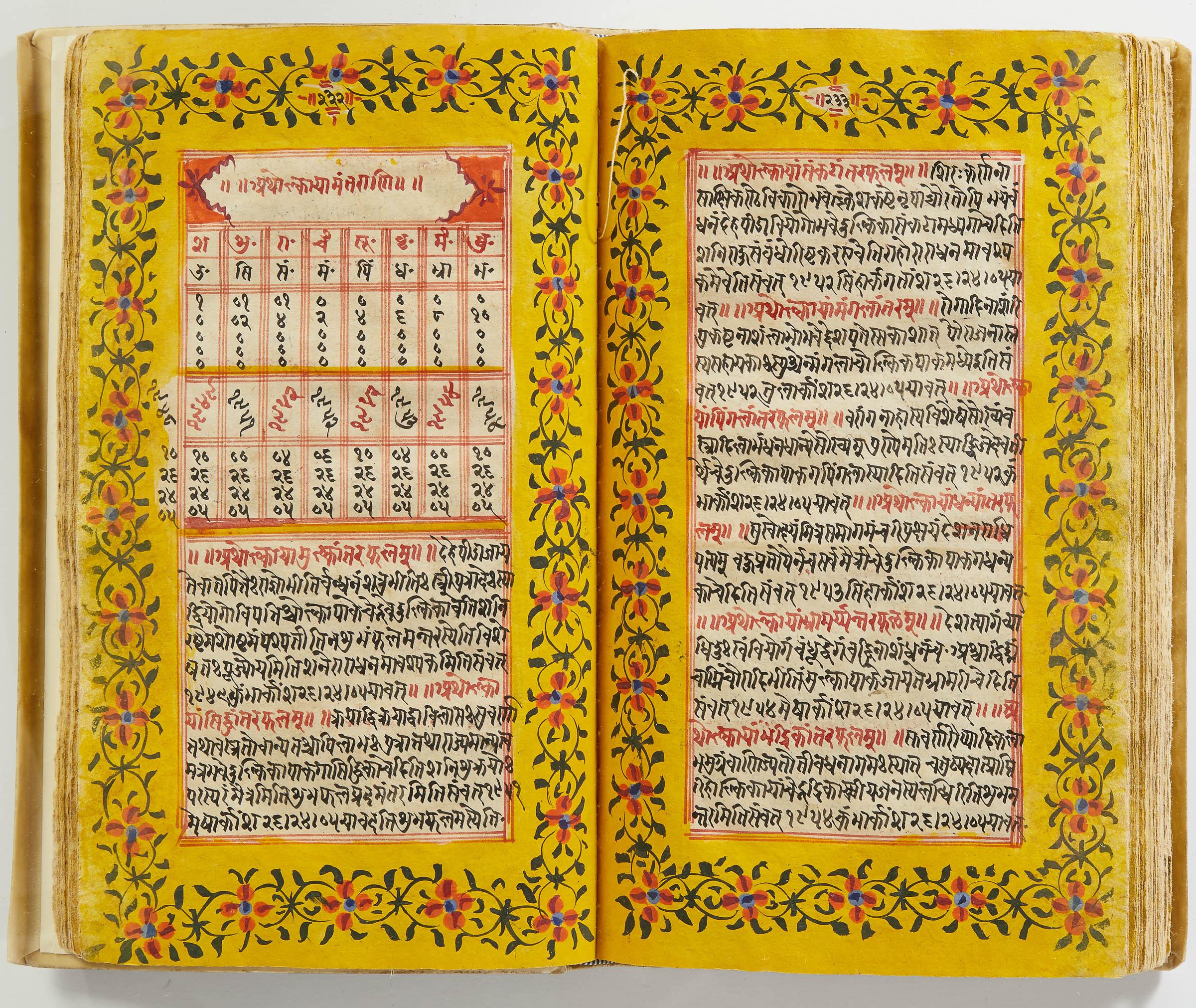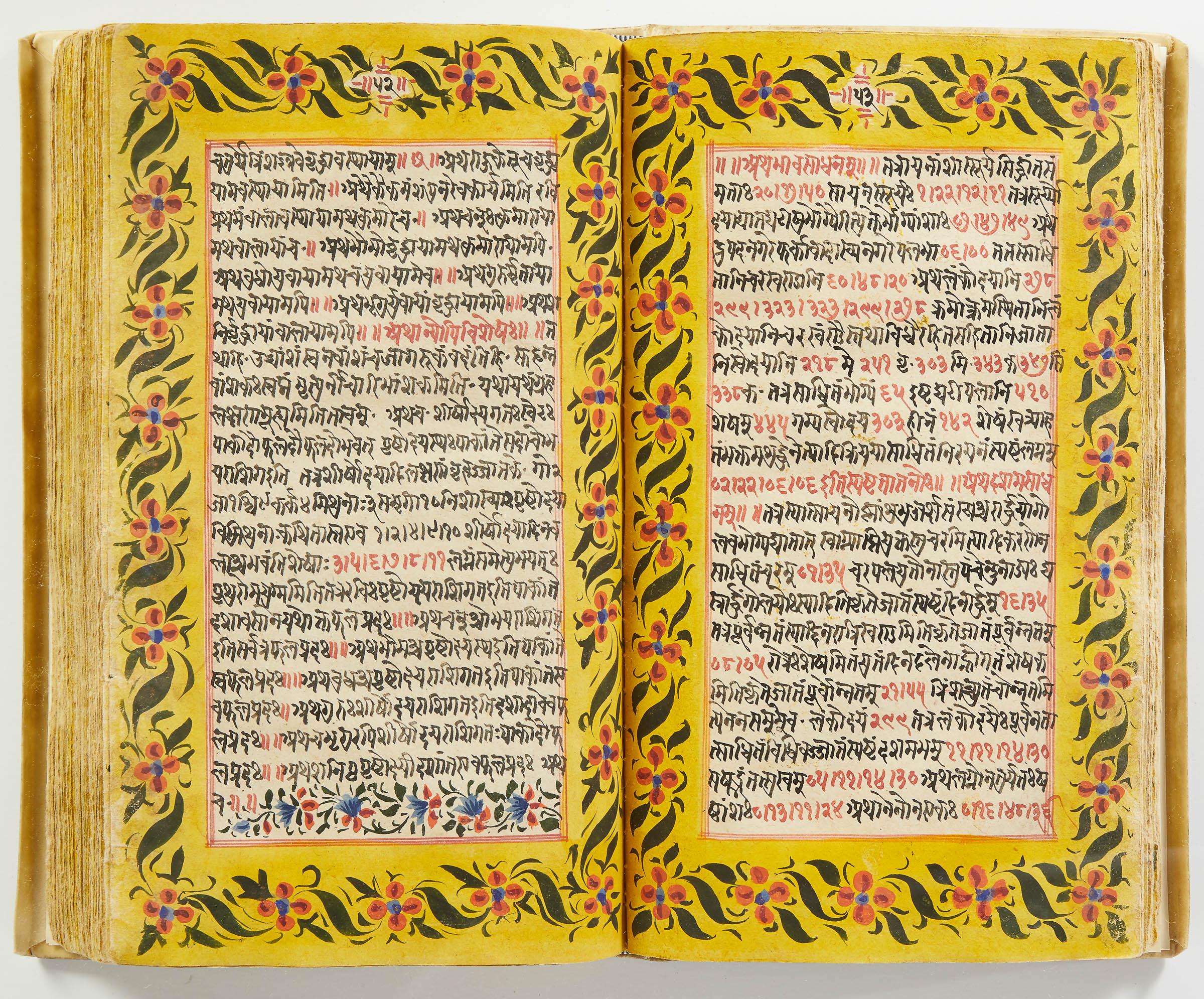 lluminated manuscript in Sanskrit on prepared paper, written in Devanagari script in black and red ink, with a profusion of tables and charts, partly in color, and floral border on each page of text. 101 leaves, the first 2 and last 3 blank. 326x187 mm,