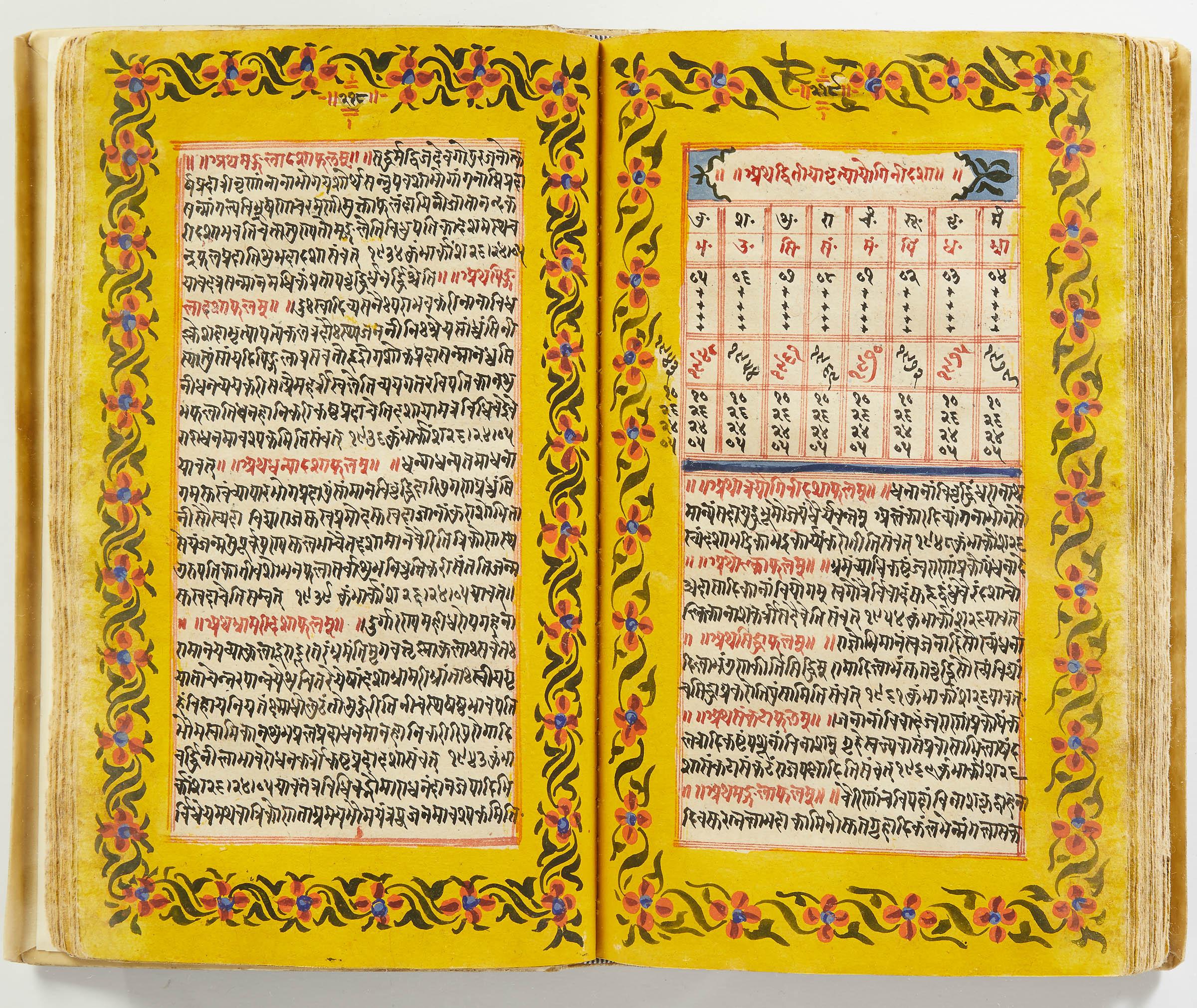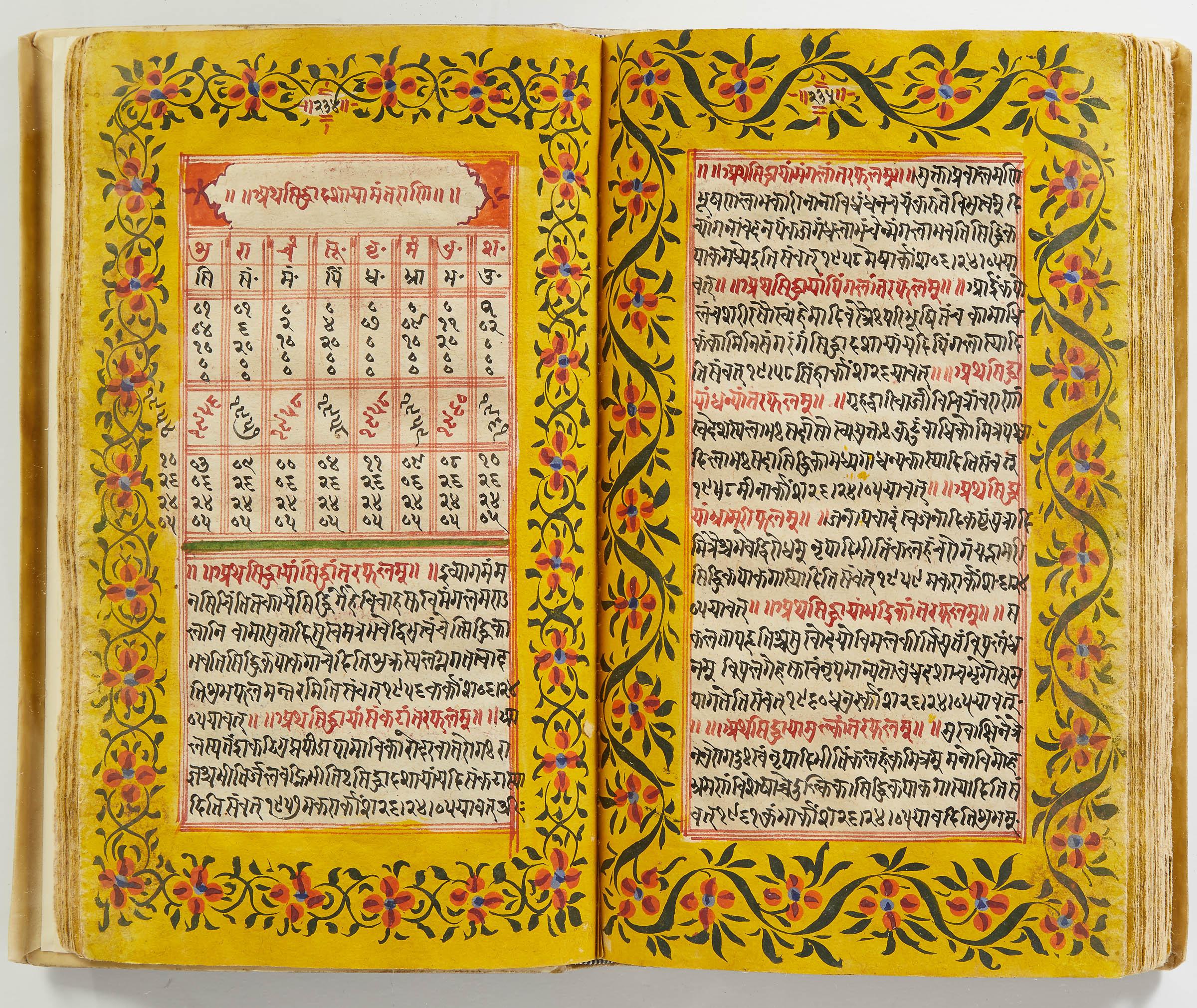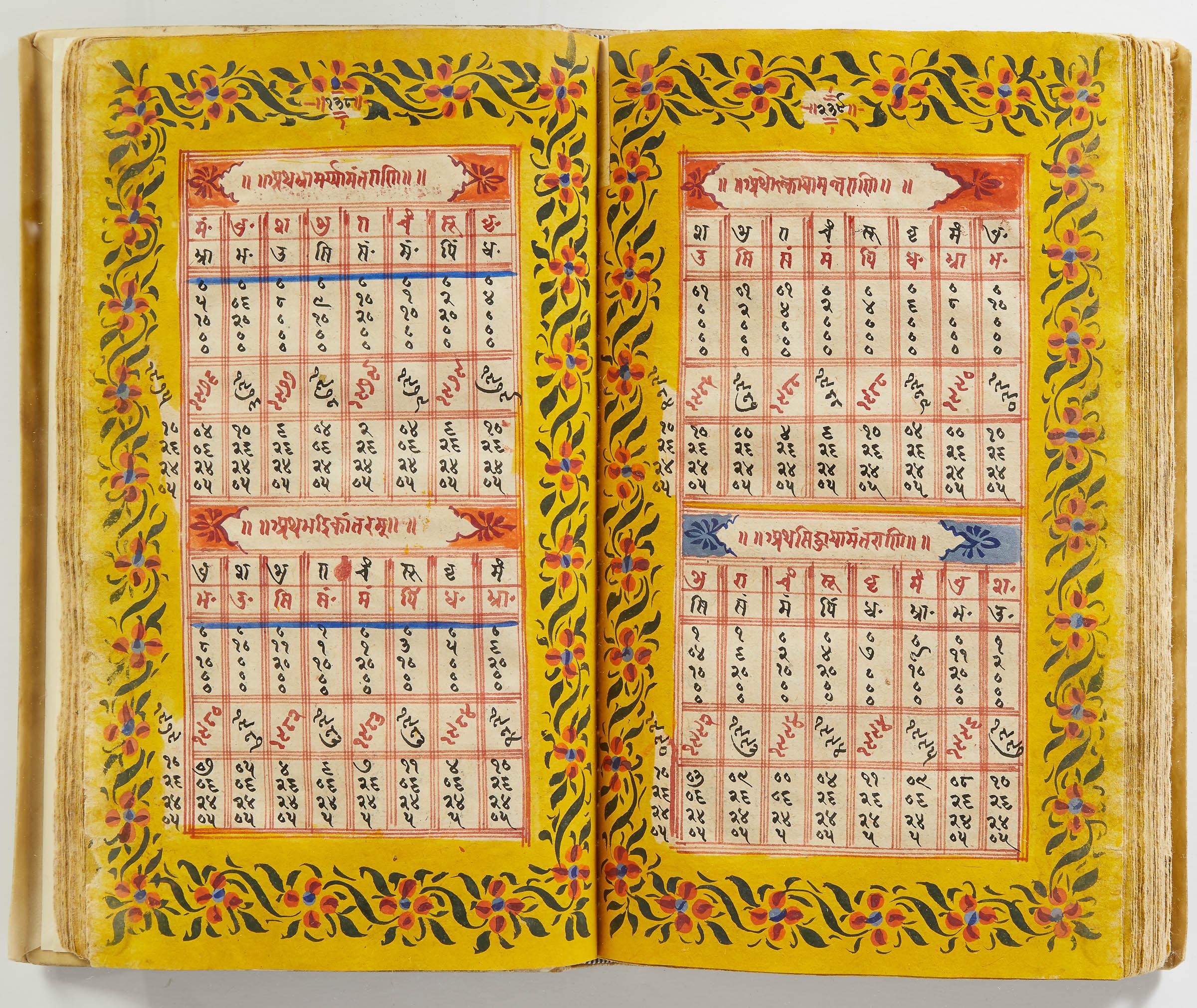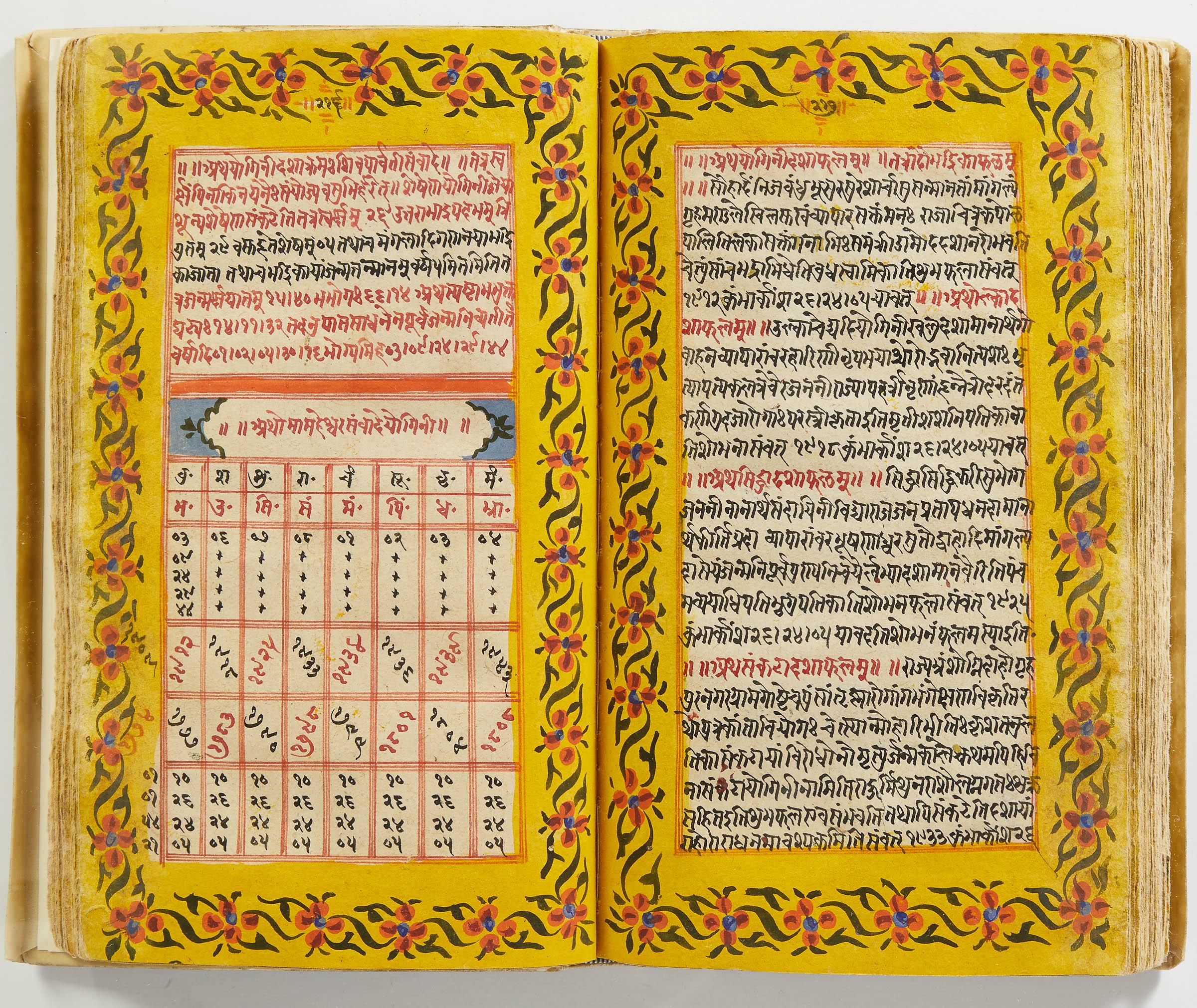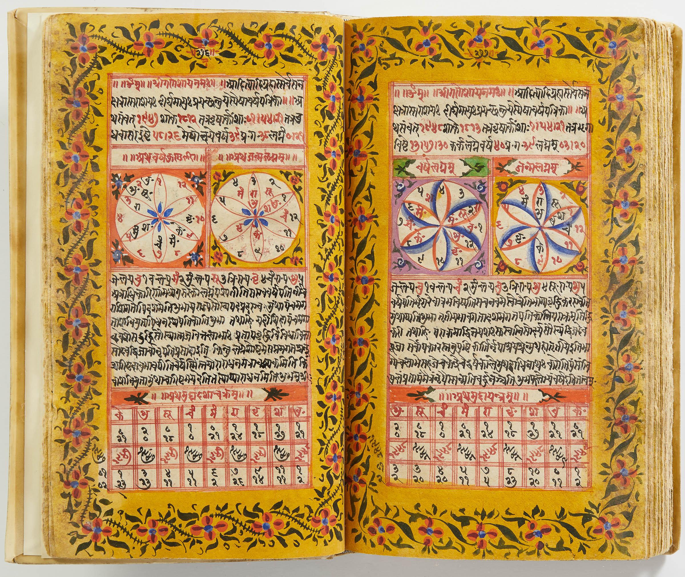 lluminated manuscript in Sanskrit on prepared paper, written in Devanagari script in black and red ink, with a profusion of tables and charts, partly in color, and floral border on each page of text. 101 leaves, the first 2 and last 3 blank. 326x187 mm,