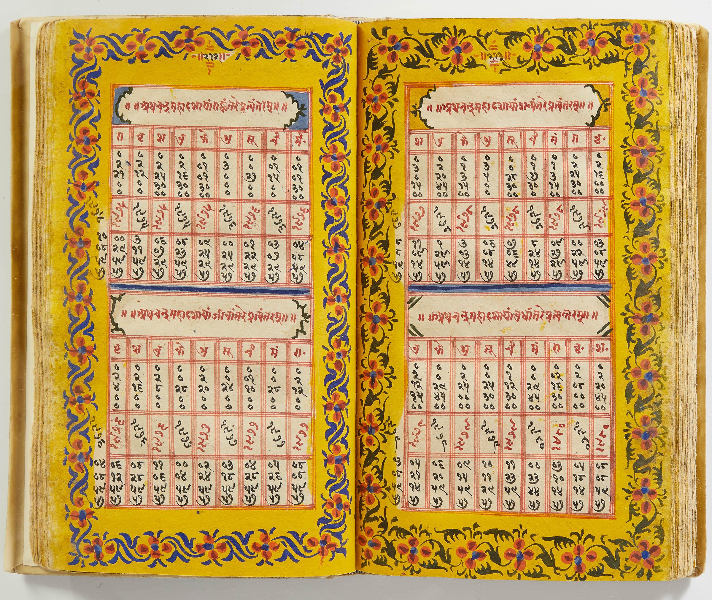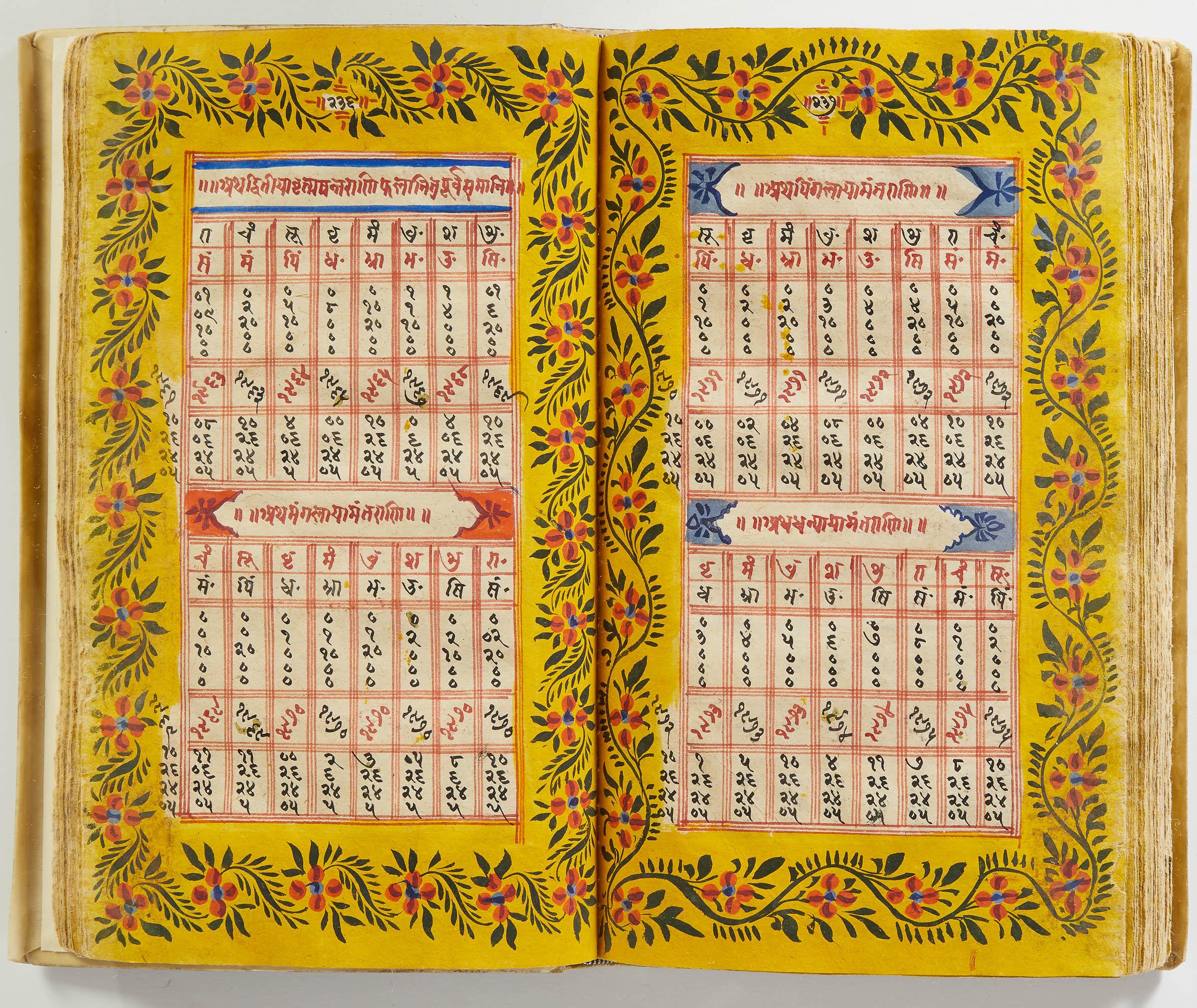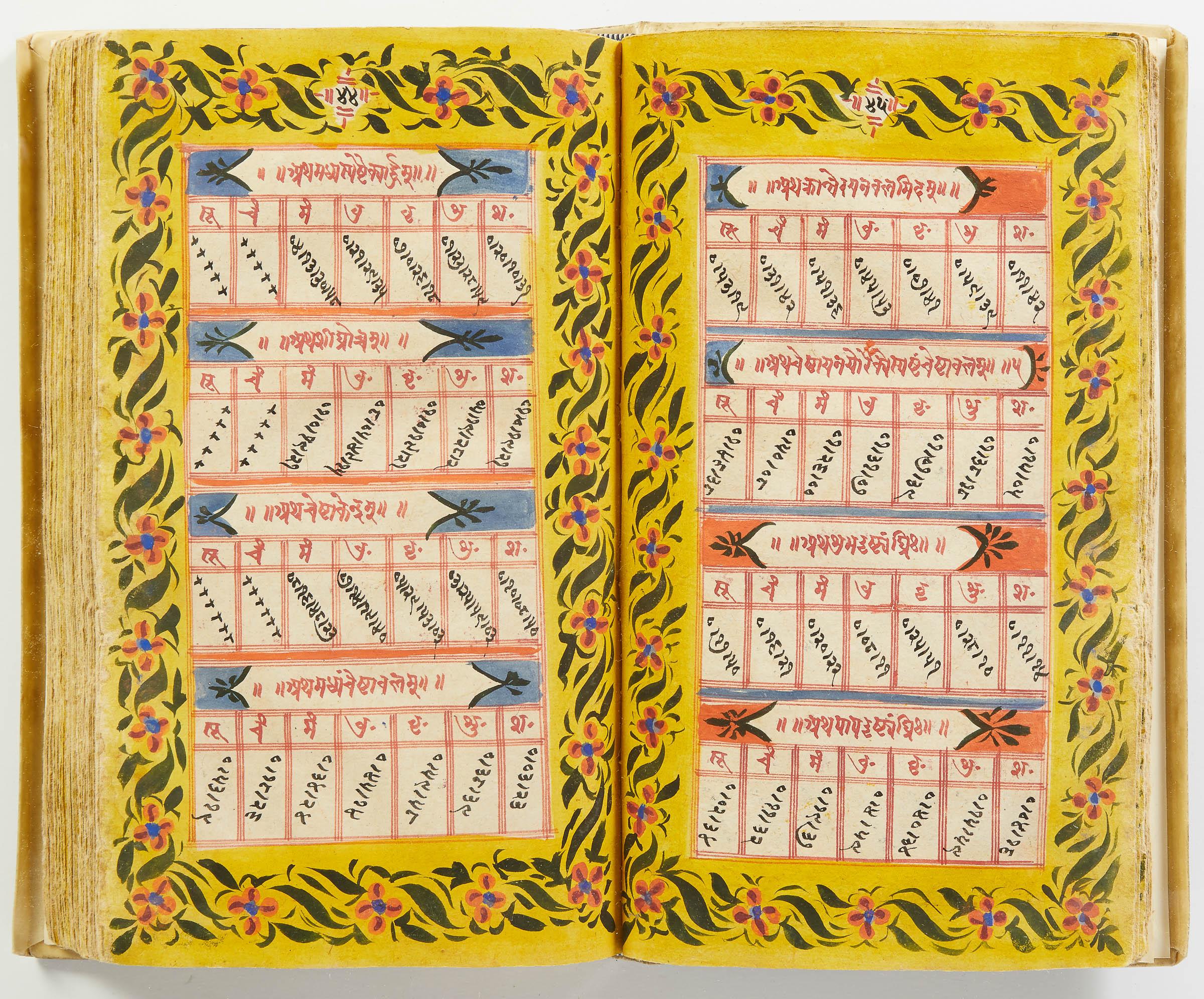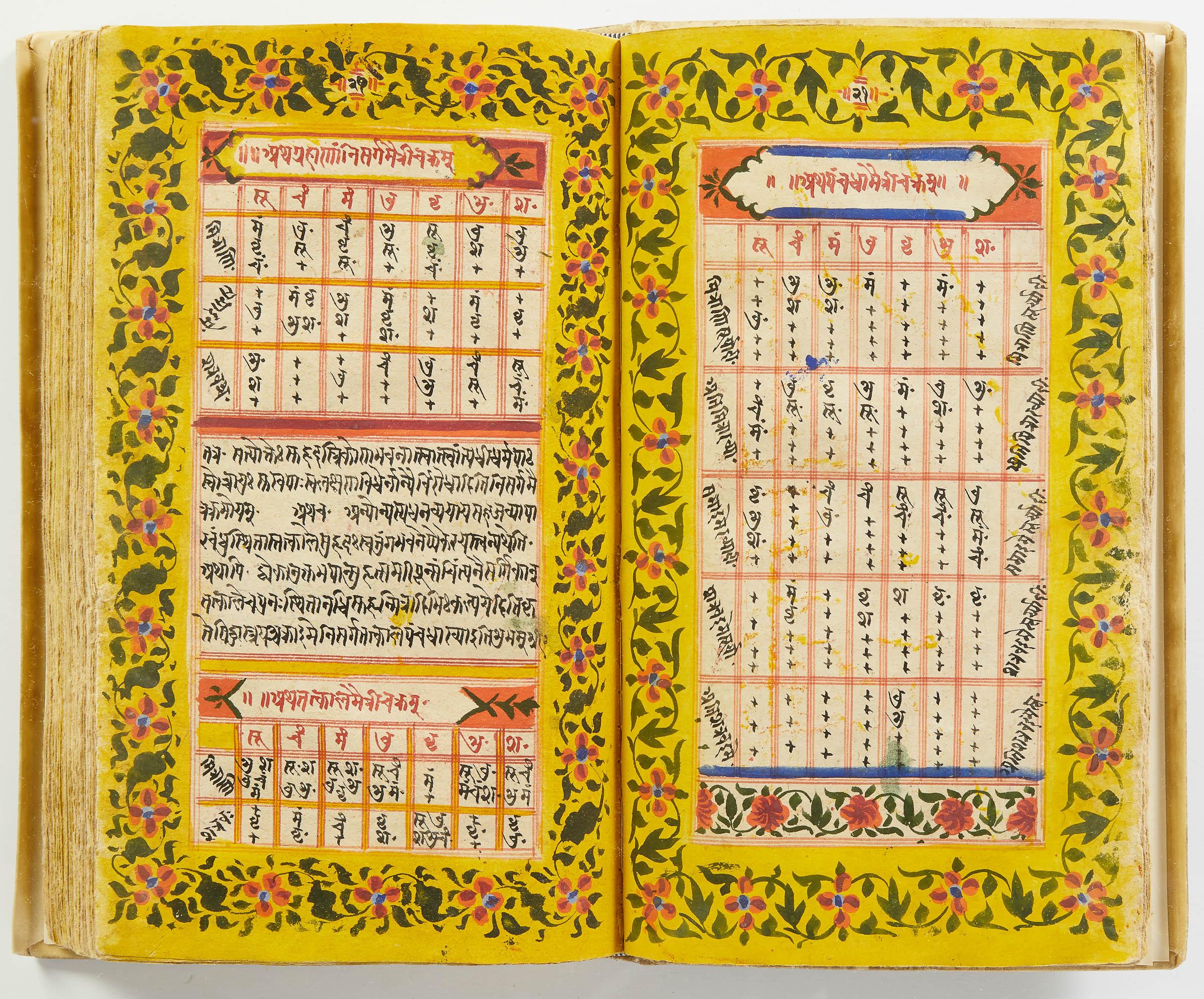 lluminated manuscript in Sanskrit on prepared paper, written in Devanagari script in black and red ink, with a profusion of tables and charts, partly in color, and floral border on each page of text. 101 leaves, the first 2 and last 3 blank. 326x187 mm,