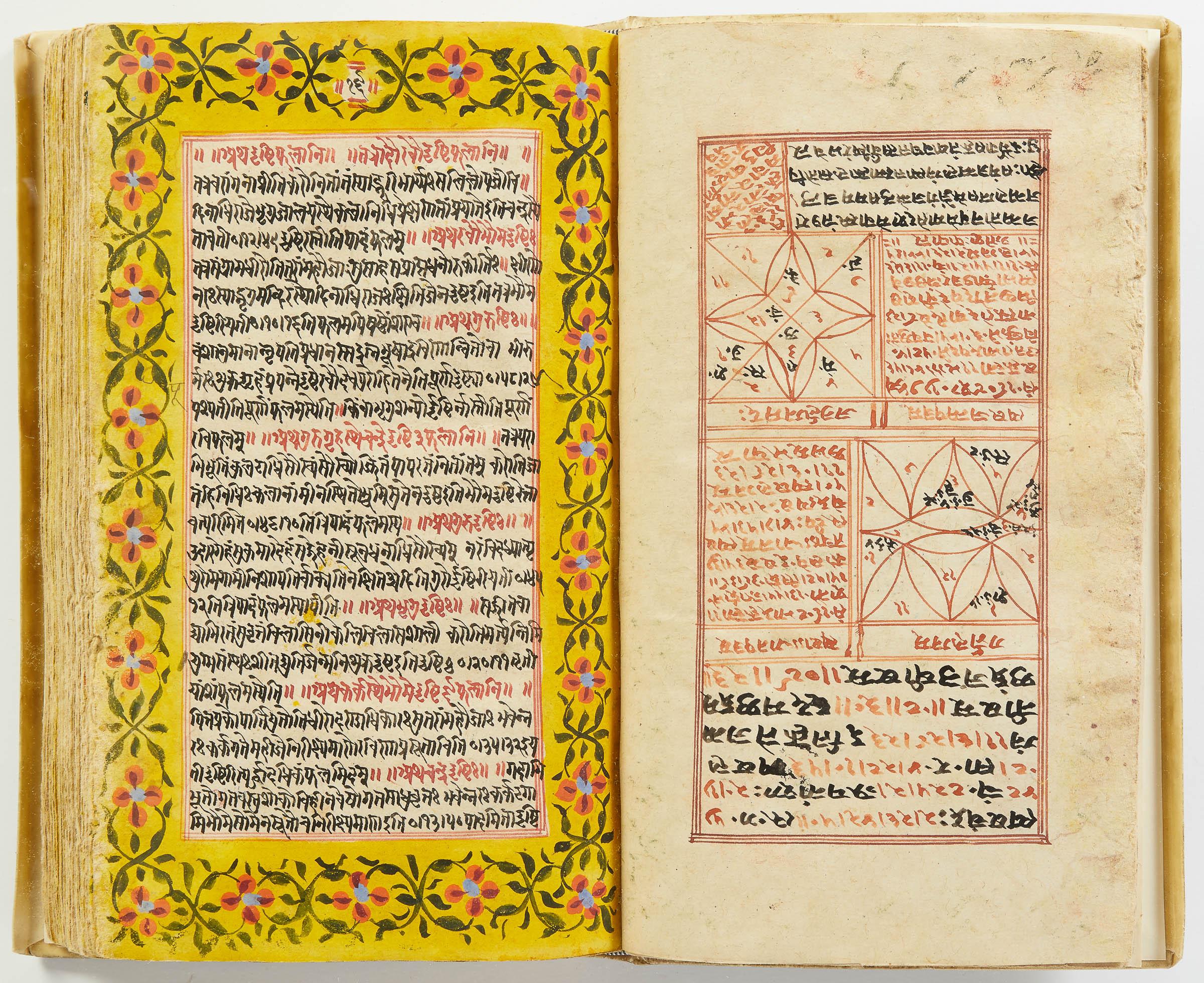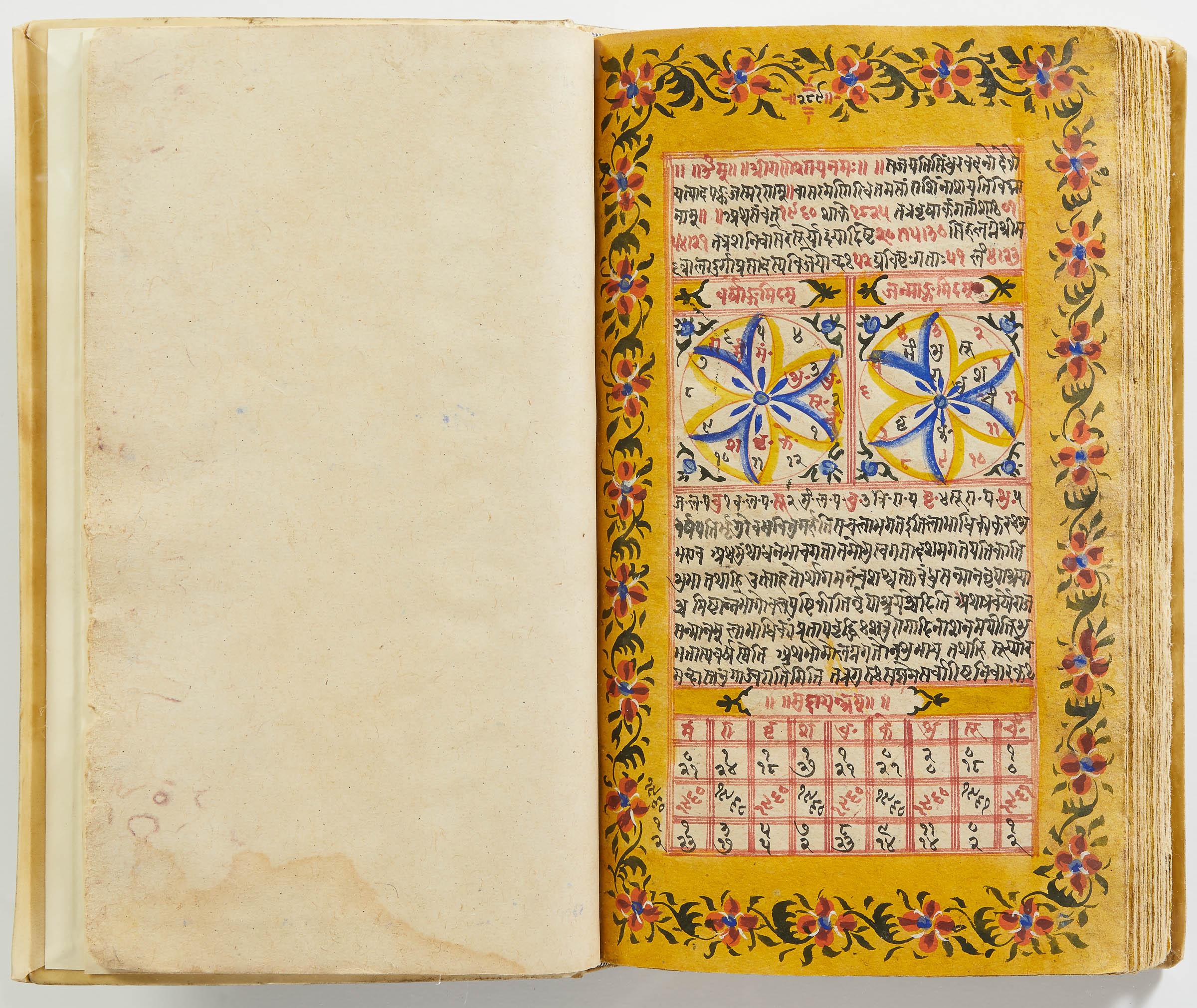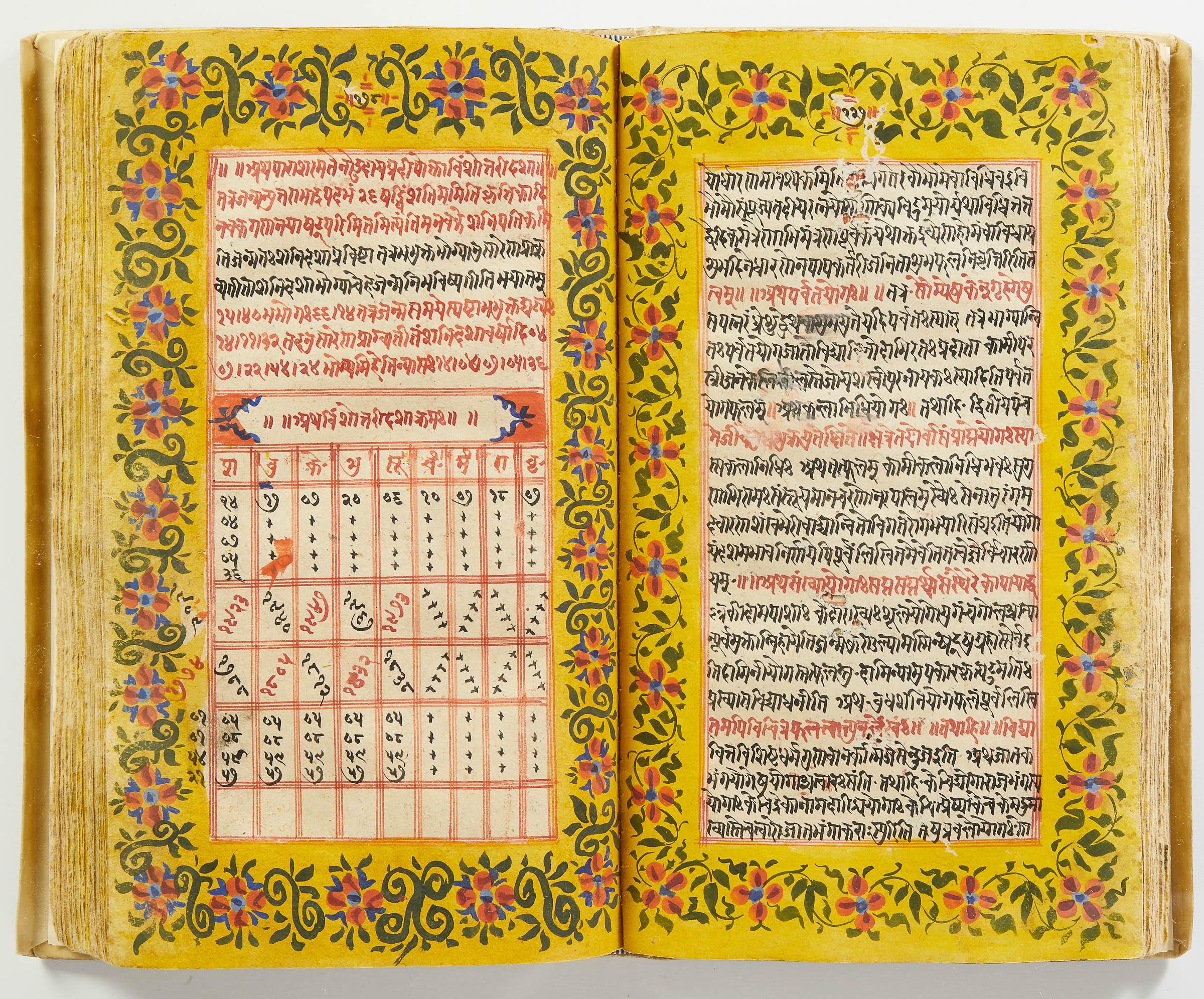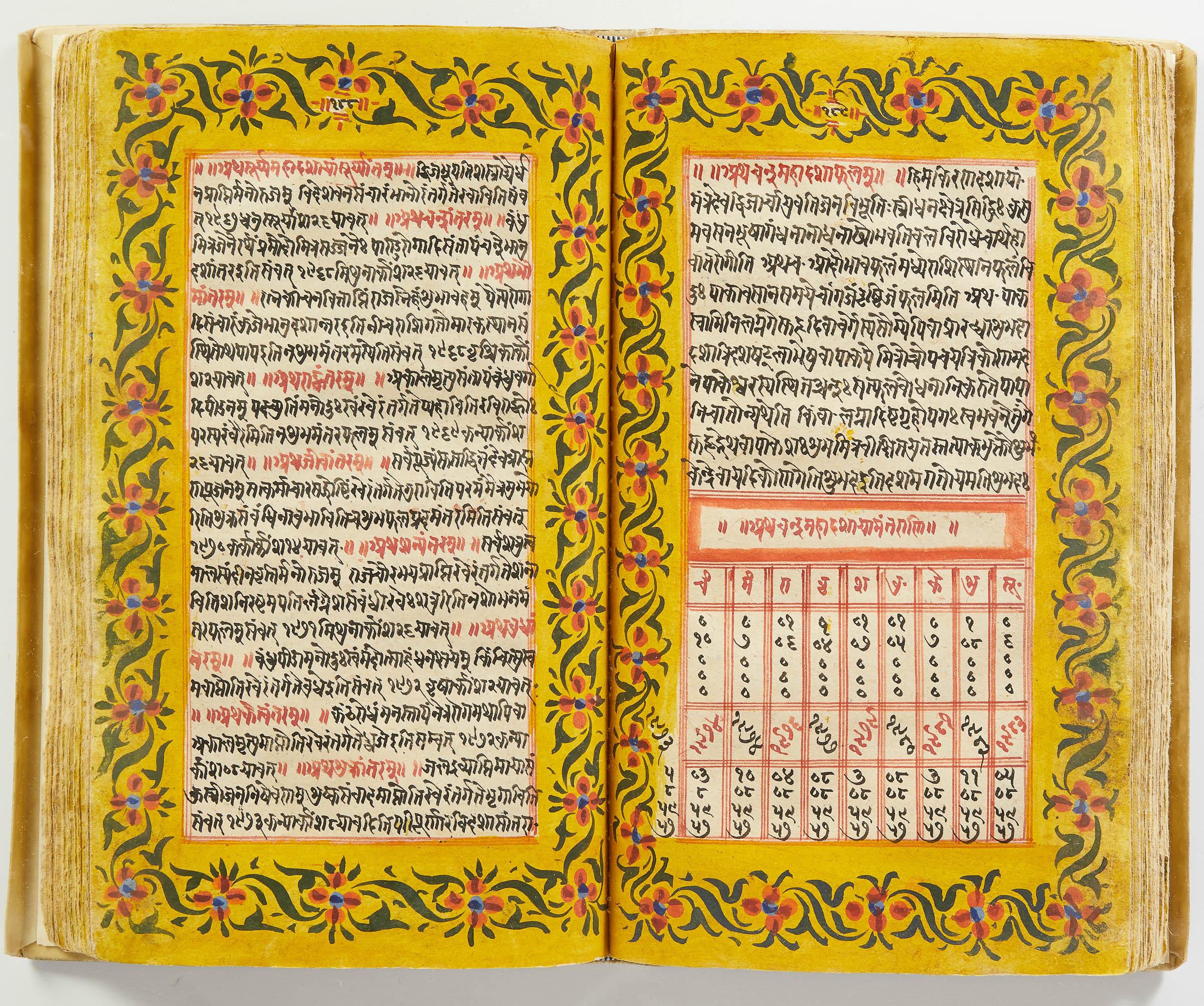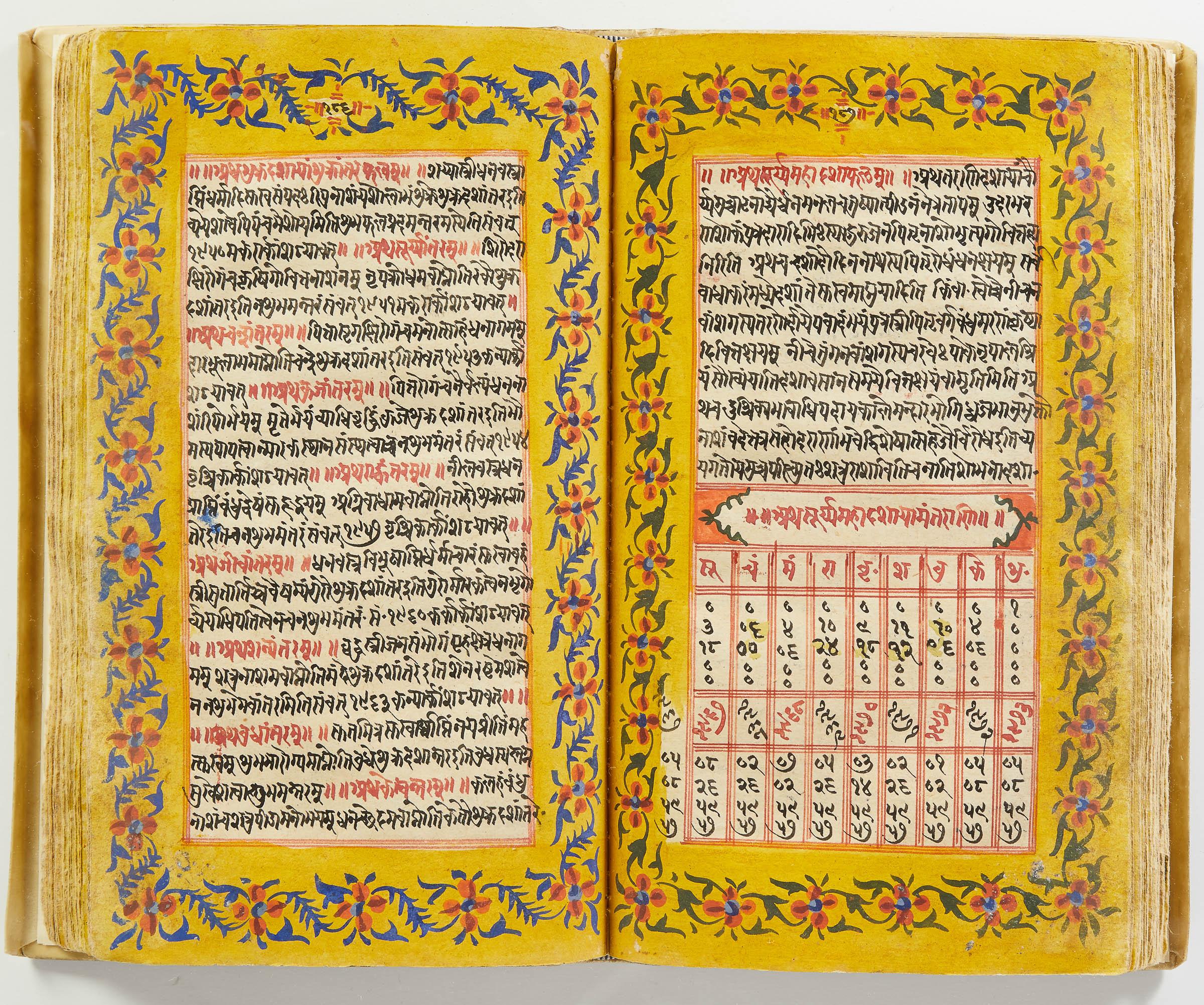 lluminated manuscript in Sanskrit on prepared paper, written in Devanagari script in black and red ink, with a profusion of tables and charts, partly in color, and floral border on each page of text. 101 leaves, the first 2 and last 3 blank. 326x187 mm,