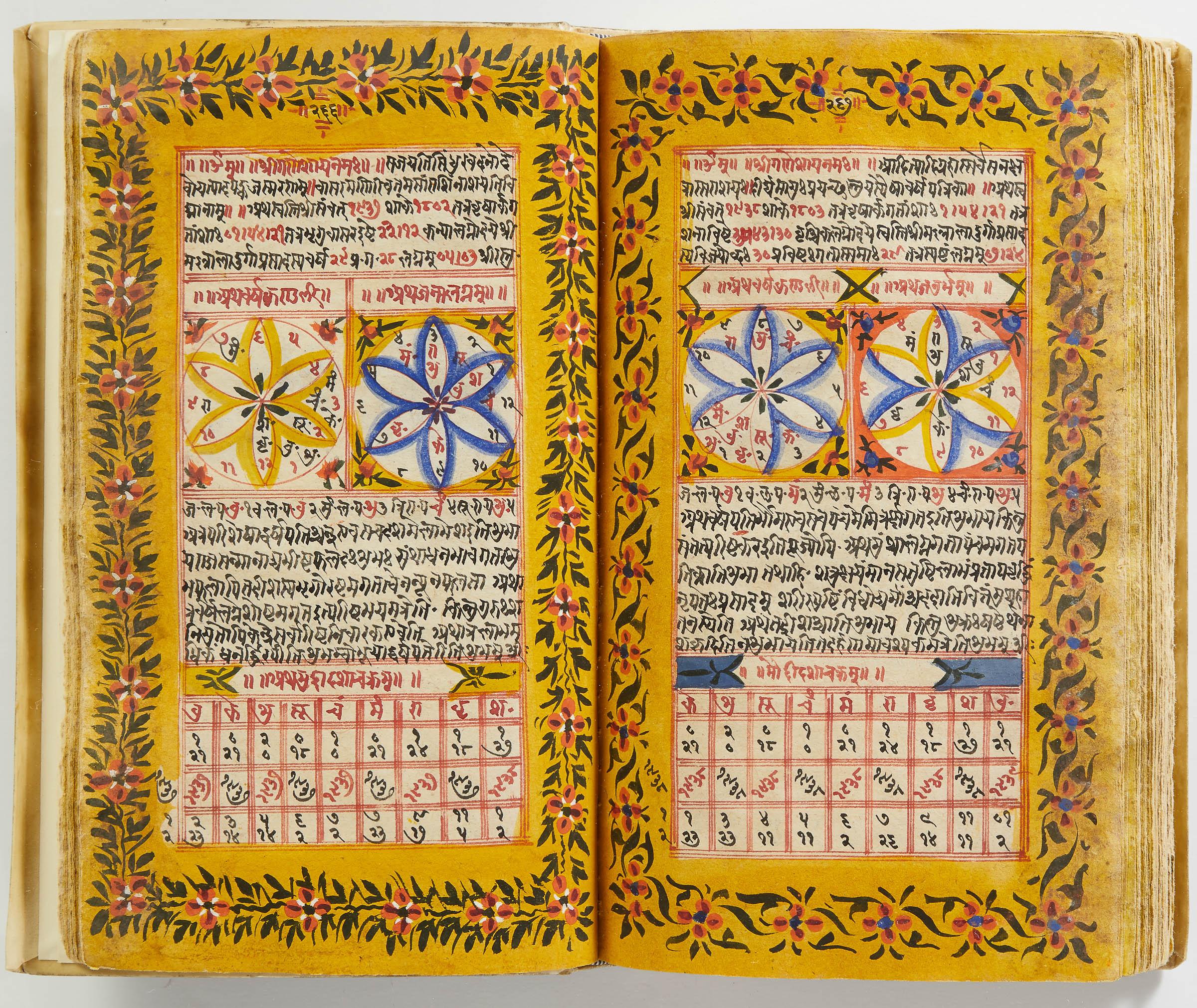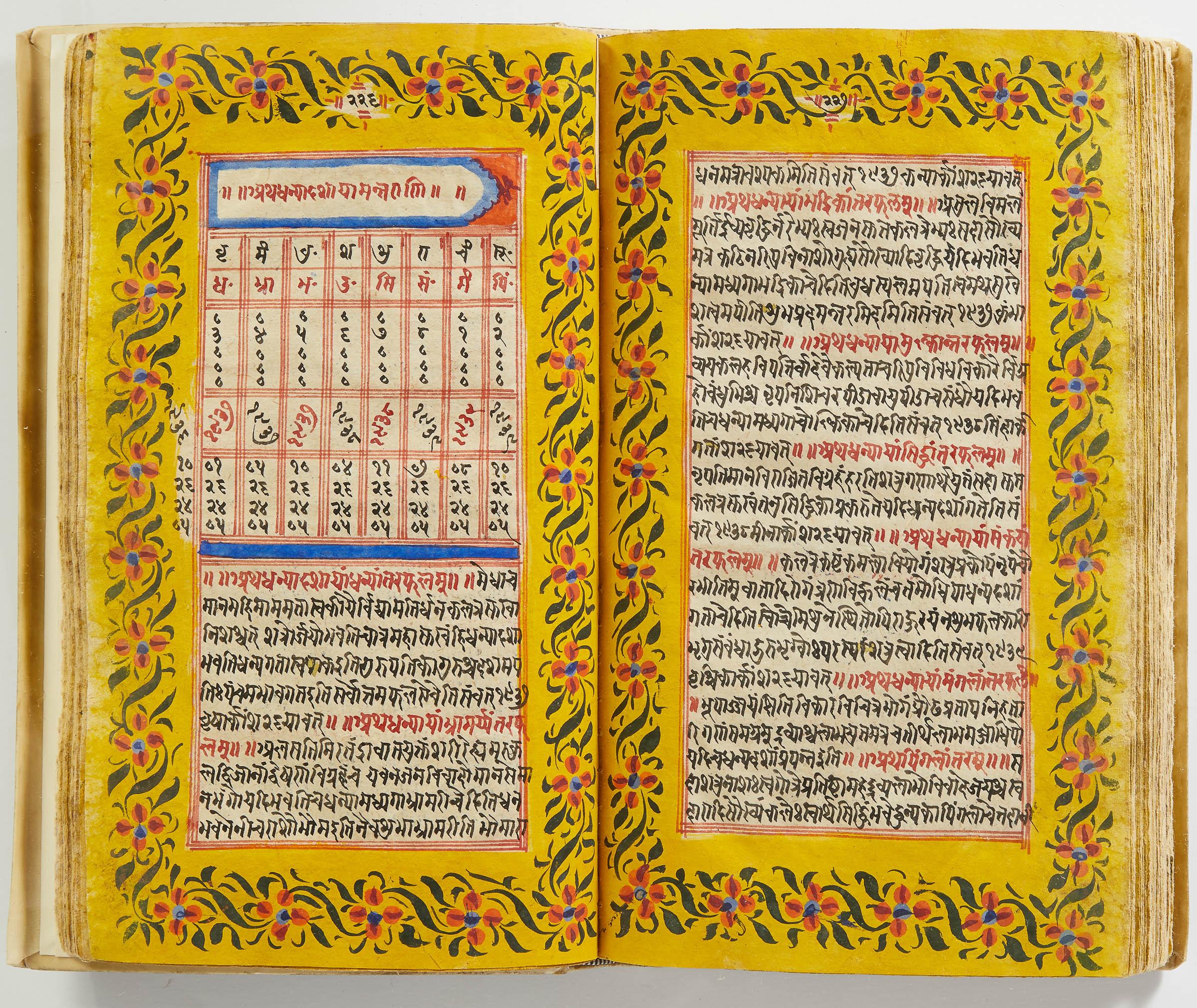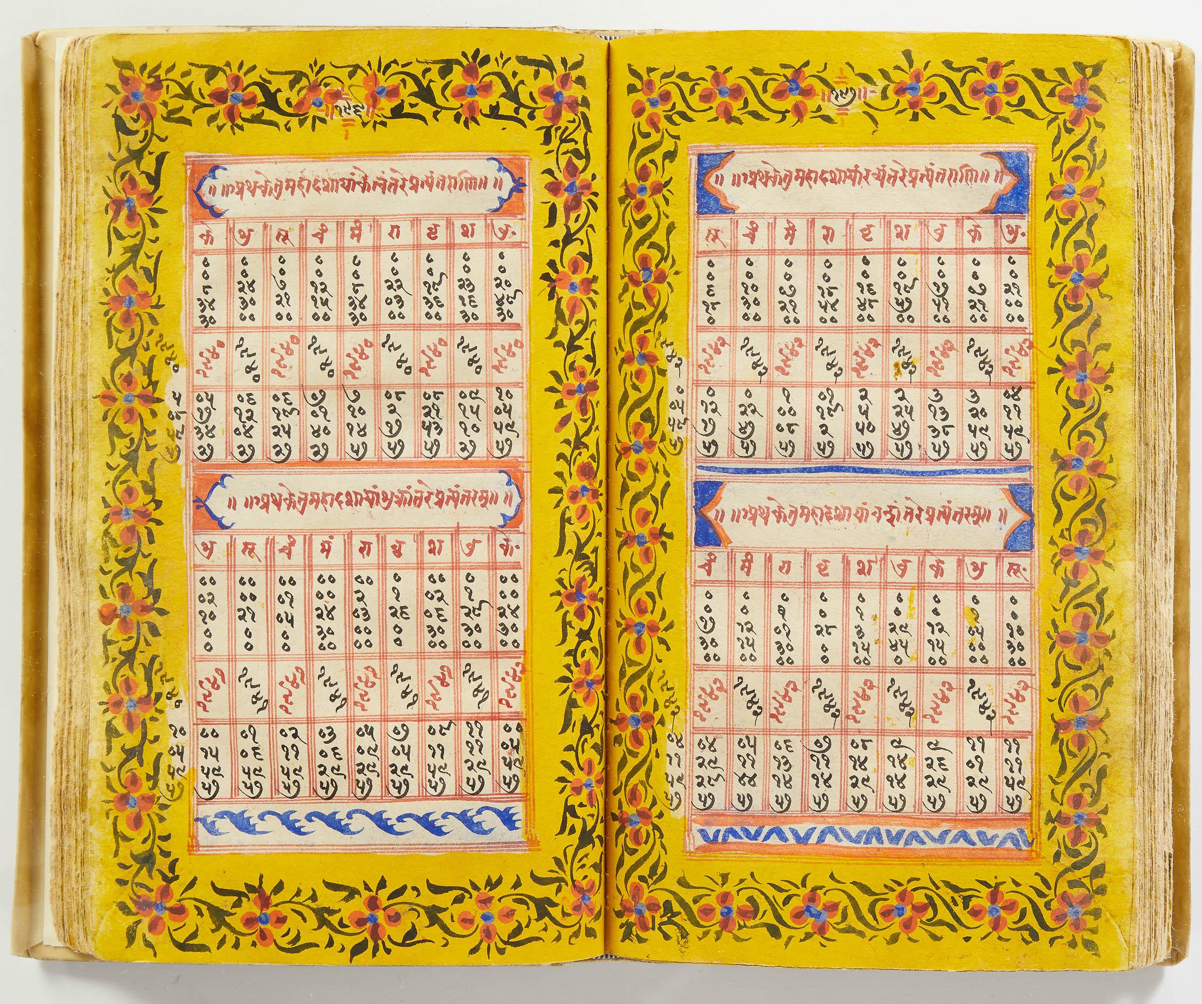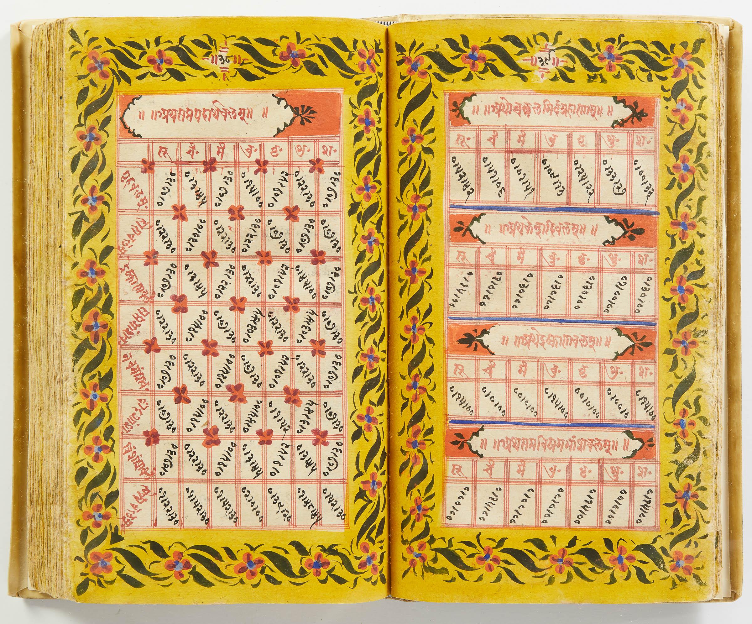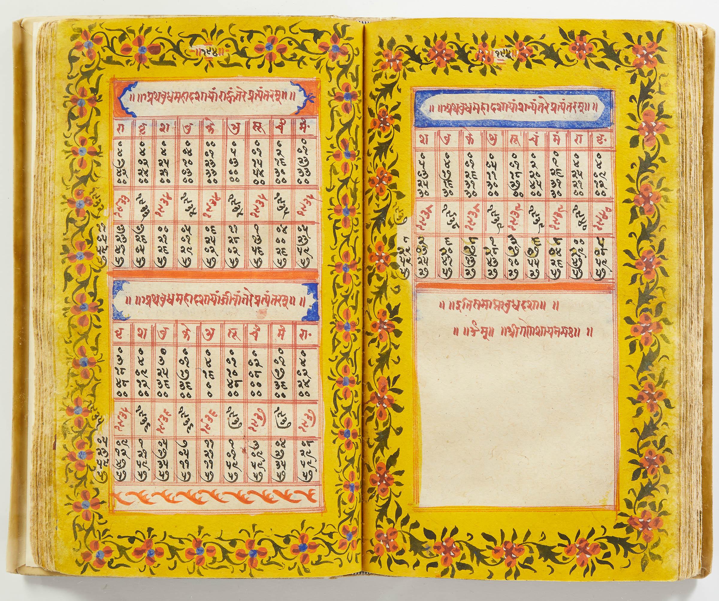 lluminated manuscript in Sanskrit on prepared paper, written in Devanagari script in black and red ink, with a profusion of tables and charts, partly in color, and floral border on each page of text. 101 leaves, the first 2 and last 3 blank. 326x187 mm,