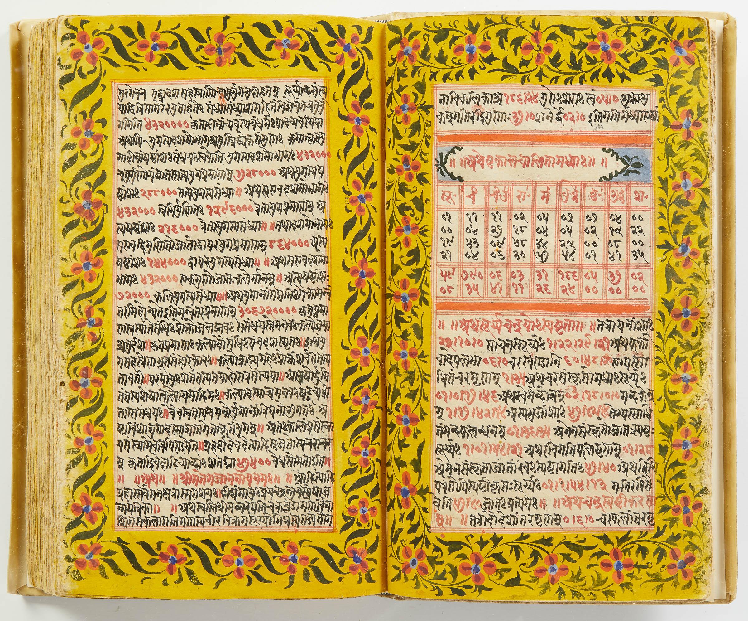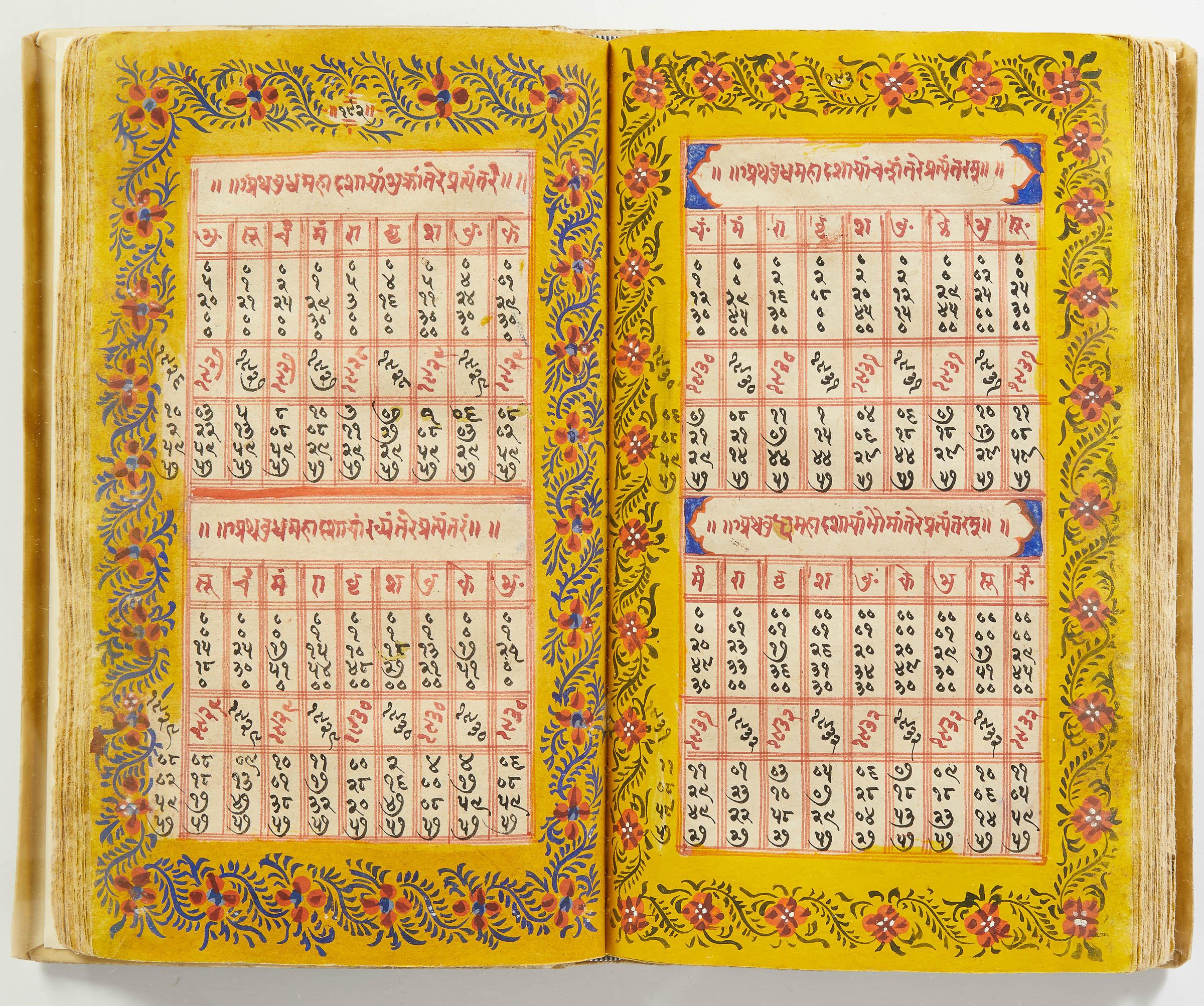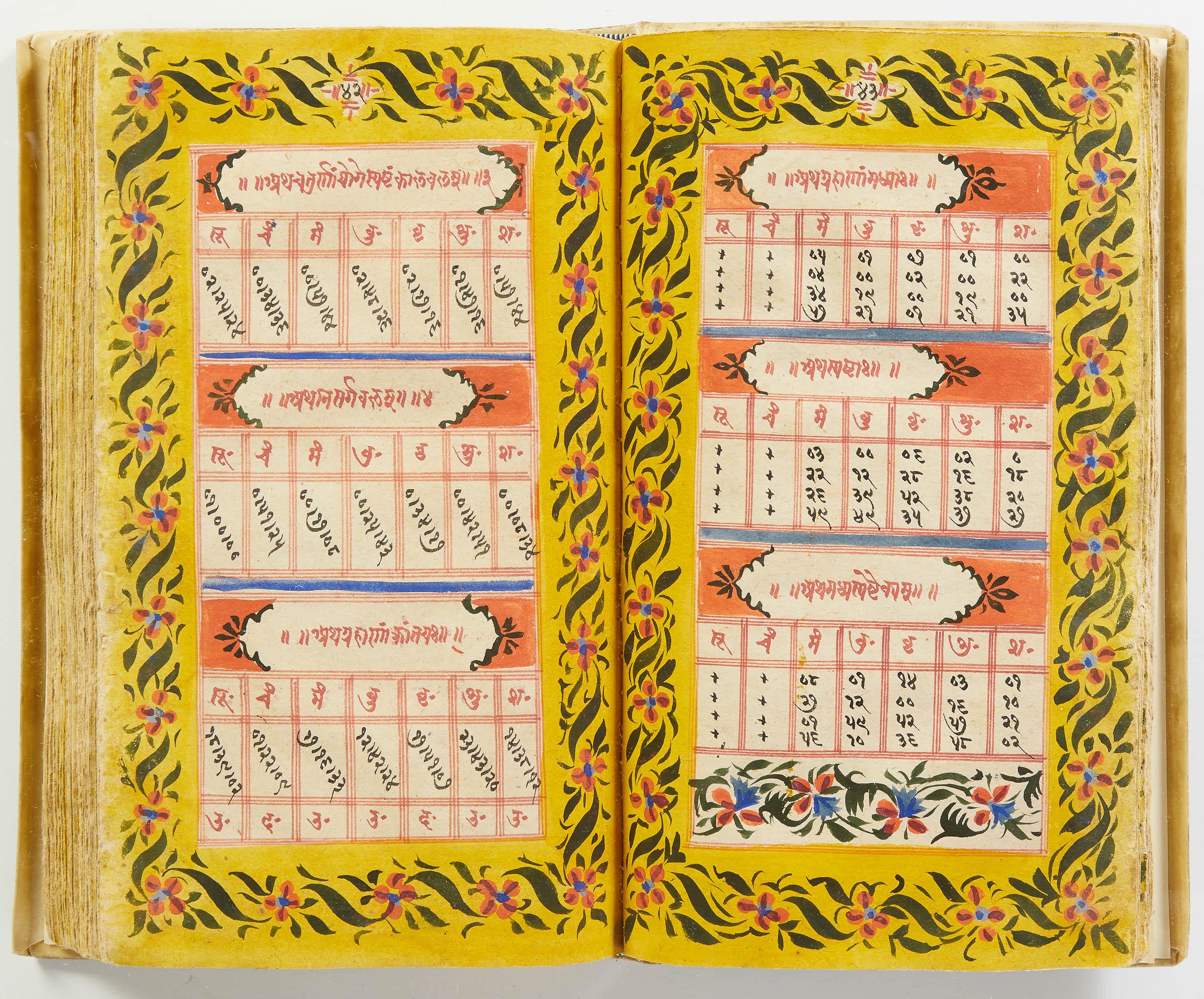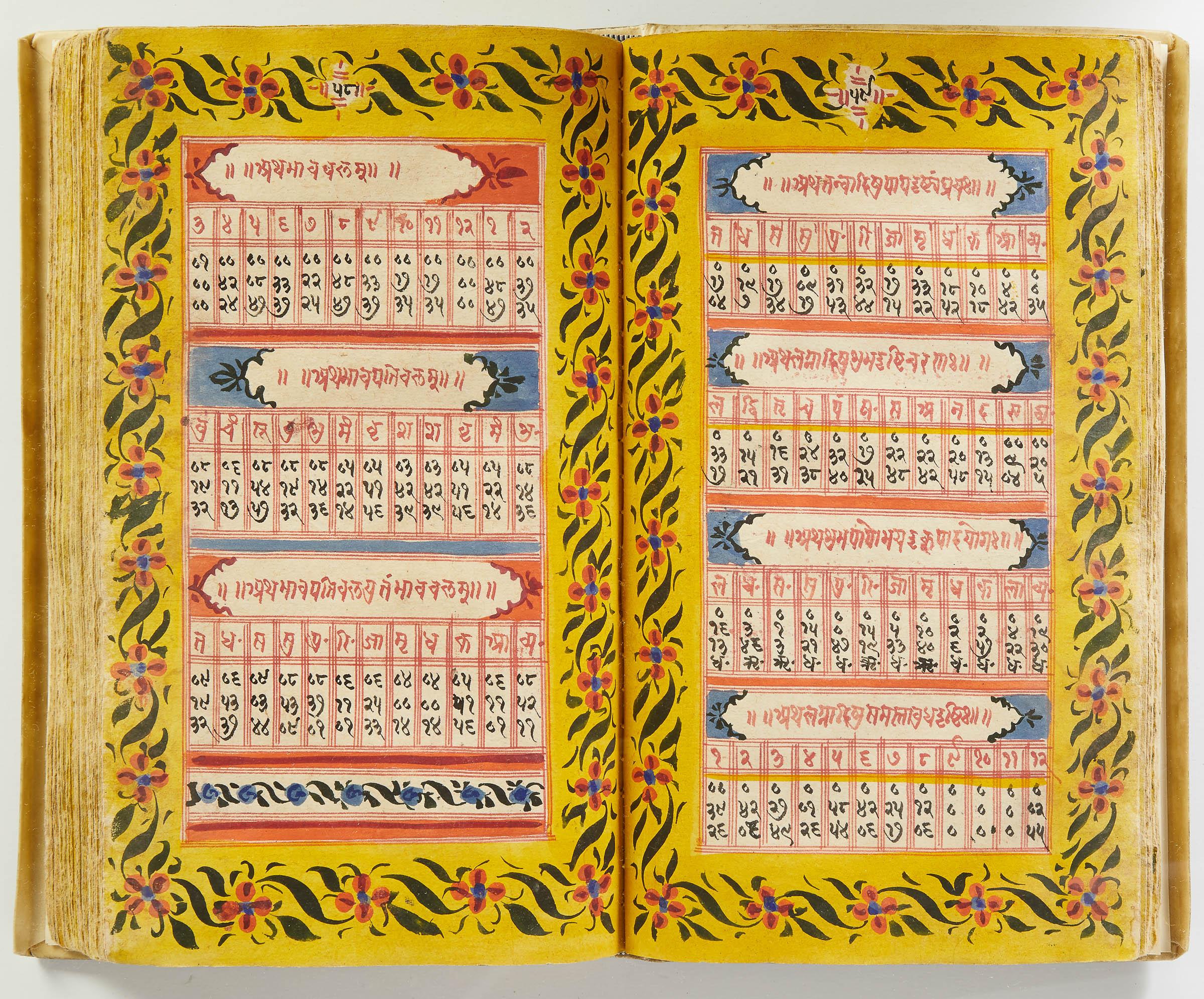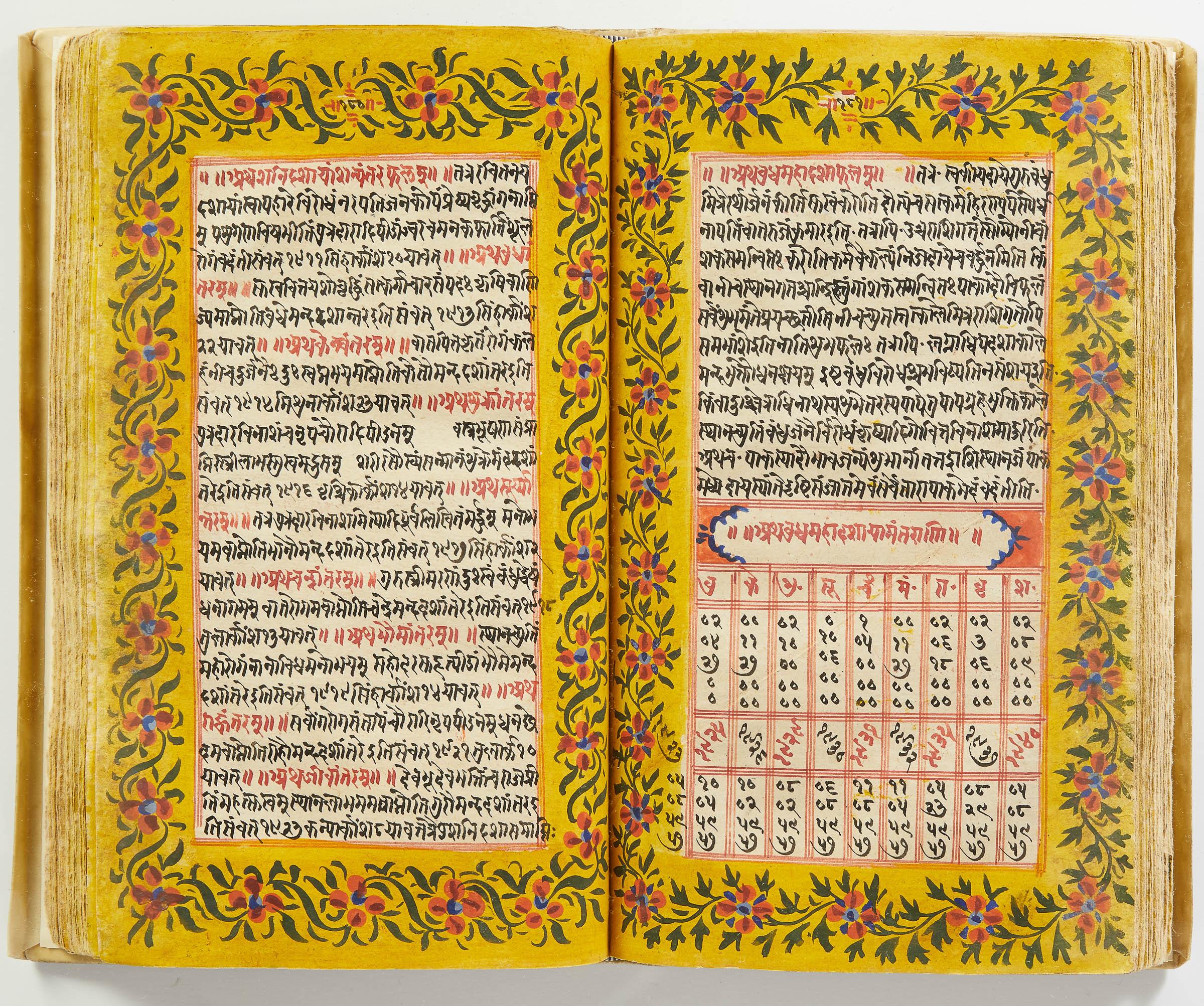 lluminated manuscript in Sanskrit on prepared paper, written in Devanagari script in black and red ink, with a profusion of tables and charts, partly in color, and floral border on each page of text. 101 leaves, the first 2 and last 3 blank. 326x187 mm,