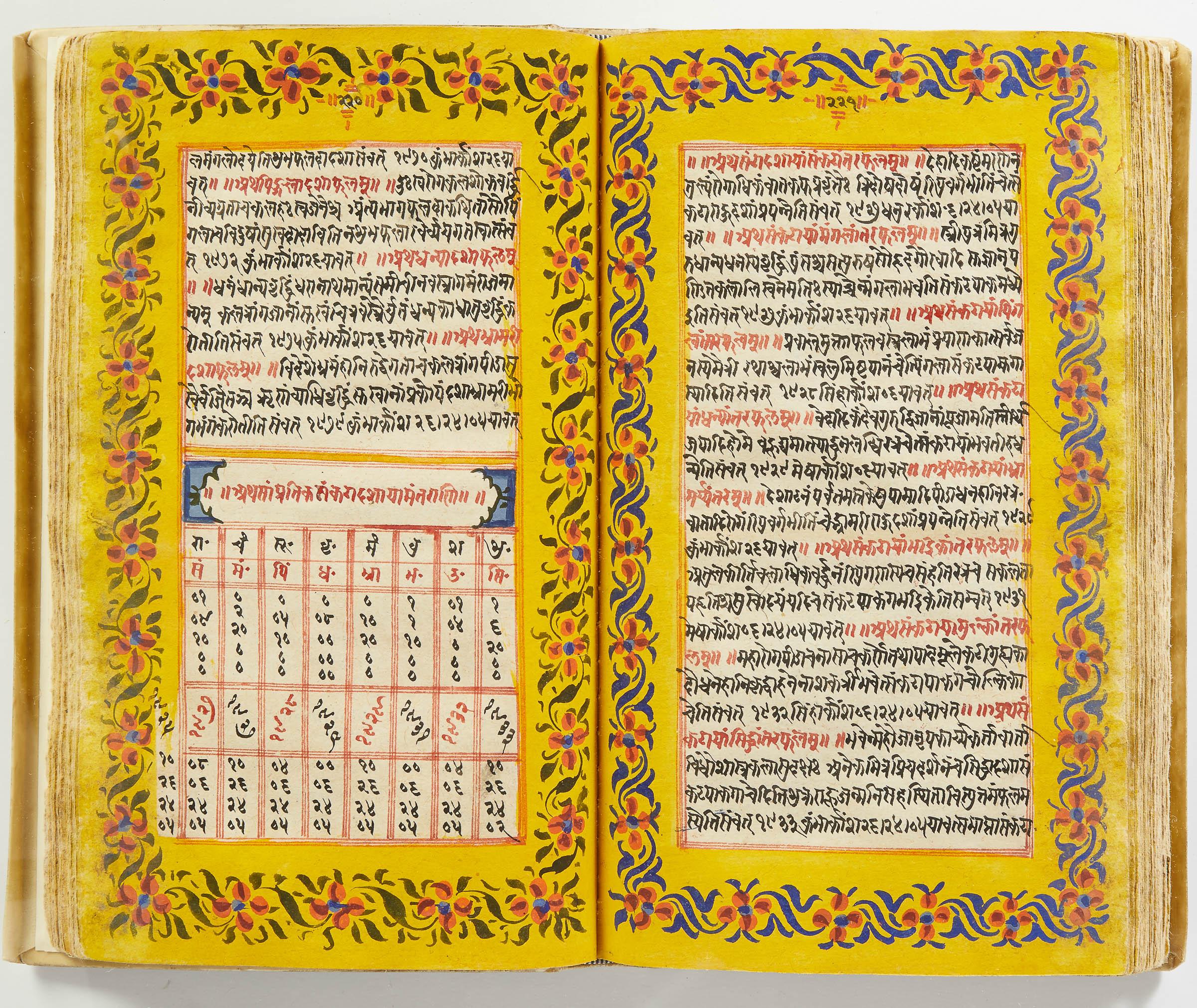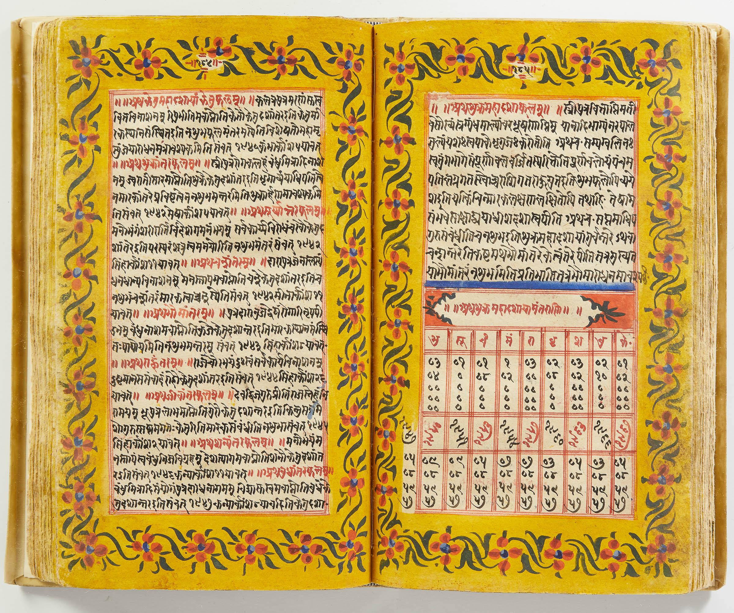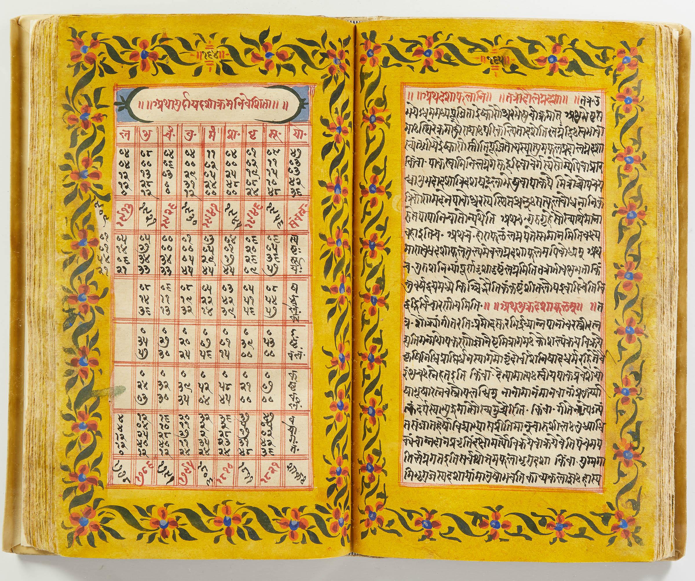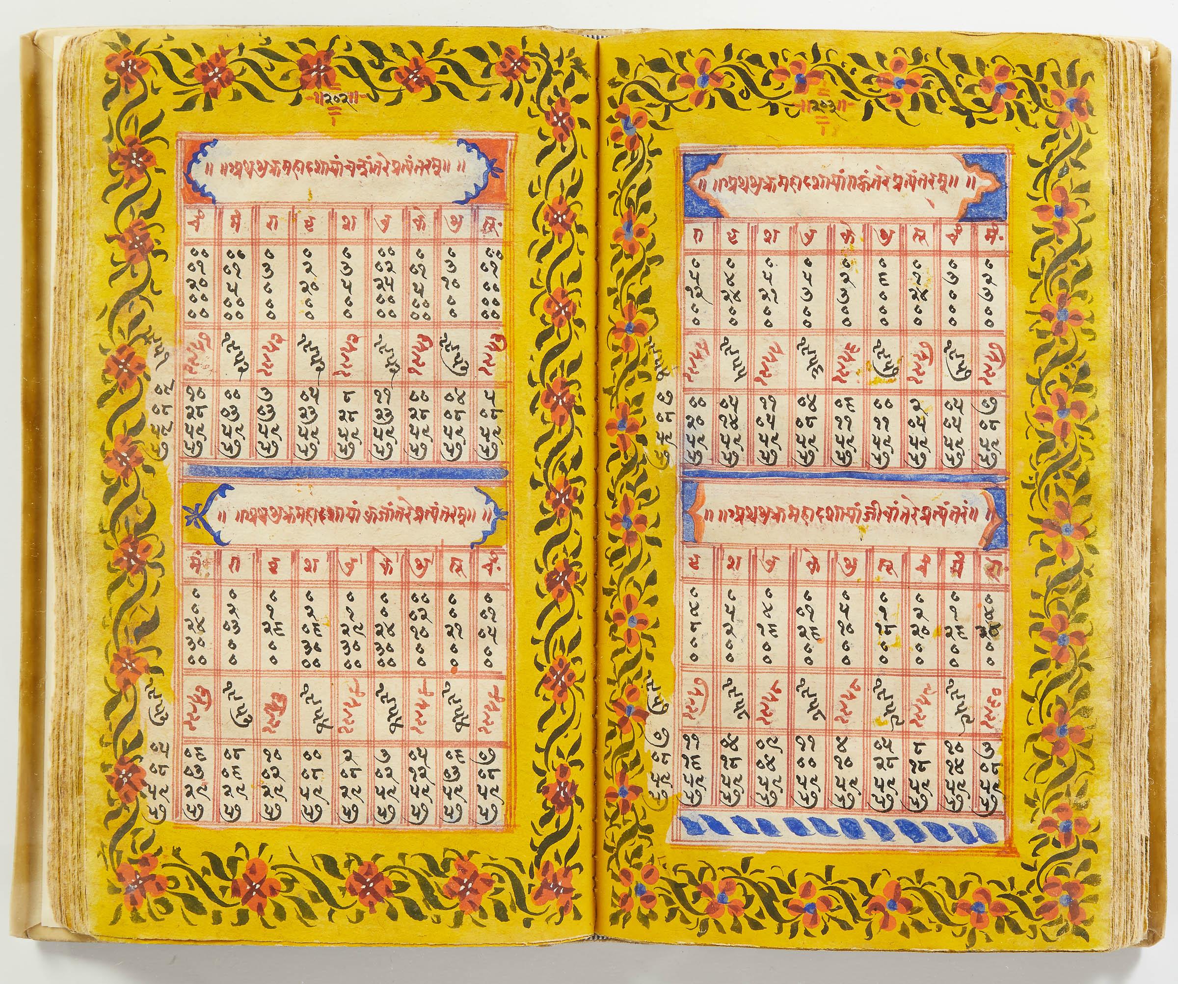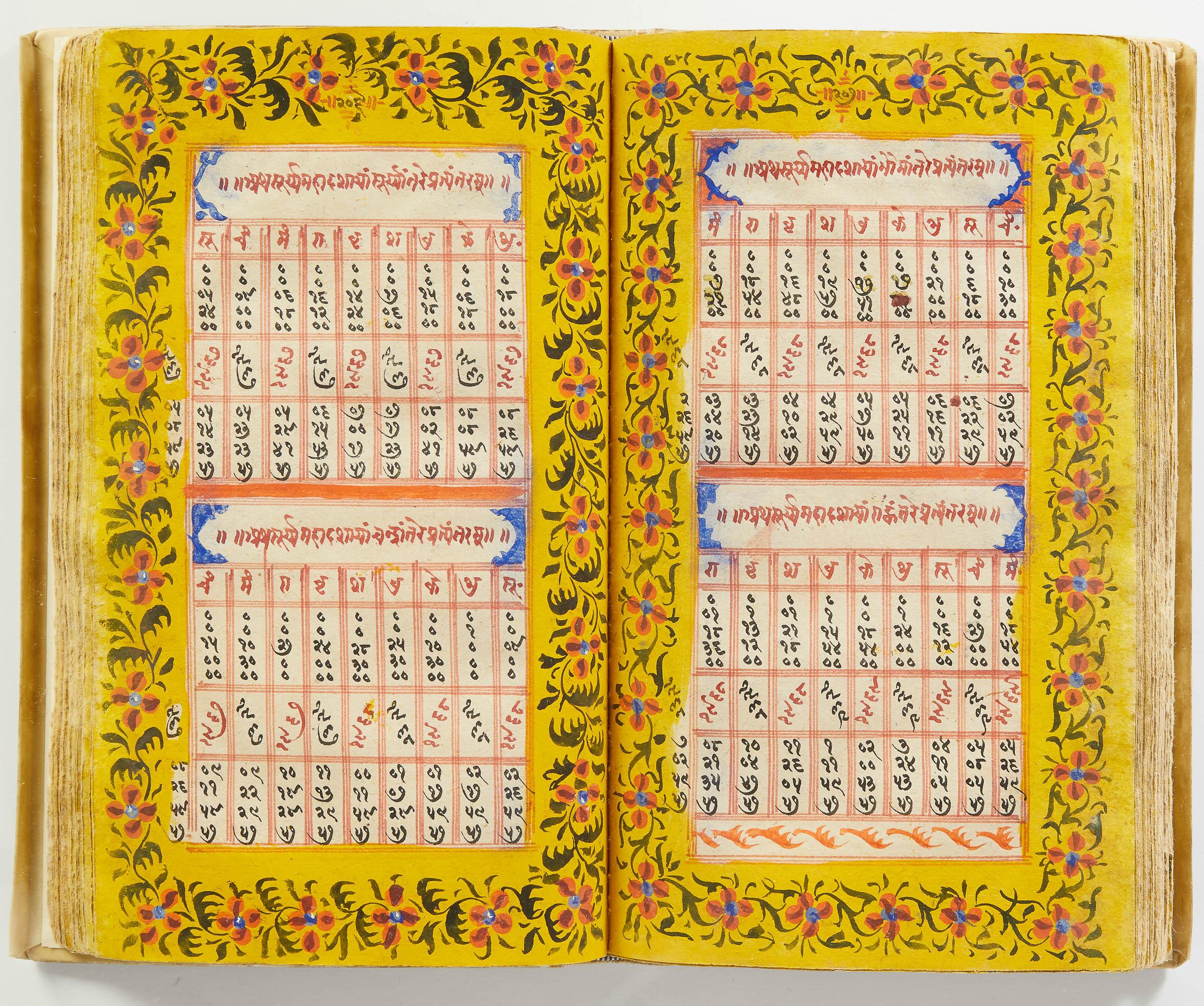 lluminated manuscript in Sanskrit on prepared paper, written in Devanagari script in black and red ink, with a profusion of tables and charts, partly in color, and floral border on each page of text. 101 leaves, the first 2 and last 3 blank. 326x187 mm,