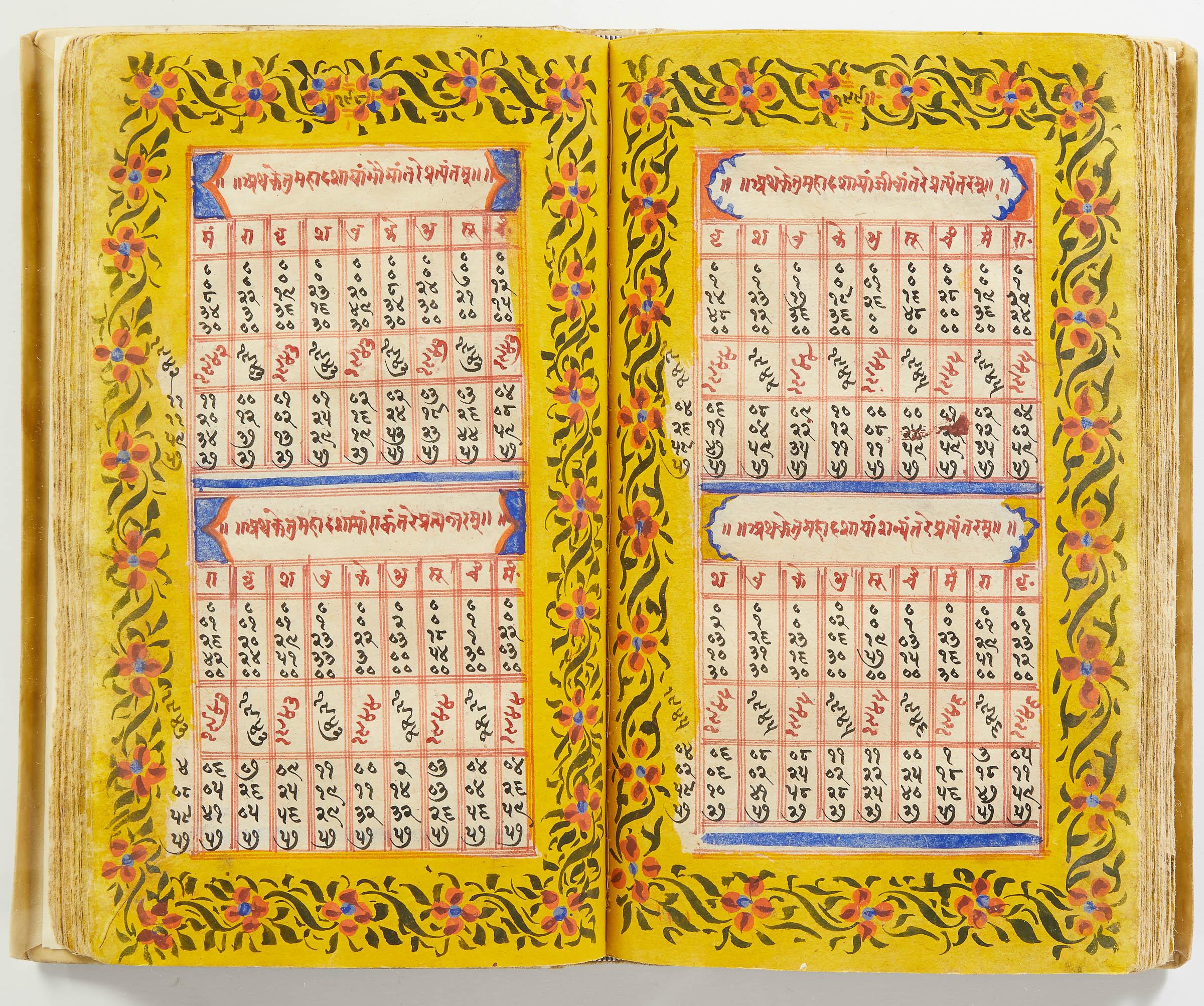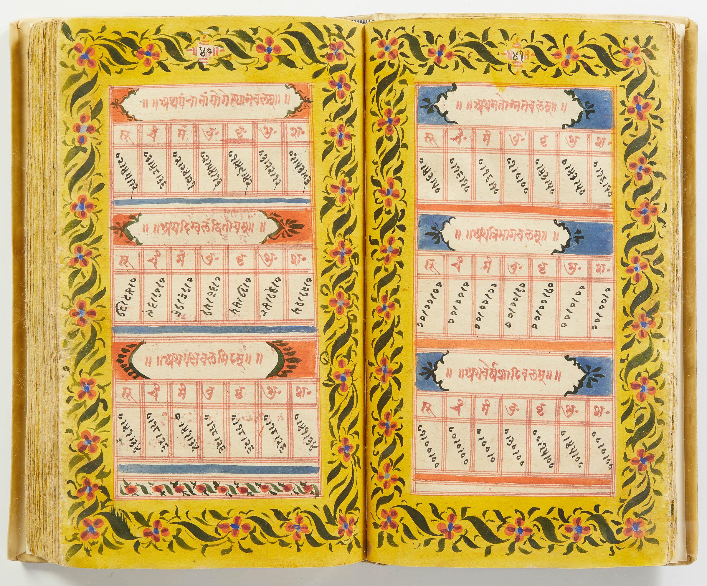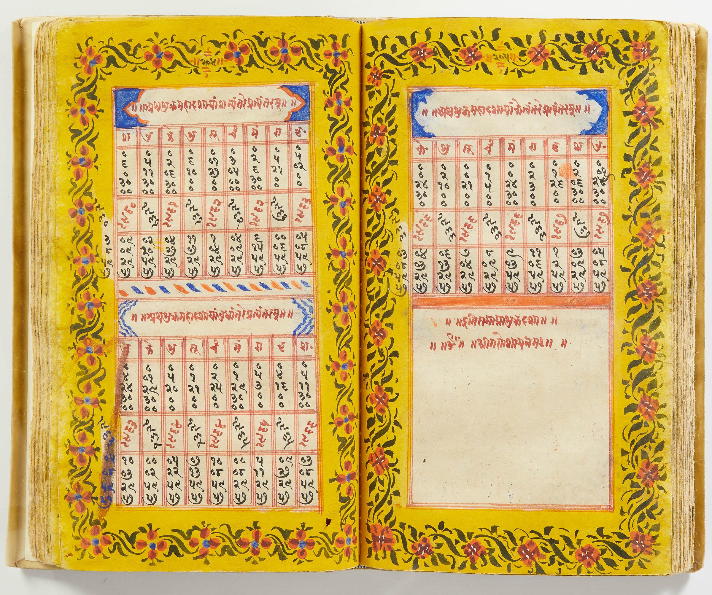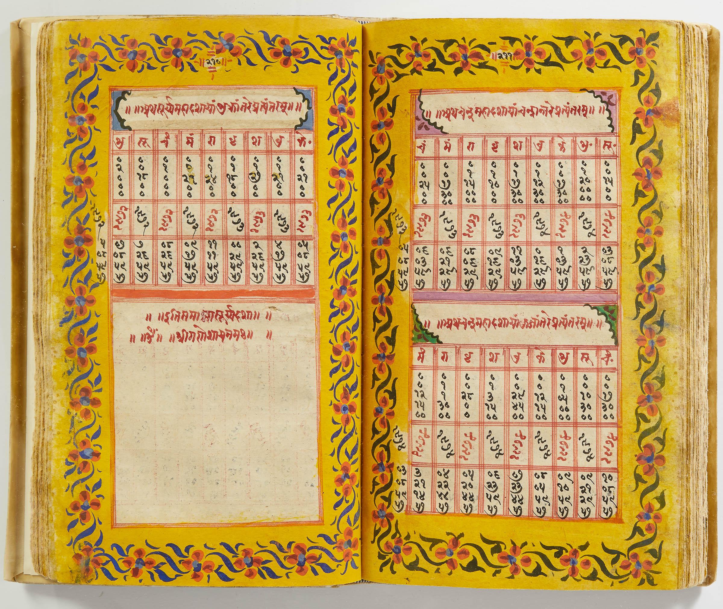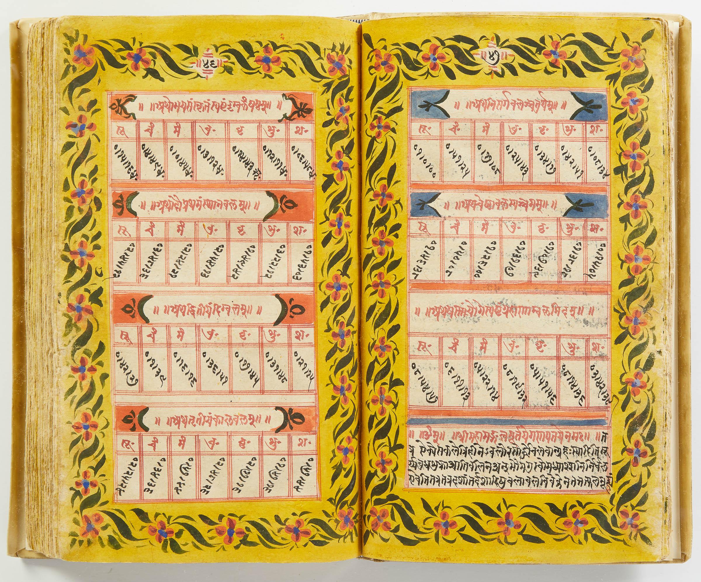 lluminated manuscript in Sanskrit on prepared paper, written in Devanagari script in black and red ink, with a profusion of tables and charts, partly in color, and floral border on each page of text. 101 leaves, the first 2 and last 3 blank. 326x187 mm,