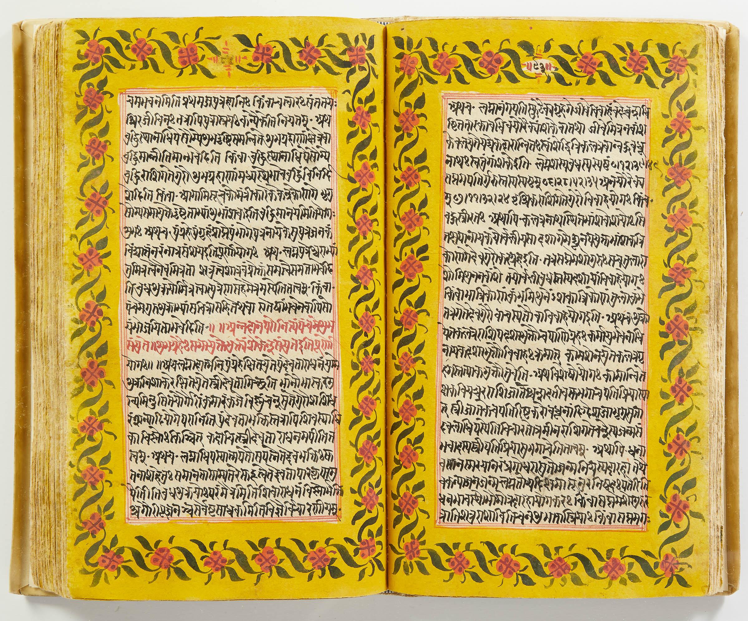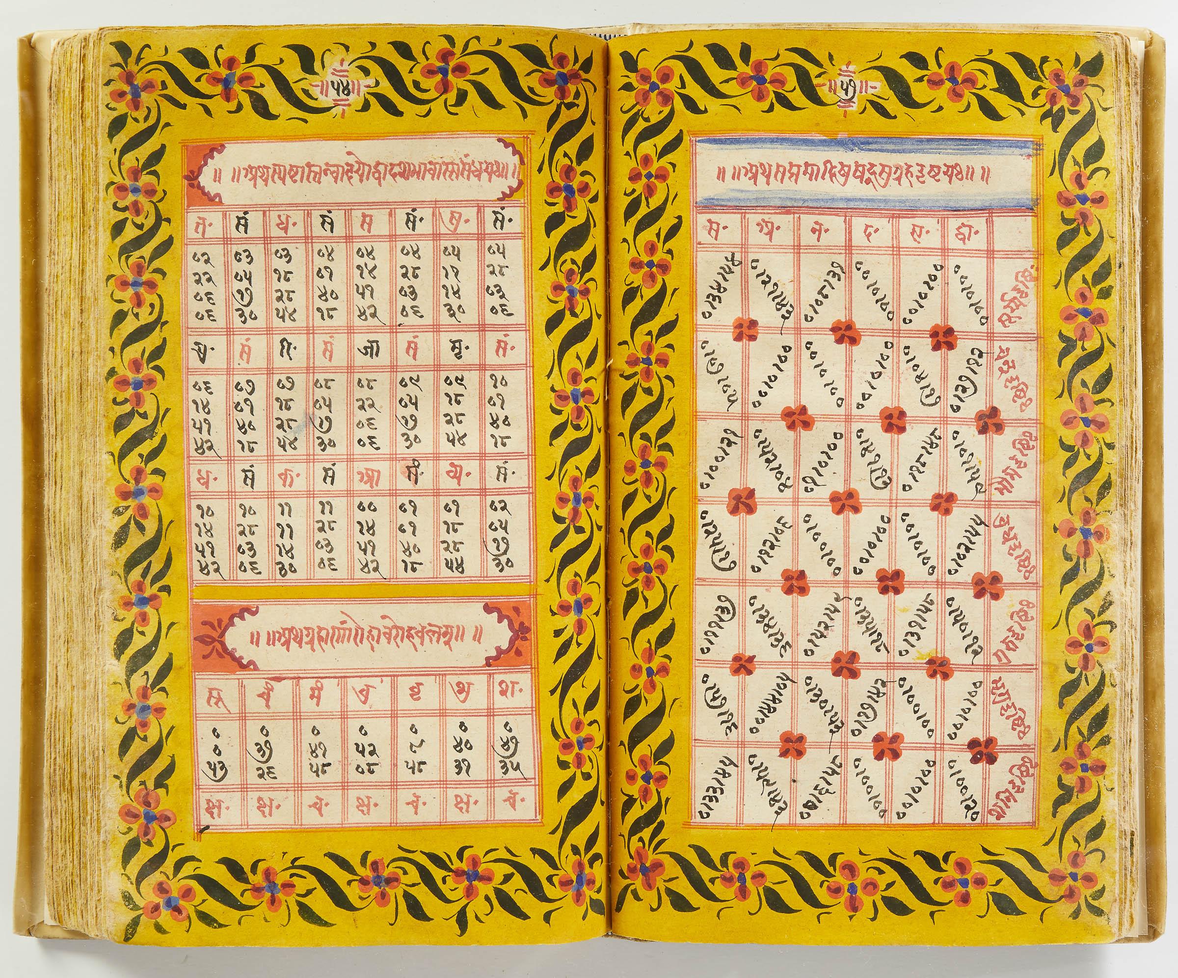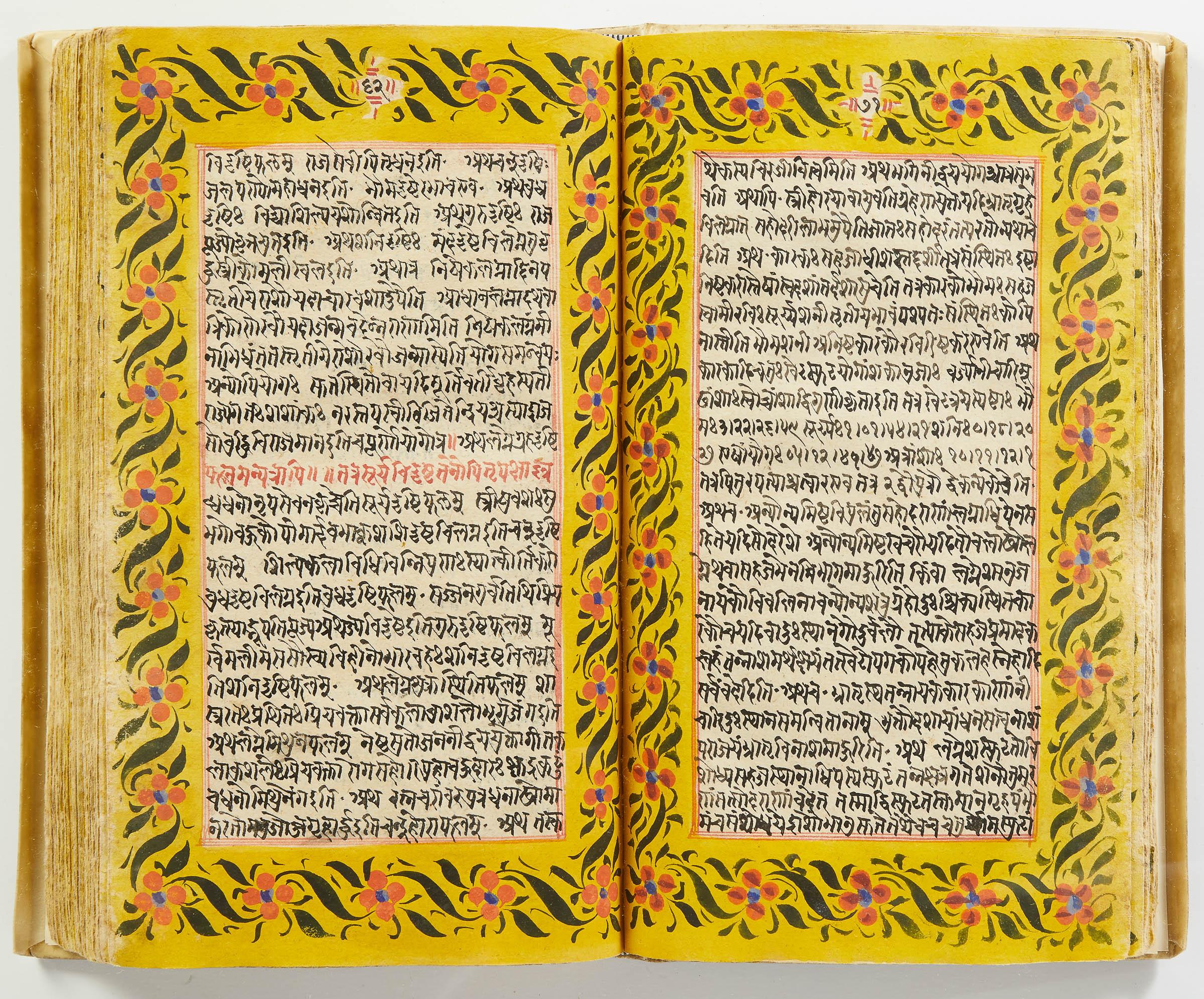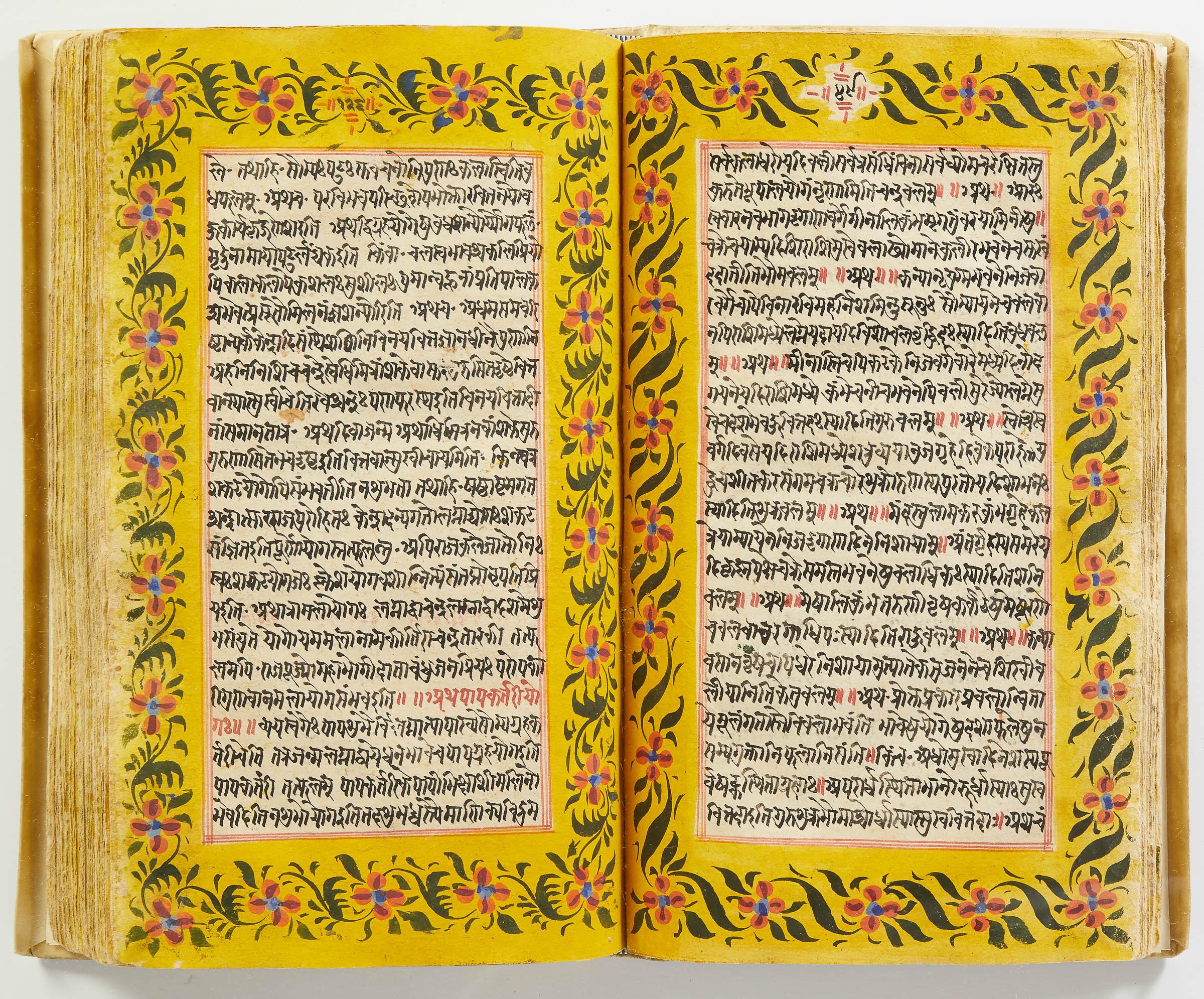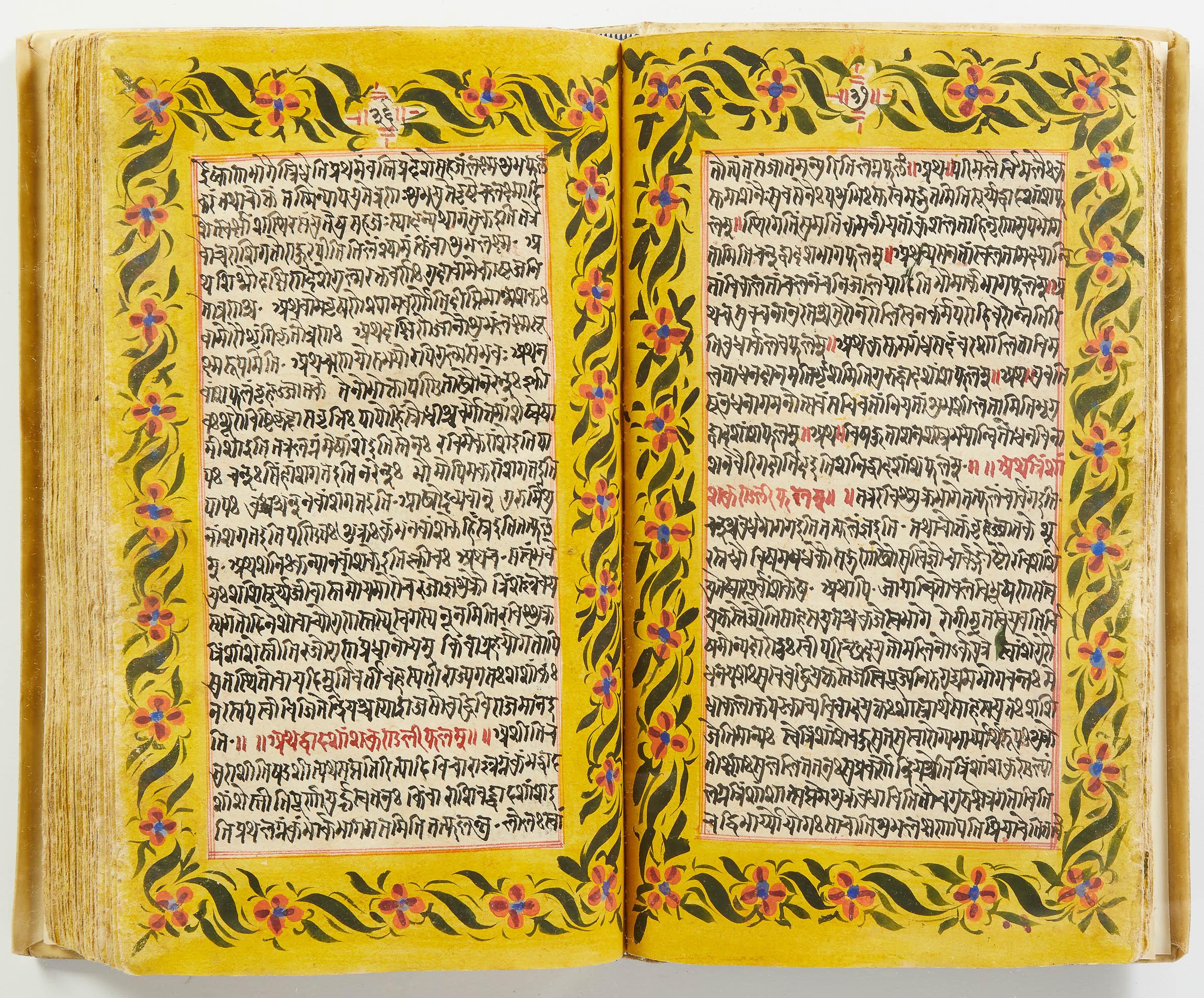 lluminated manuscript in Sanskrit on prepared paper, written in Devanagari script in black and red ink, with a profusion of tables and charts, partly in color, and floral border on each page of text. 101 leaves, the first 2 and last 3 blank. 326x187 mm,