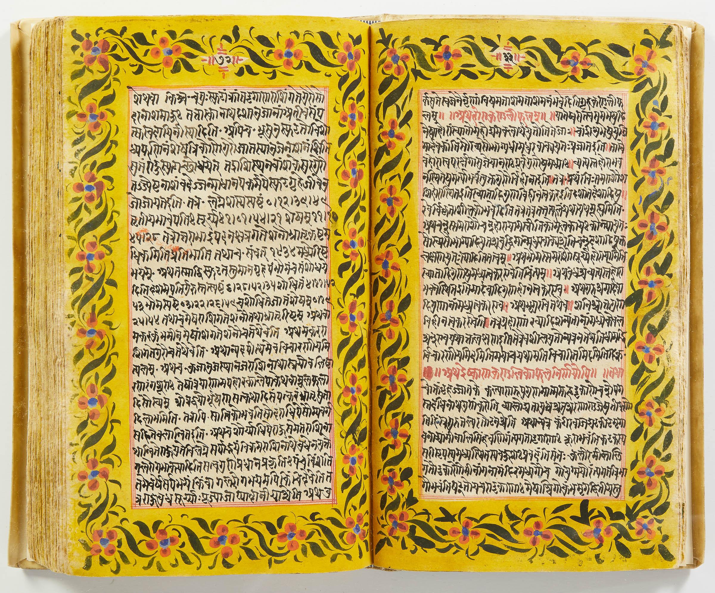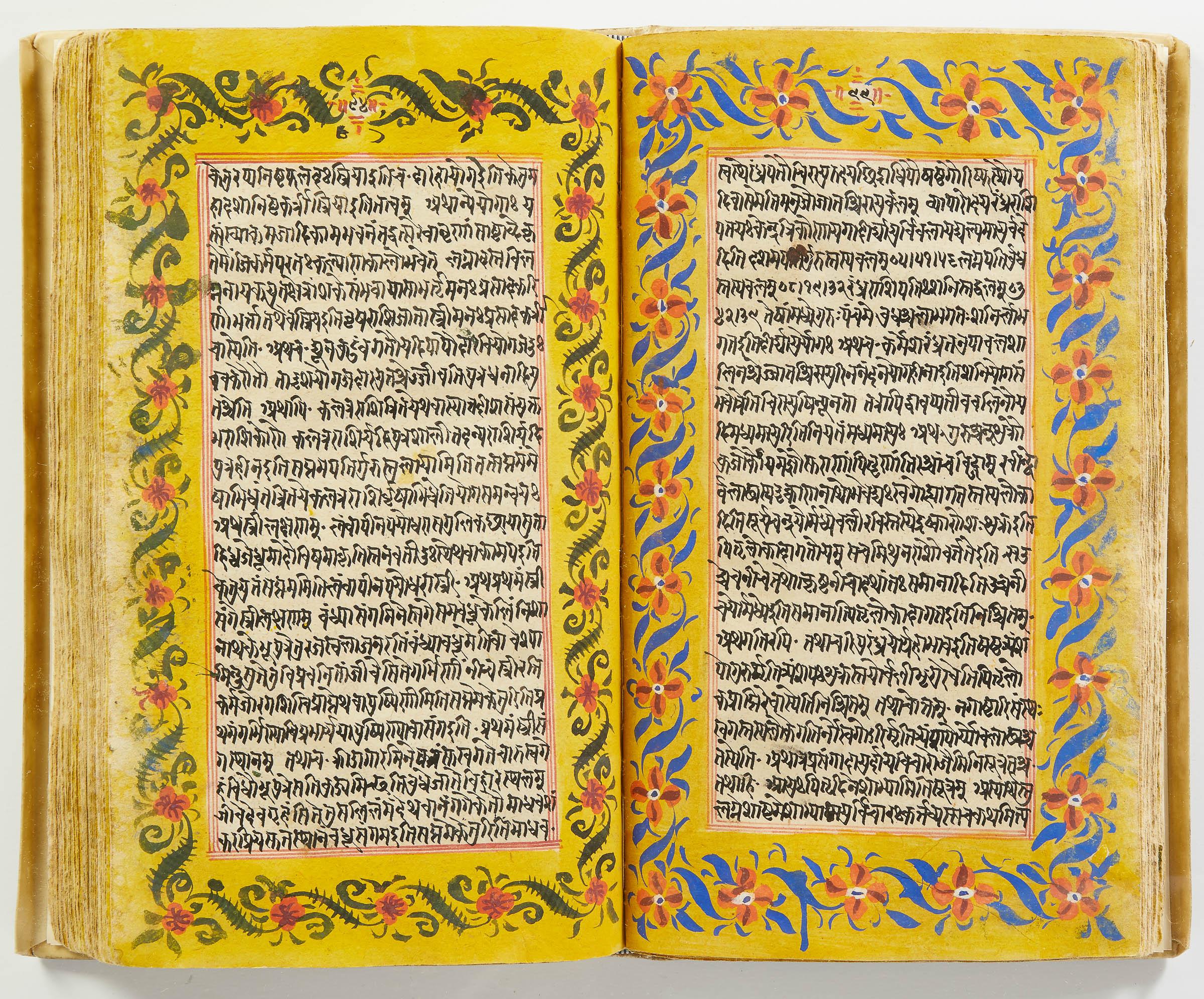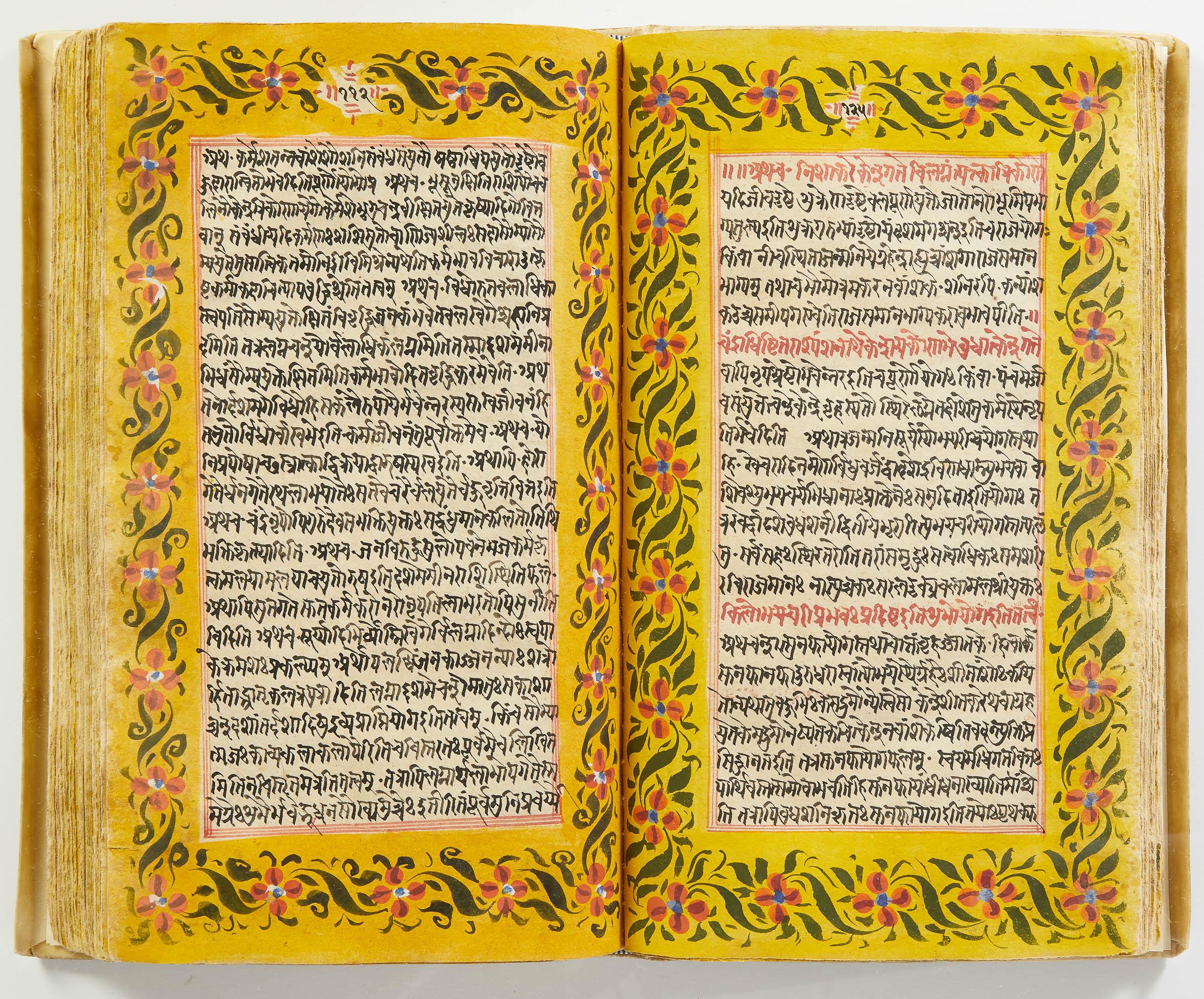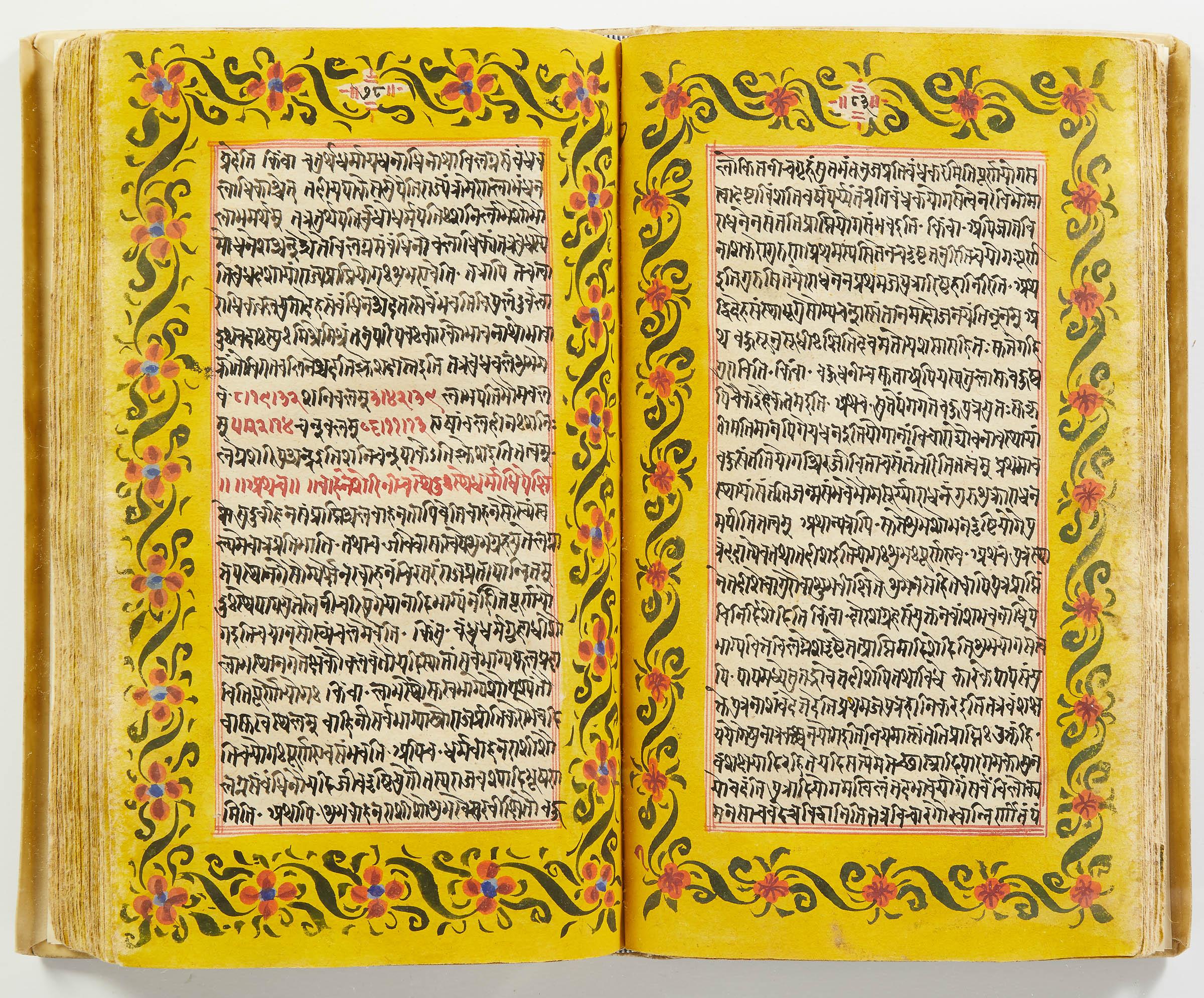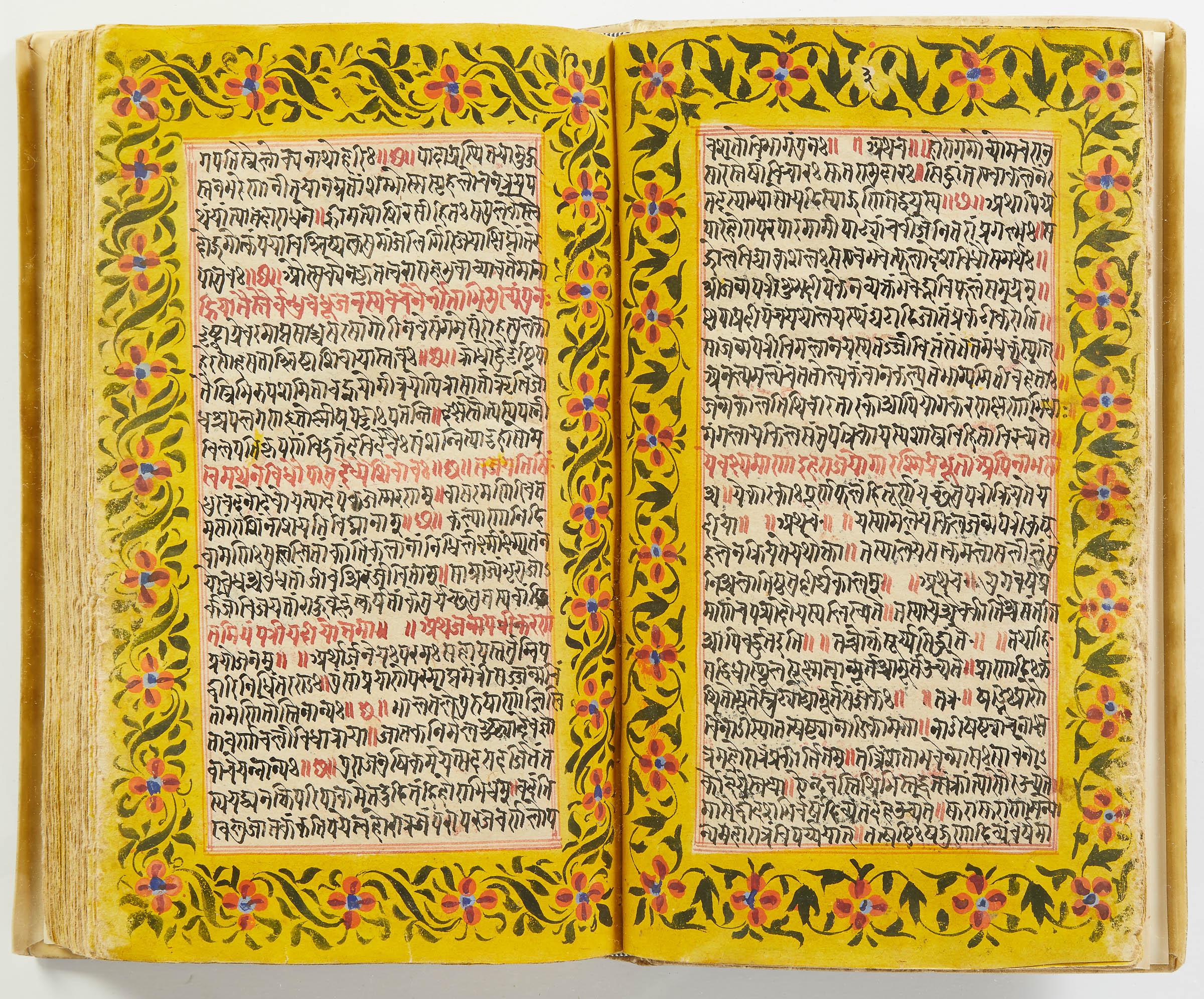 lluminated manuscript in Sanskrit on prepared paper, written in Devanagari script in black and red ink, with a profusion of tables and charts, partly in color, and floral border on each page of text. 101 leaves, the first 2 and last 3 blank. 326x187 mm,