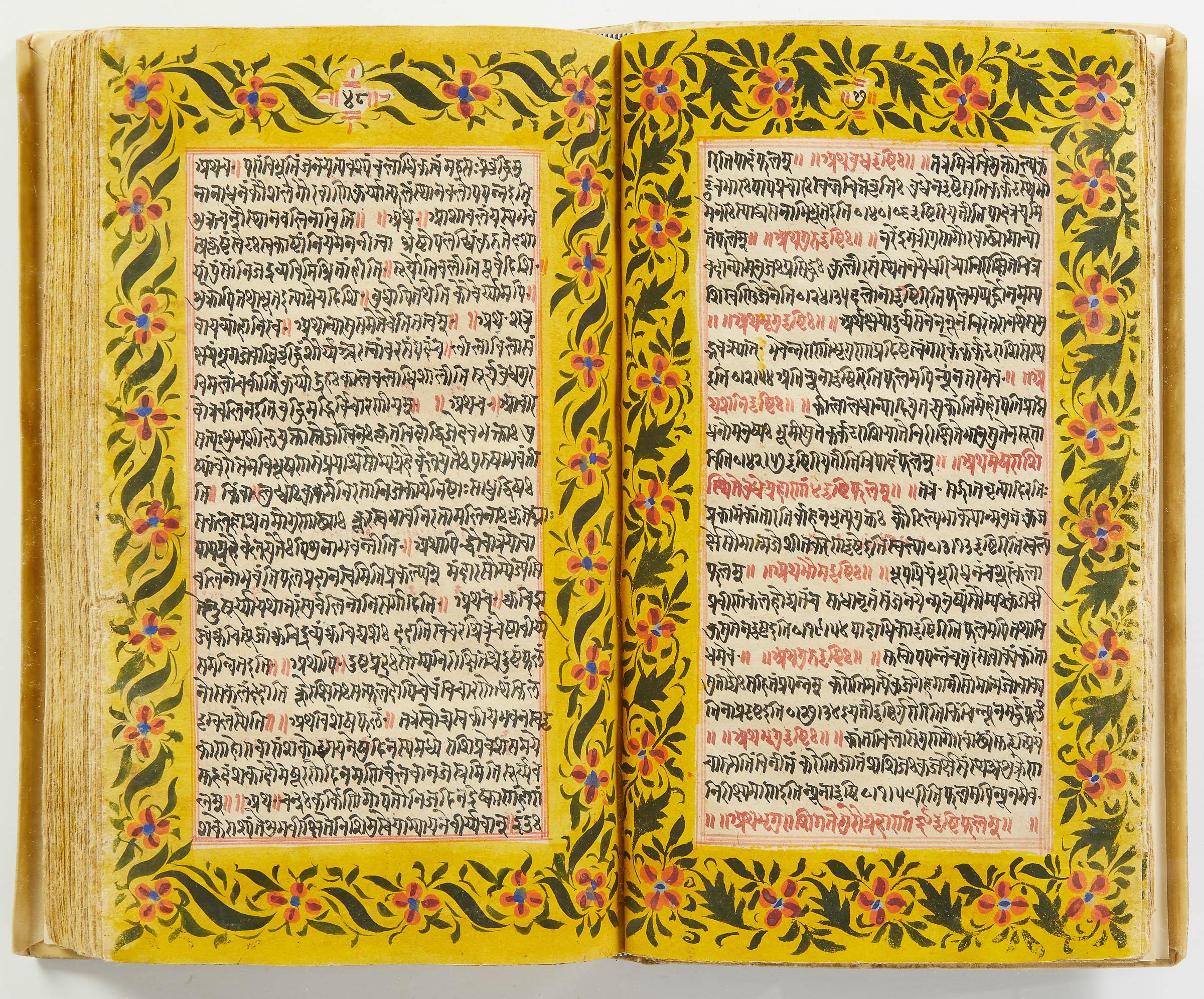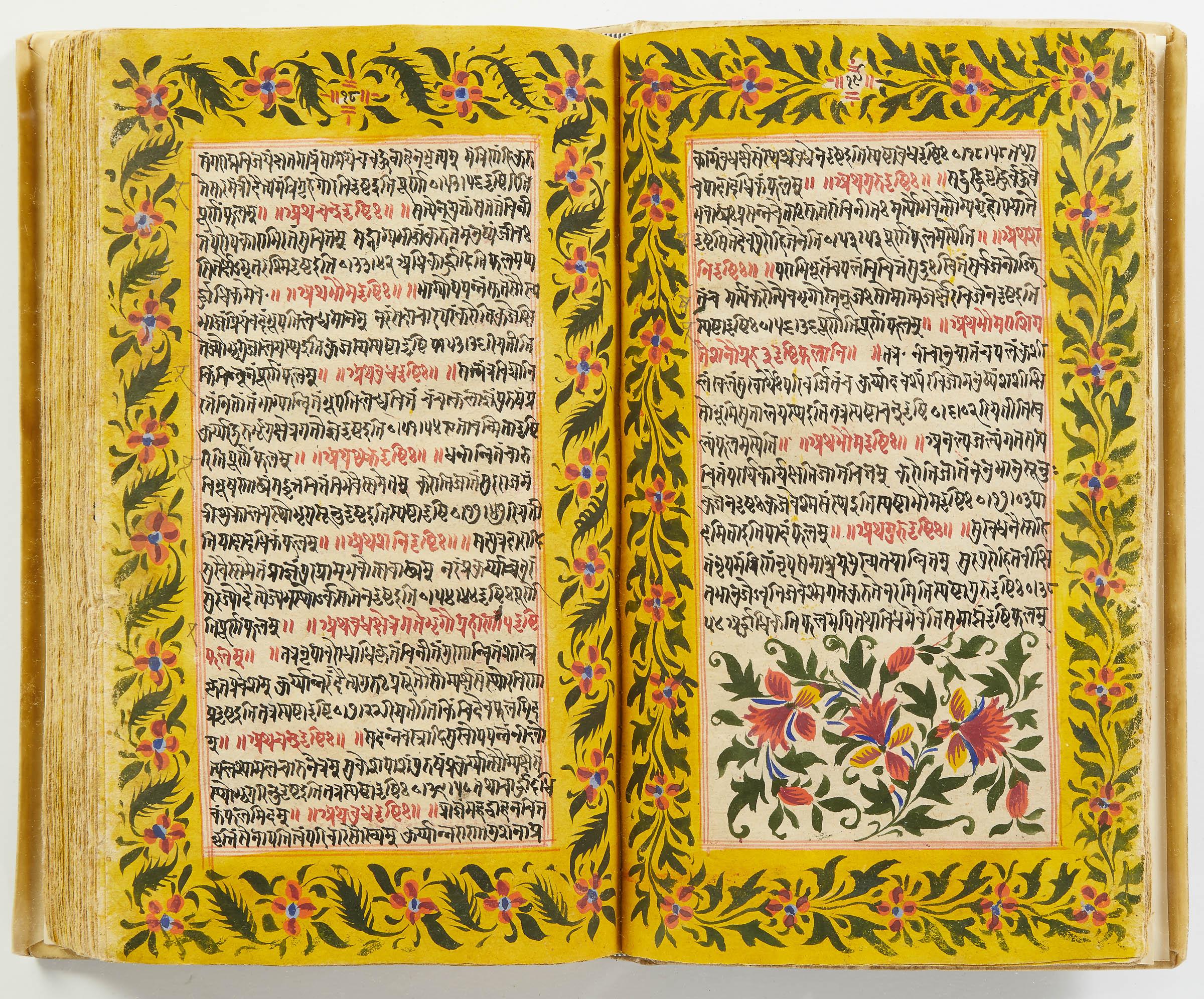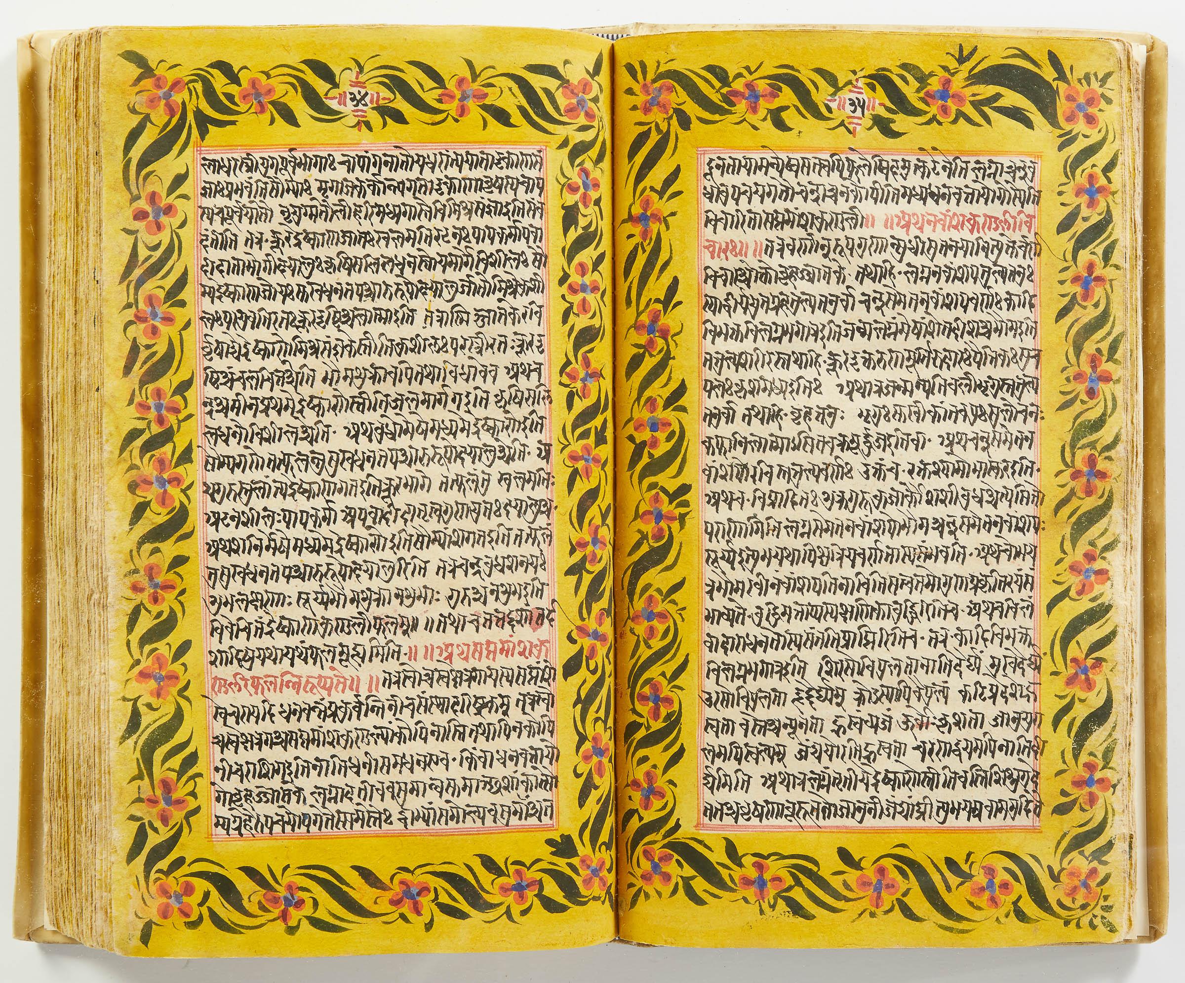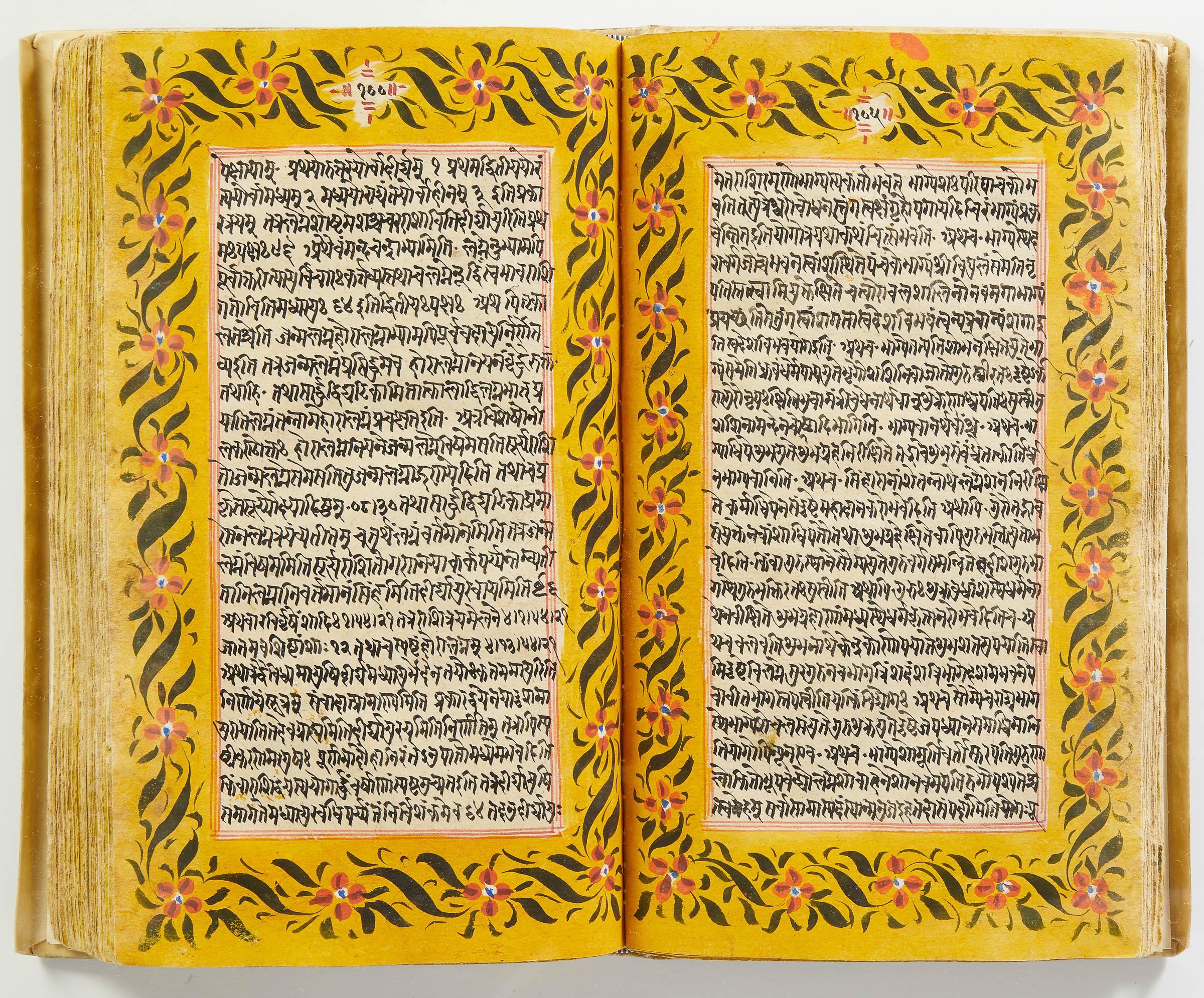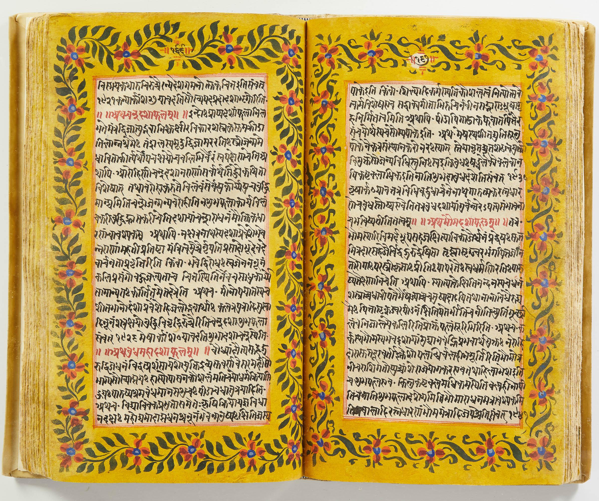 lluminated manuscript in Sanskrit on prepared paper, written in Devanagari script in black and red ink, with a profusion of tables and charts, partly in color, and floral border on each page of text. 101 leaves, the first 2 and last 3 blank. 326x187 mm,