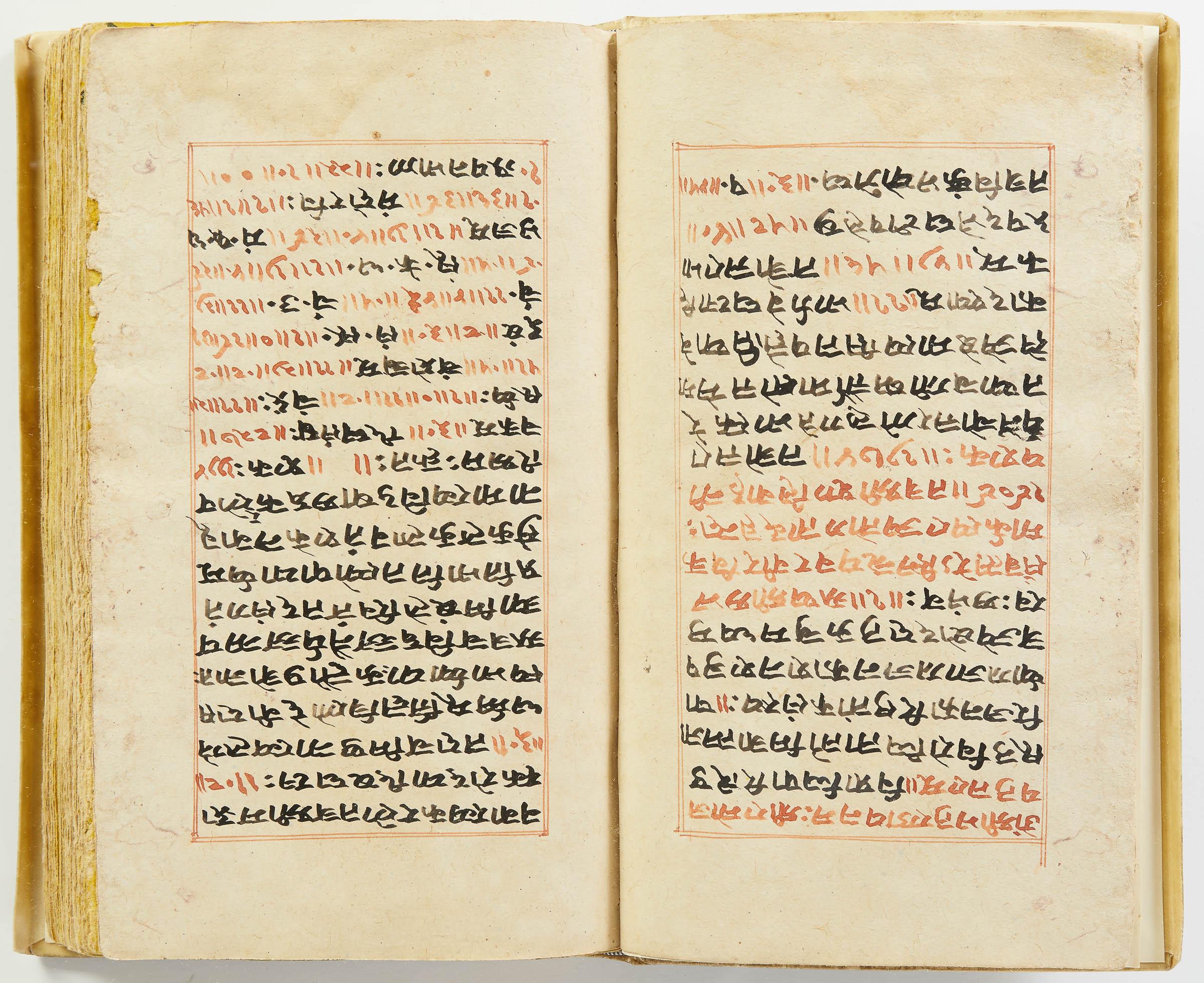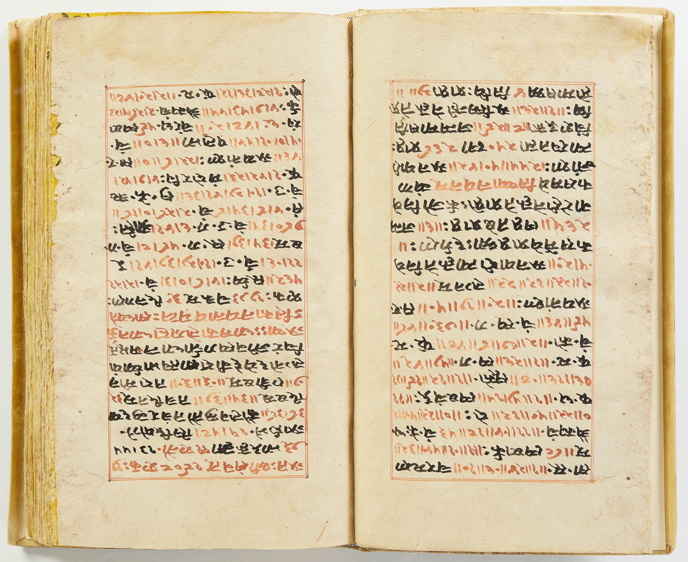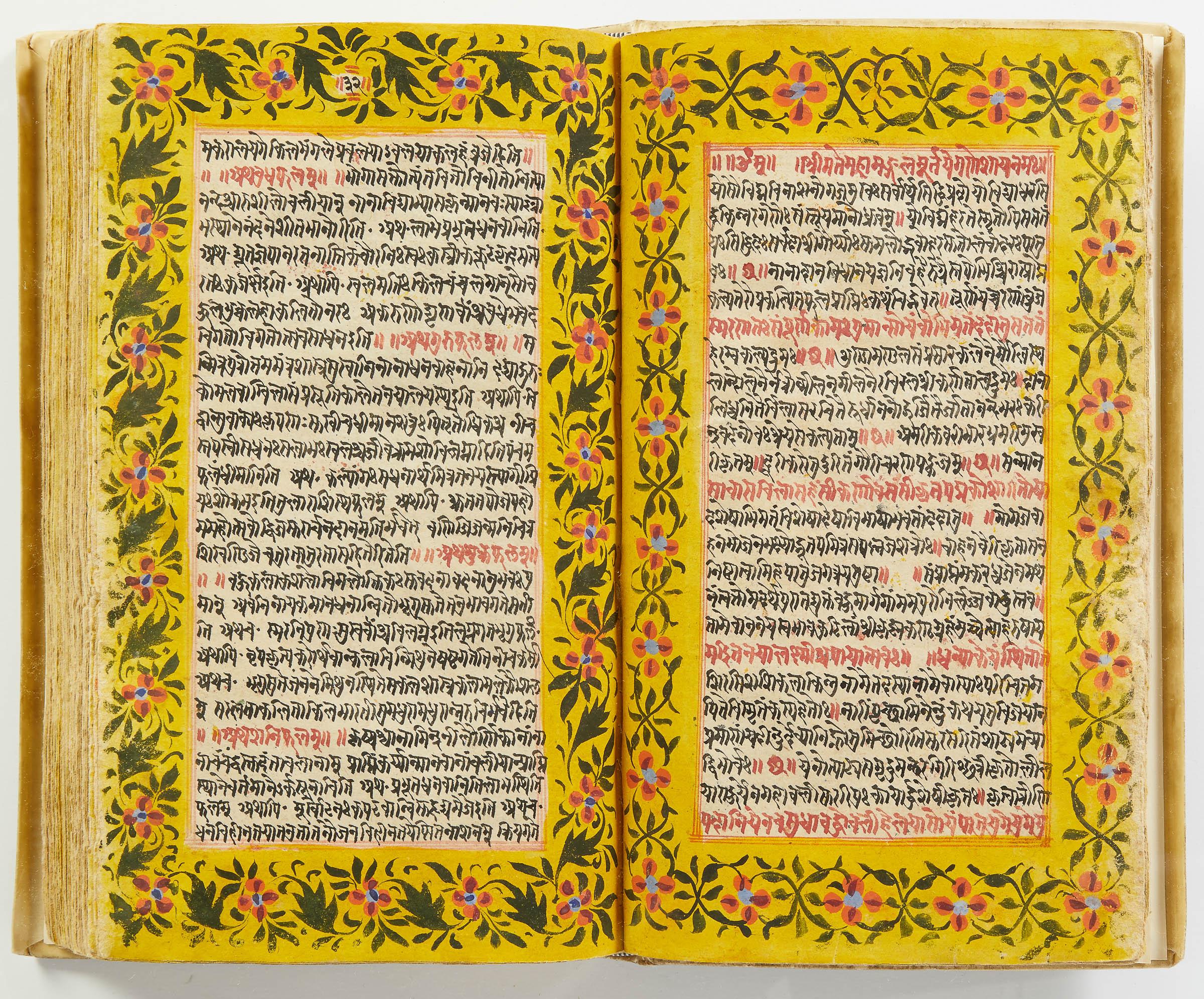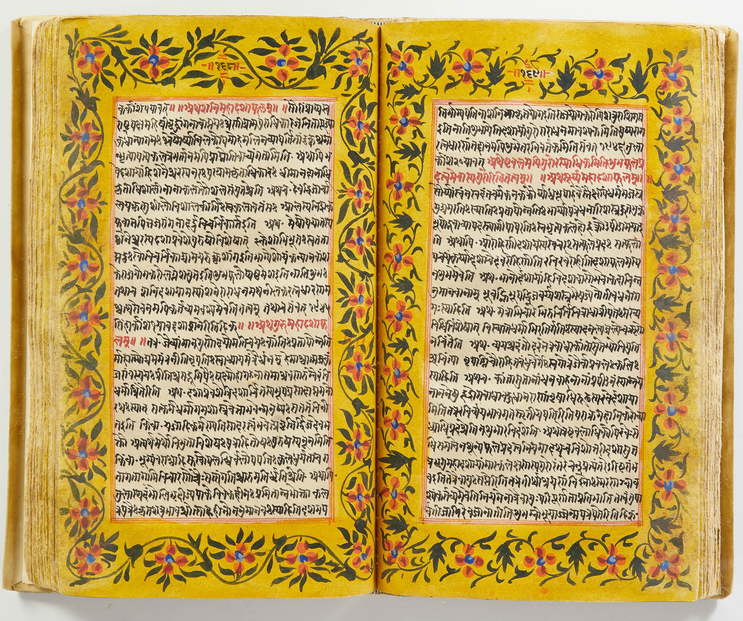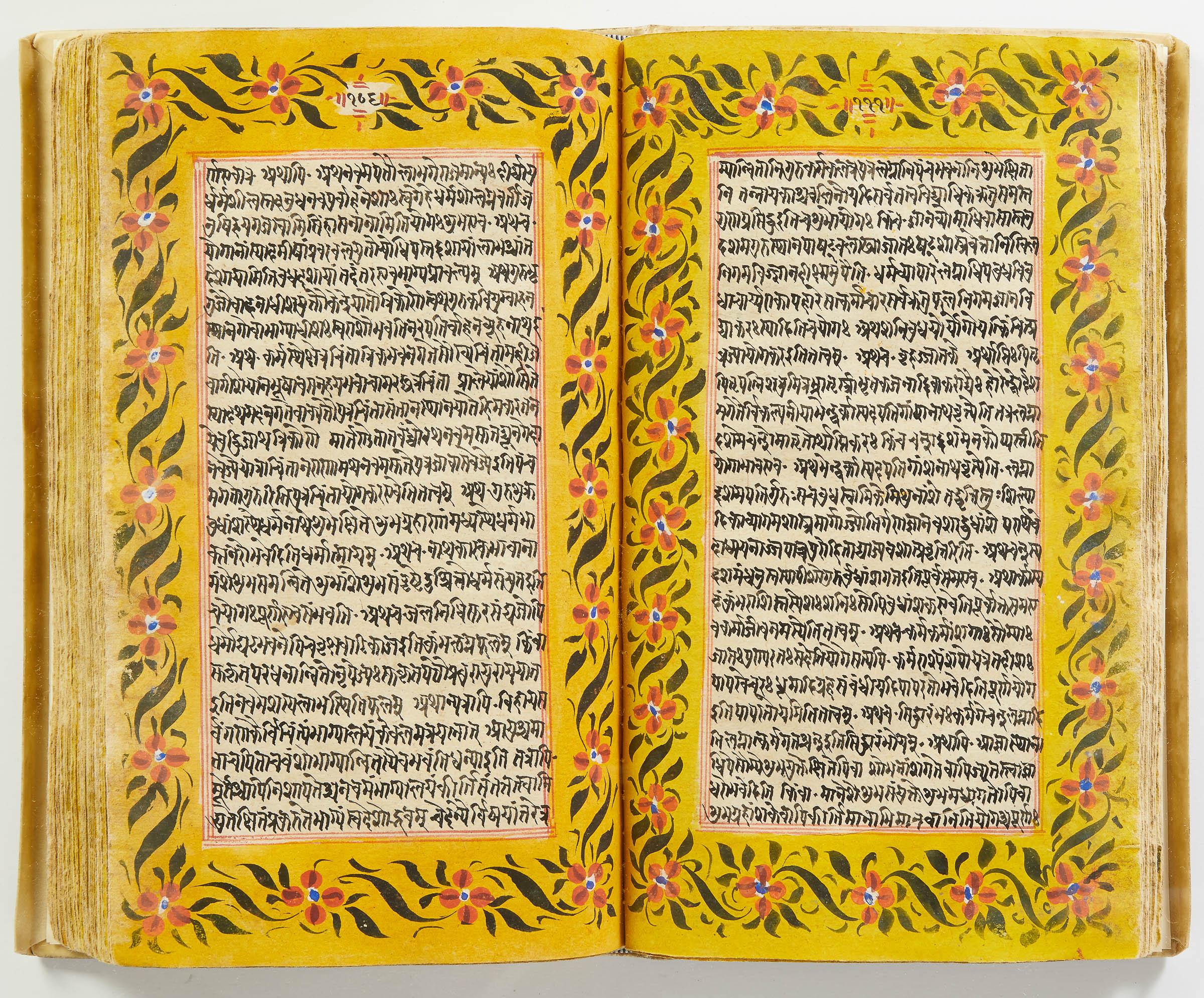 lluminated manuscript in Sanskrit on prepared paper, written in Devanagari script in black and red ink, with a profusion of tables and charts, partly in color, and floral border on each page of text. 101 leaves, the first 2 and last 3 blank. 326x187 mm,
