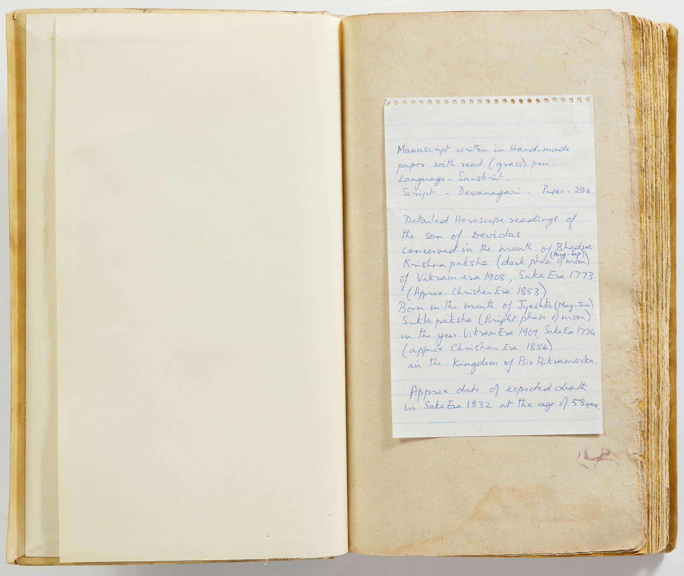 "Detailed horoscope readings of the son of Devidas conceived in the month of Bhadra Krishnapaksha (dark phase of moon, Aug.-Sept.) of Vikram Era 1908, Saka Era 1773. (Approx. Christian Era 1853.) Born in the month of Jyeshta (May-June) Suklapaksha (bright phase of moon) in the year Vikram Era 1909, Saka Era 1774 (approx. Christian Era 1854) in the Kingdom of Bir Bikramarka. Approx. date of expected death in Saka Era 1832 at the age of 58 years."