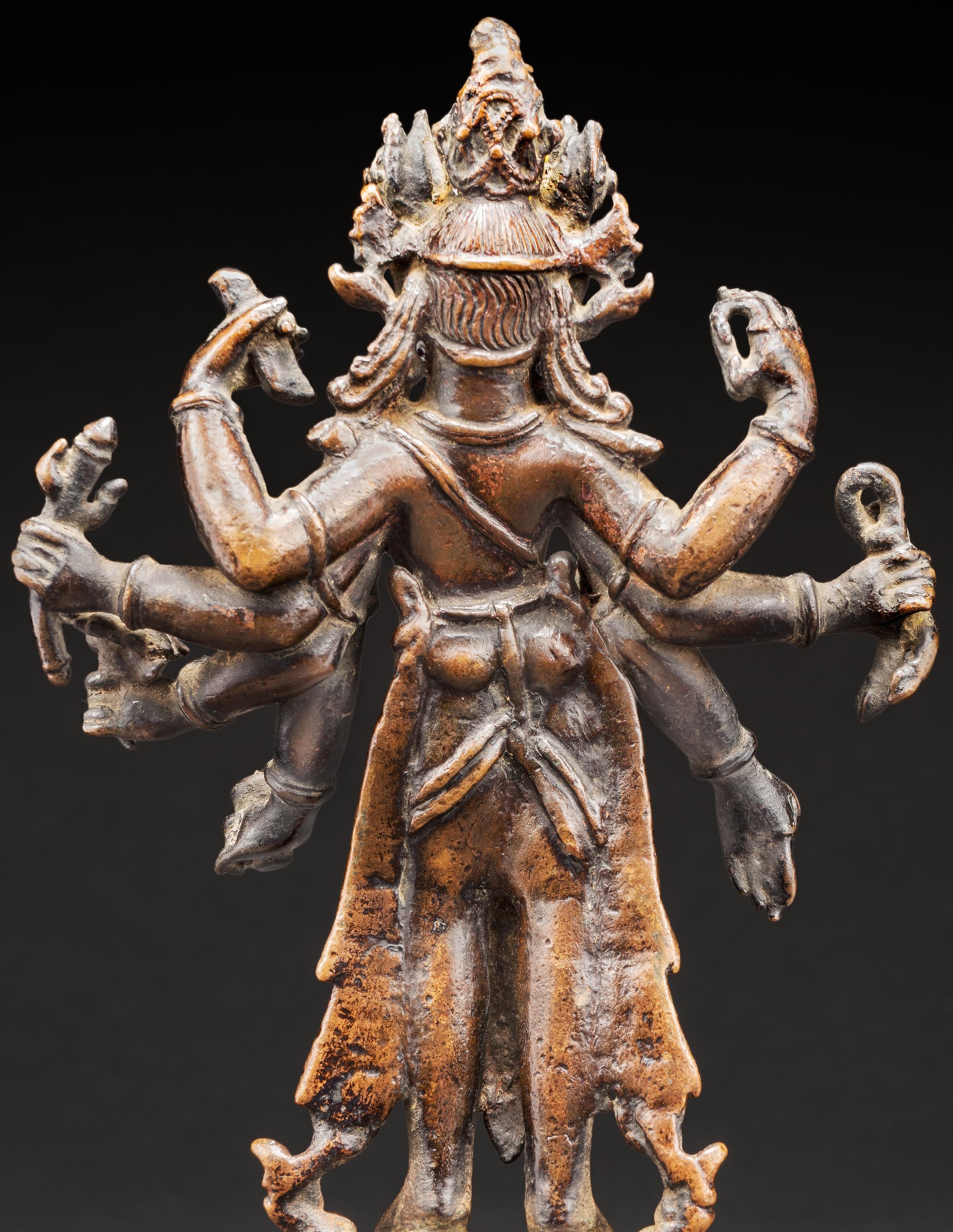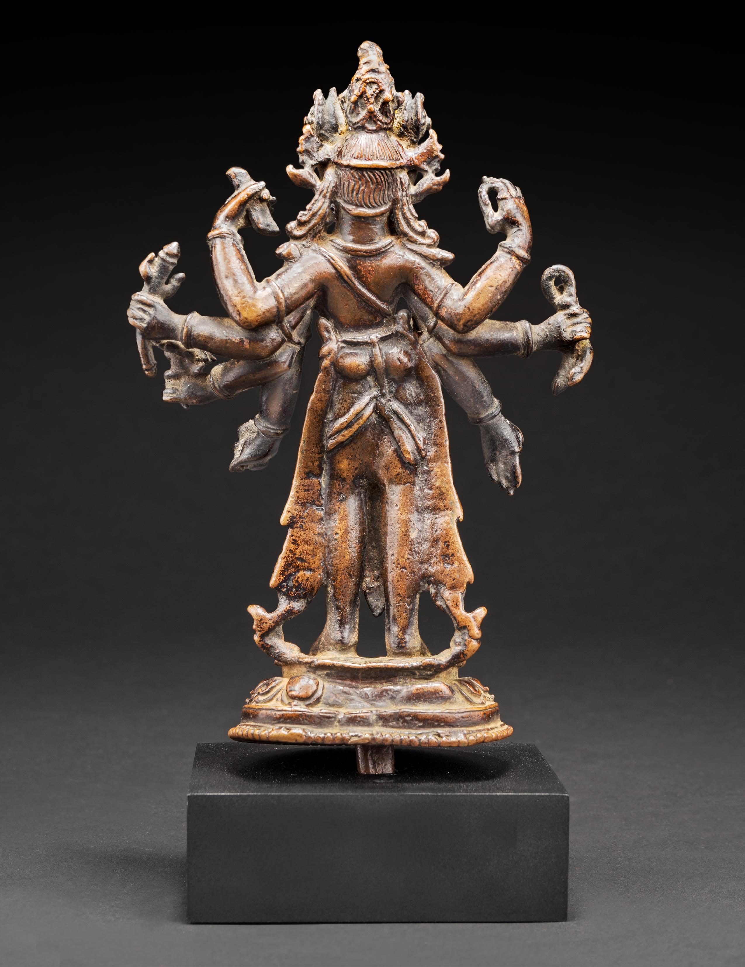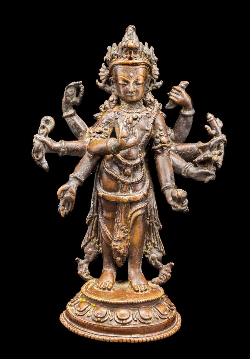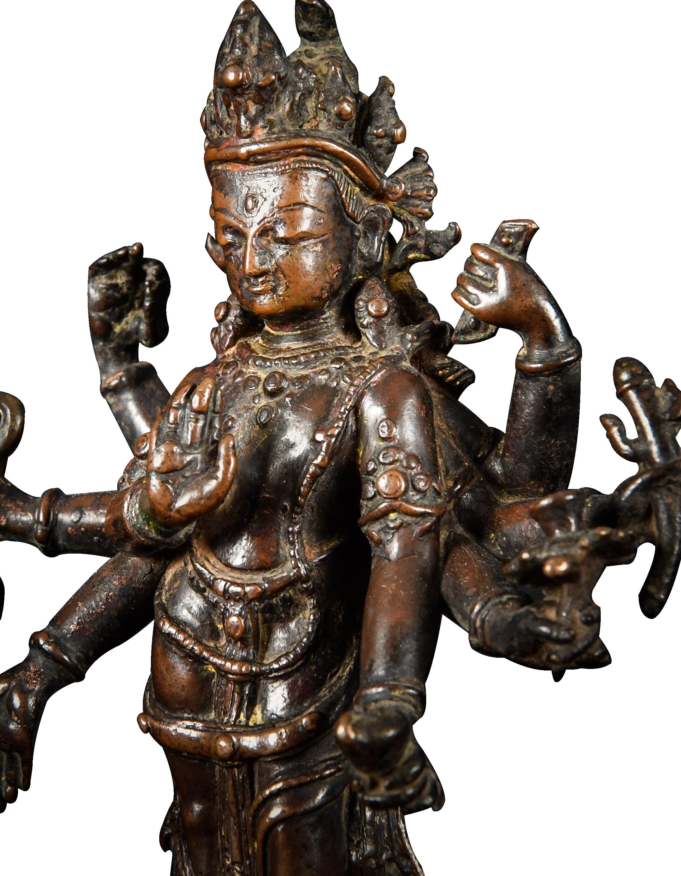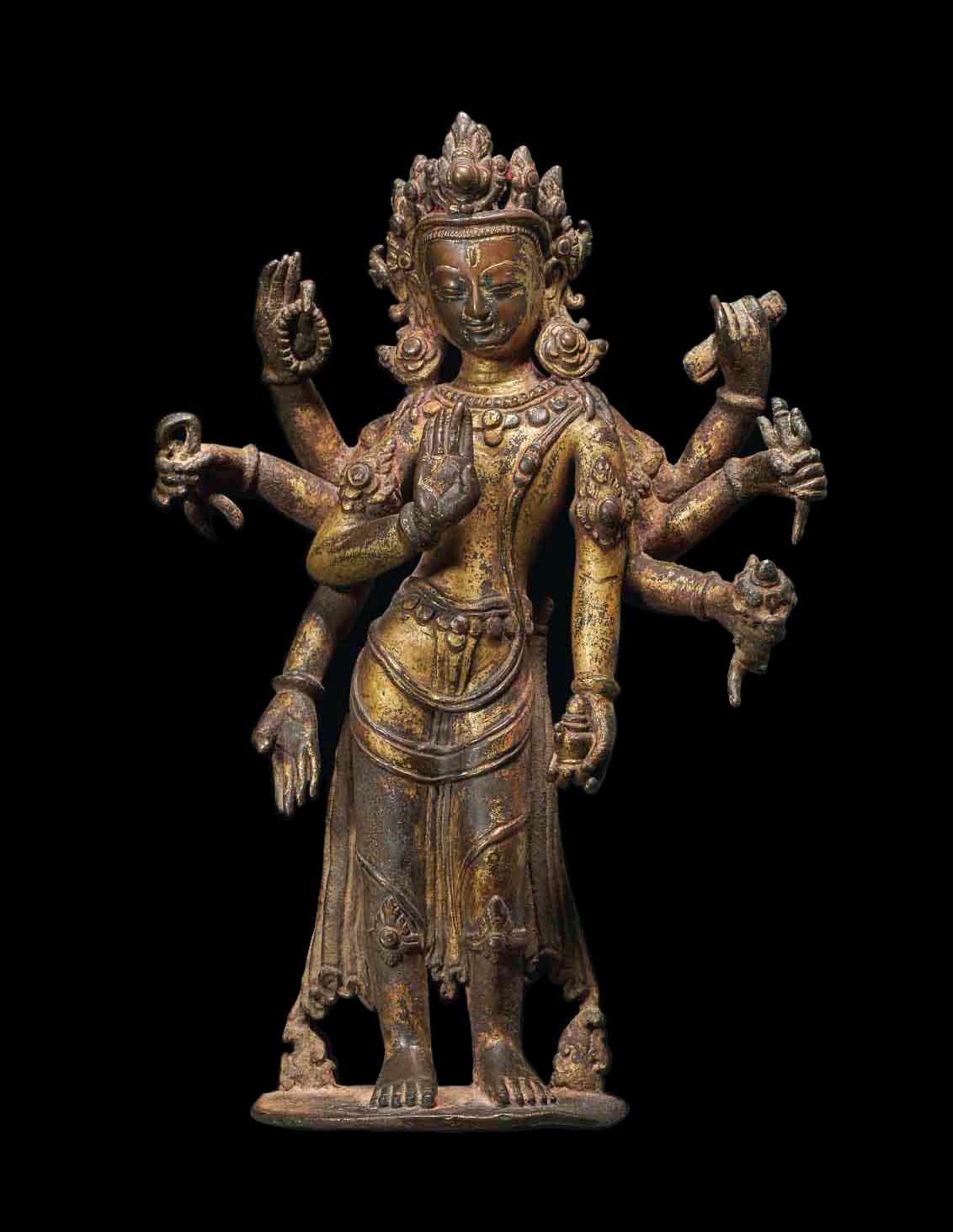 The present figure is representative of his standard iconography. The bodhisattva stands in a slightly flexed pose, his eight radiating arms holding a sutra, trident, lotus, kundika, lasso, and rosary. He displays the gestures of charity and teaching with his primary hands. His broad face is surmounted by a tall crown secreting a diminutive effigy of Buddha Amitabha nestled in his chignon.