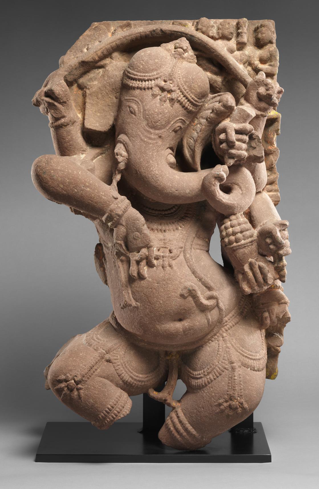 Among the large number of sandstone sculptures within this stylistic milieu, images of Bhairava are incredibly rare and his dancing form, moreso. The best collection of comparable examples of fine sandstone figures from medieval Madhya Pradesh reside at the Rani Durgavati Museum, in Jabalpur (a city in the state of Madhya Pradesh). However, a number of equally-fine examples have made their way to American museums, such as a tenth-century figure of Shiva at the Norton Simon Museum (see Fig. 1). This sculpture displays nearly identical style of ornamentation to the present Bhairava: see the two heavy necklaces with a pendant between them on the chest and an elaborate belt with beadlike decorations suspended in the form of multiple loops that fall naturally from the waist and across the thighs. A tenth-century sandstone sculpture of Ganesha at the Metropolitan Museum of Art displays a very similar yajnopavita in the form of a serpent (see Fig. 2), as well as the same festooned belt. Moreover the soft bellies of each of these masterworks mirrors that of dancing Bhairava who displays an equally lifelike posture, animated by his mid-motion pose.