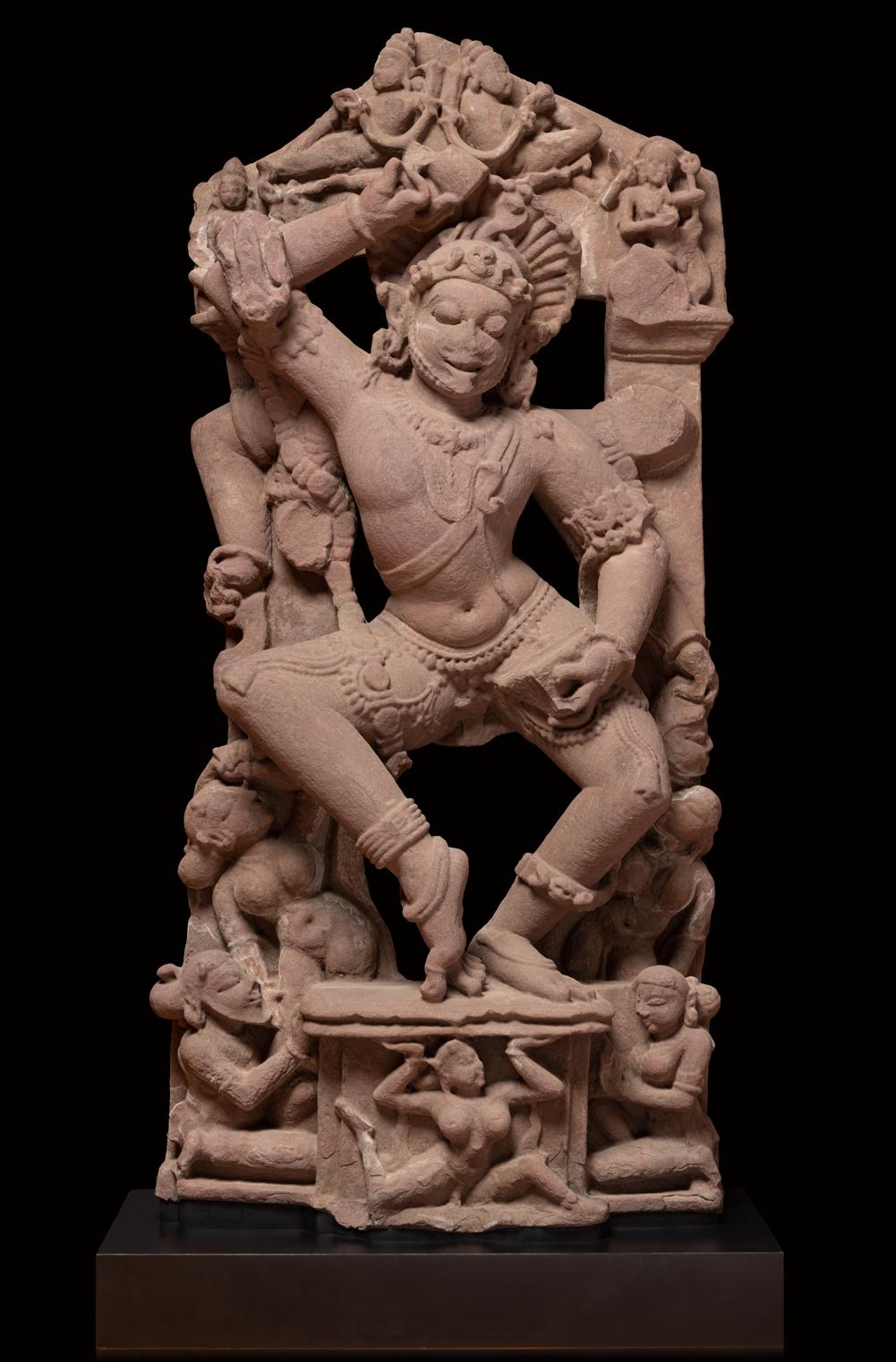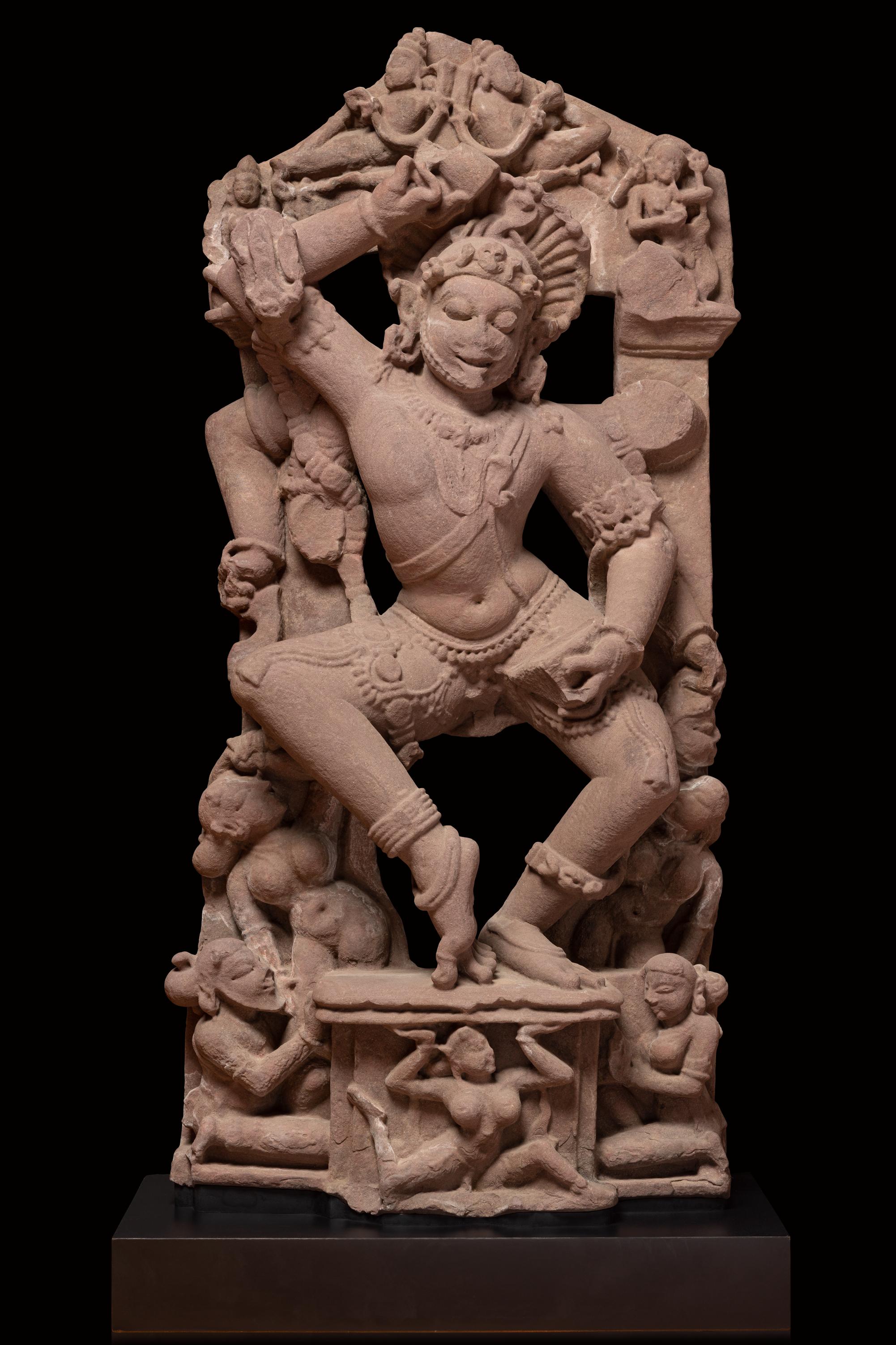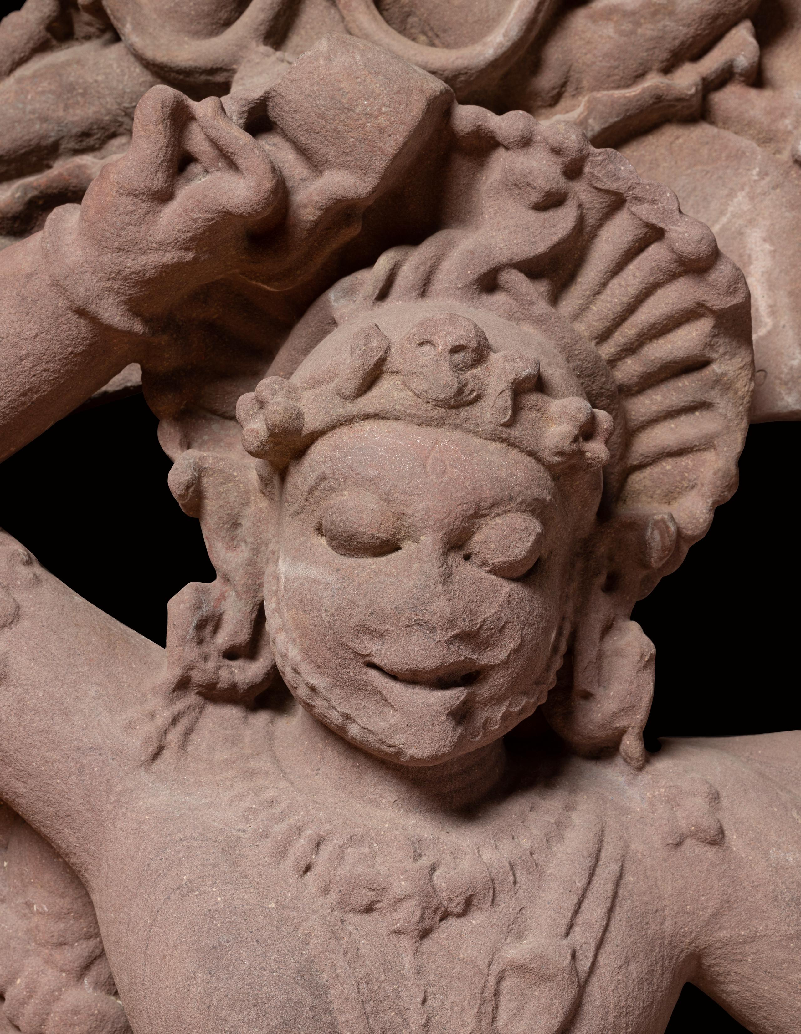 Shiva takes on this form to wander the world with a begging bowl after cutting off the arrogant Brahma’s fifth head, which dangles from his lower right arm in the present sculpture. This ferocious form is typically depicted with six arms; the two arms that are missing from the present example would wield a vajra and a noose. Manasa Devi, goddess of serpents, and the fearsome form of Parvati, Chamunda, are depicted to the left and right of Bhairava’s head, respectively. Attendants admire him from below and an apsara supports the pedestal he dances on. A serpent rears its head atop his proper-left breast and appears to wrap around his torso like the standard sacred cord or yajnopavita. The garland that falls naturally around his proper-right limbs was once a series of stylized skulls. Though it has lost definition over many centuries of weathering, the portion of the garland that wraps around his proper-left calf remains defined.