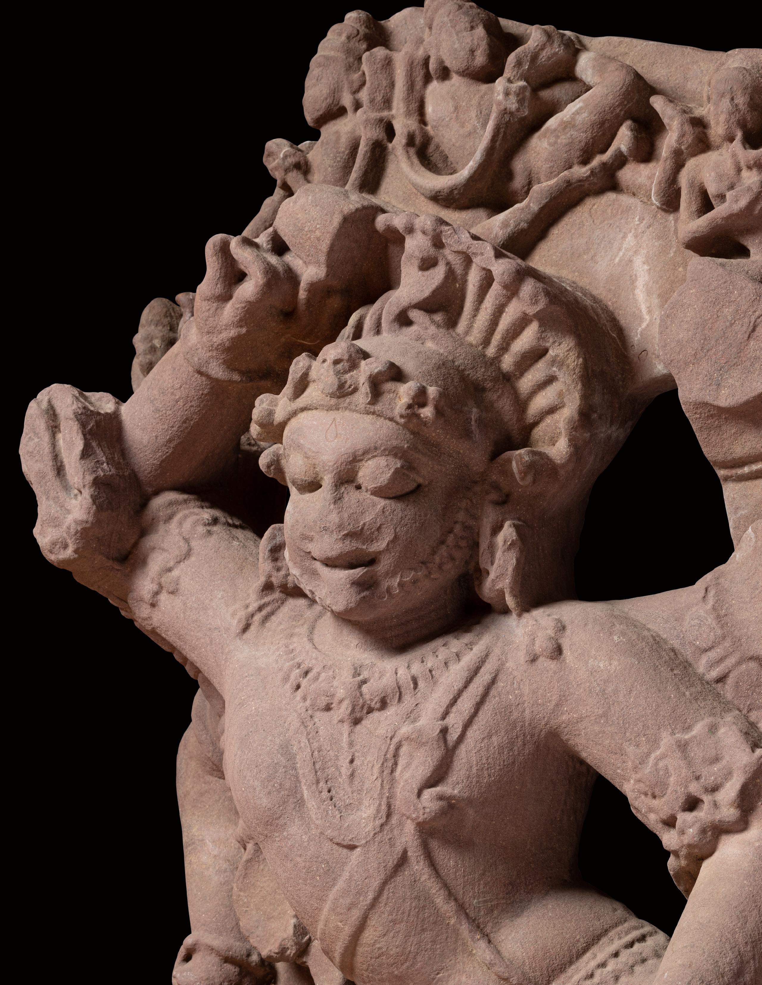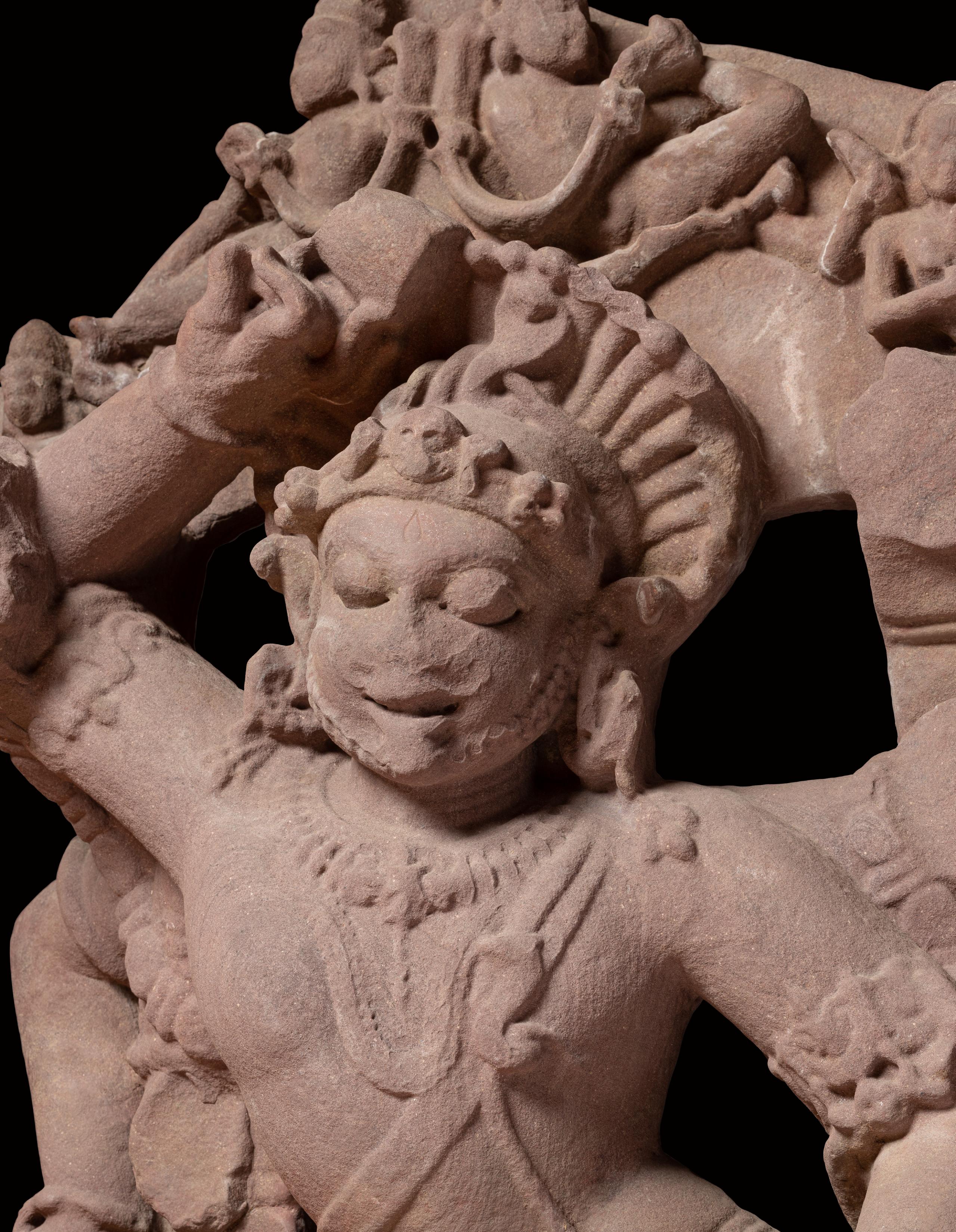 The vibrant sensibility of this sculpture mirrors those of the most famous temples of Madhya Pradesh at Kajuraho where figures are voluptuous and much more naturalistic than the temple sculptures of the Gupta and post-Gupta periods. The eastern portion of the Vindhya mountain range of Madhya Pradesh is composed of sandstone and shale, providing ample material for sculptures such as the present, which may have adorned a temple made of almost entirely sandstone.