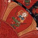 During Hevajra mandala practices one generates an image or experience of themselves as the tantric deity Hevajra in their minds eye and the syllable HUM radiating from their heart’s center. From there one projects the nine-deity mandala of which this goddess is a part. Dombini is one of eight female goddesses that surround Hevajra. One imagines that offerings are made by these goddesses who issue from the HUM.