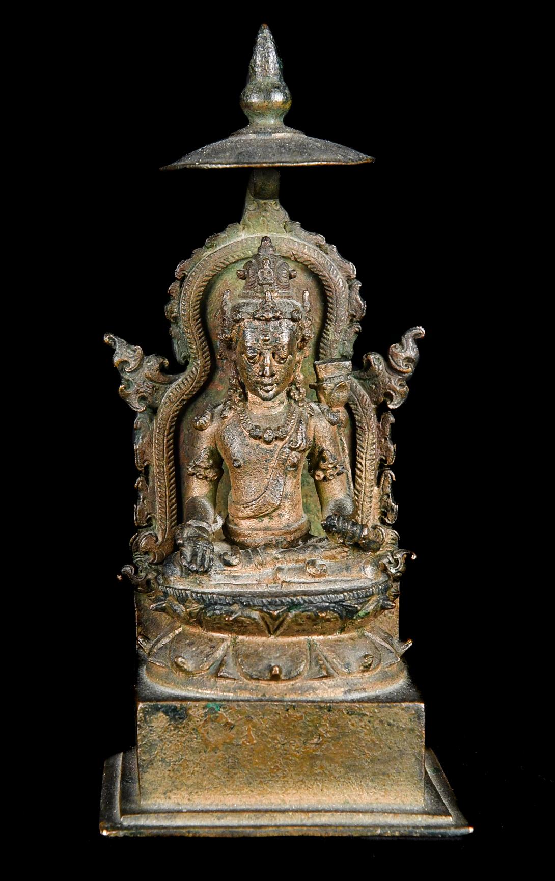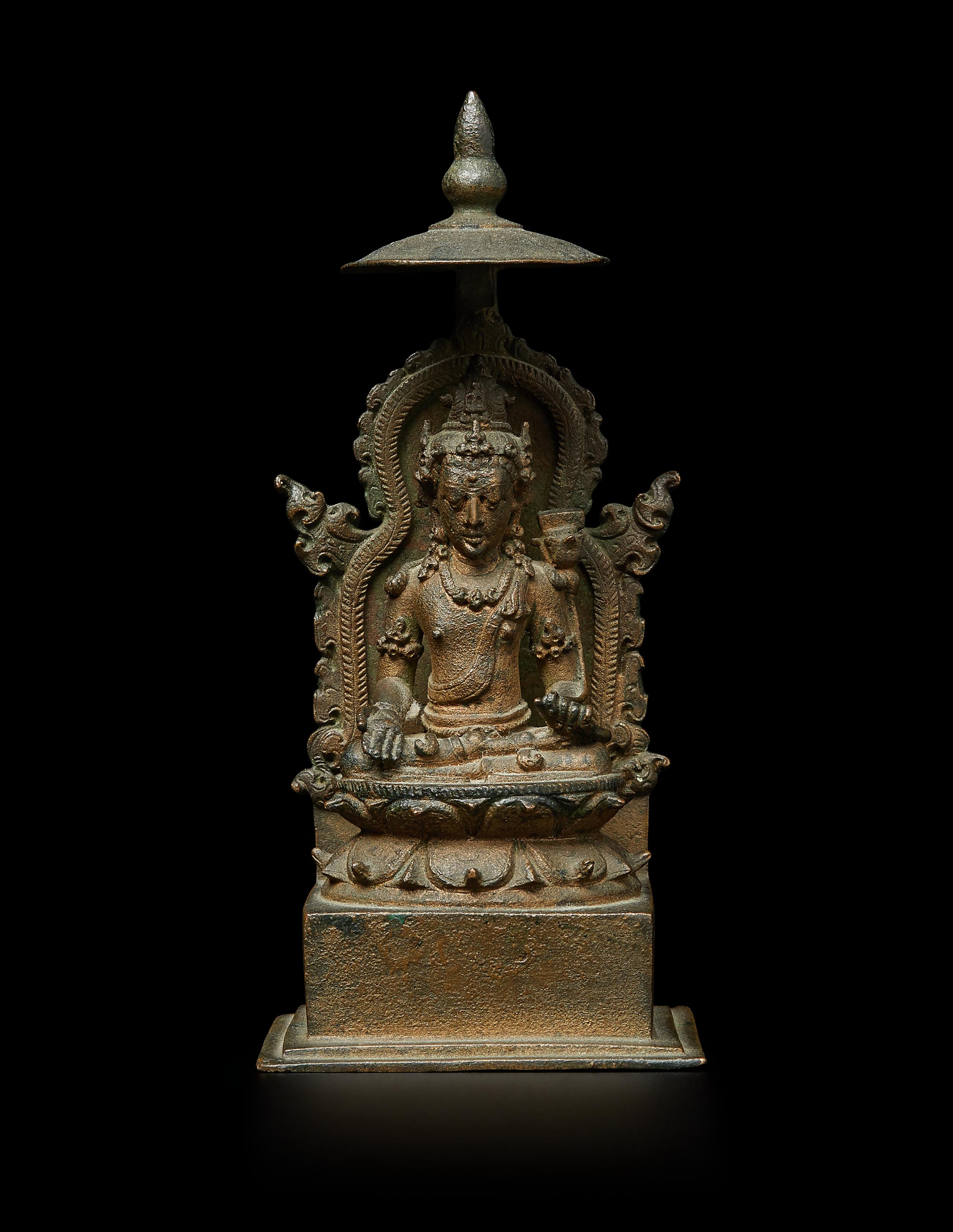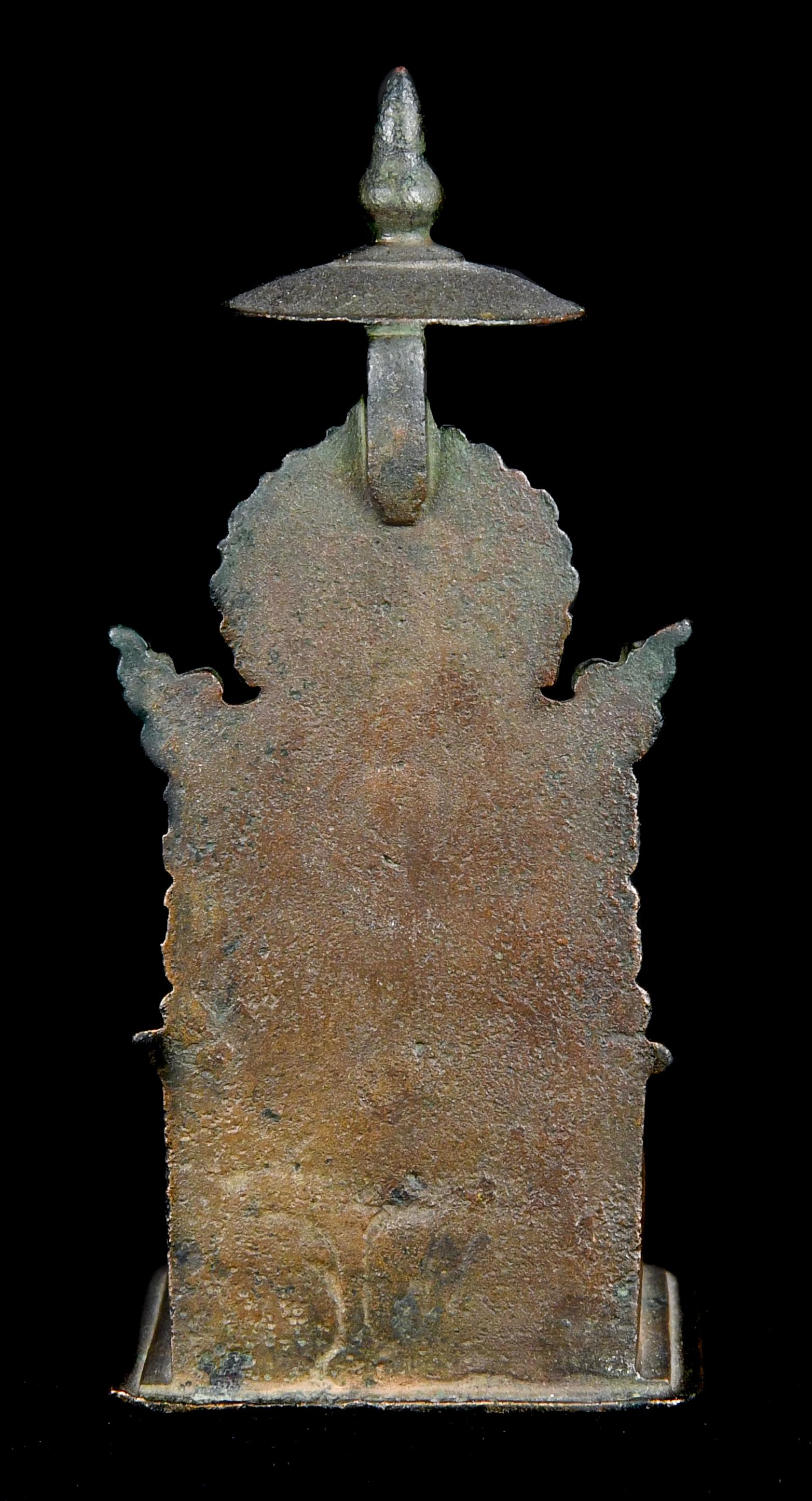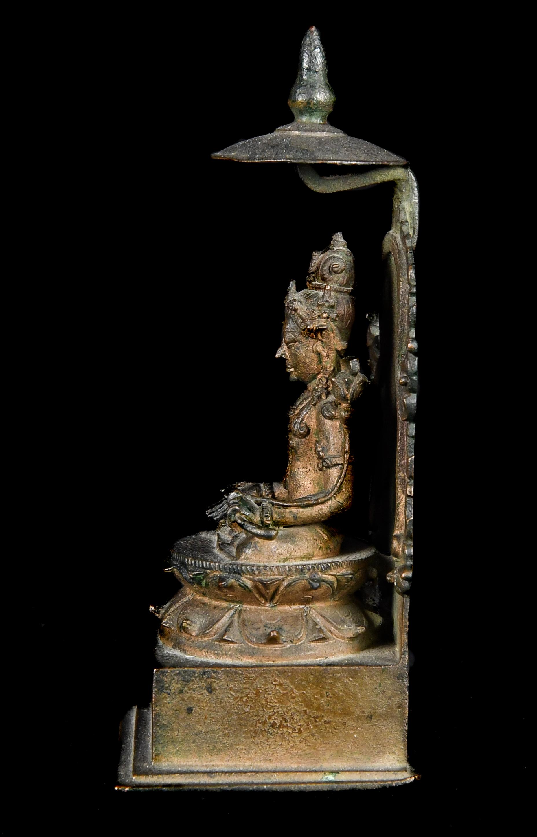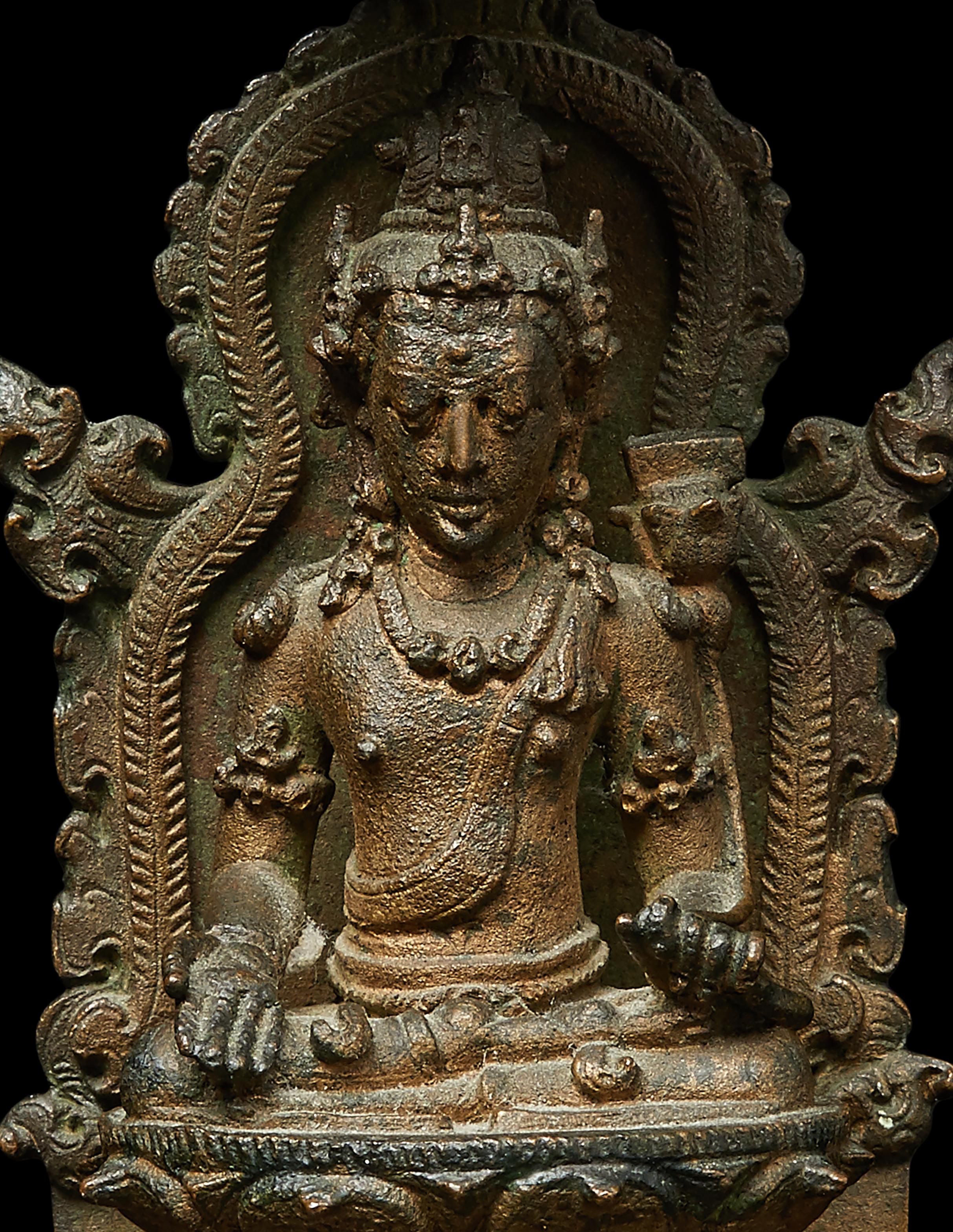 Despite the small size of this bronze, the details are exquisitely executed. The negative space behind the bodhisattva’s back is a difficult feat of casting which indicates the work of a highly experienced artist. Compare the sash-like sacred cord, foliate arm bands, curled hair tendrils, heavy eyelids, flaming aureole, rounded canopy, and bodily proportions to a very similar bronze figure of Shri Devi dated to the ninth century in the Metropolitan Museum of Art (acc. 1987.142.219).