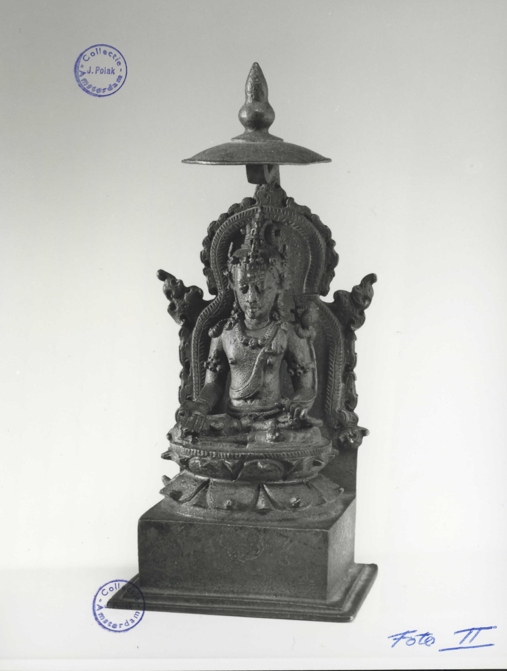 Esoteric Mahayana Buddhism was well grounded in the Indonesian archipelago by the seventh century, largely due to the influence of maritime trade. The religious text atop the lotus at the figure’s proper left as well as the figure’s vajrasana posture and the effigy of a buddha within the ornamented chignon identify this figure as either Manjushri or Avalokiteshvara. The bodhisattva was likely part of a larger set, as many small Javanese bronzes are. The influence of southeastern In- dian and Sri Lankan art is especially apparent in the early stages of artistic development in central Java from which this came.
